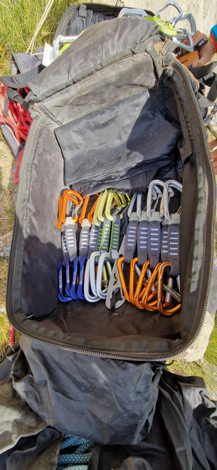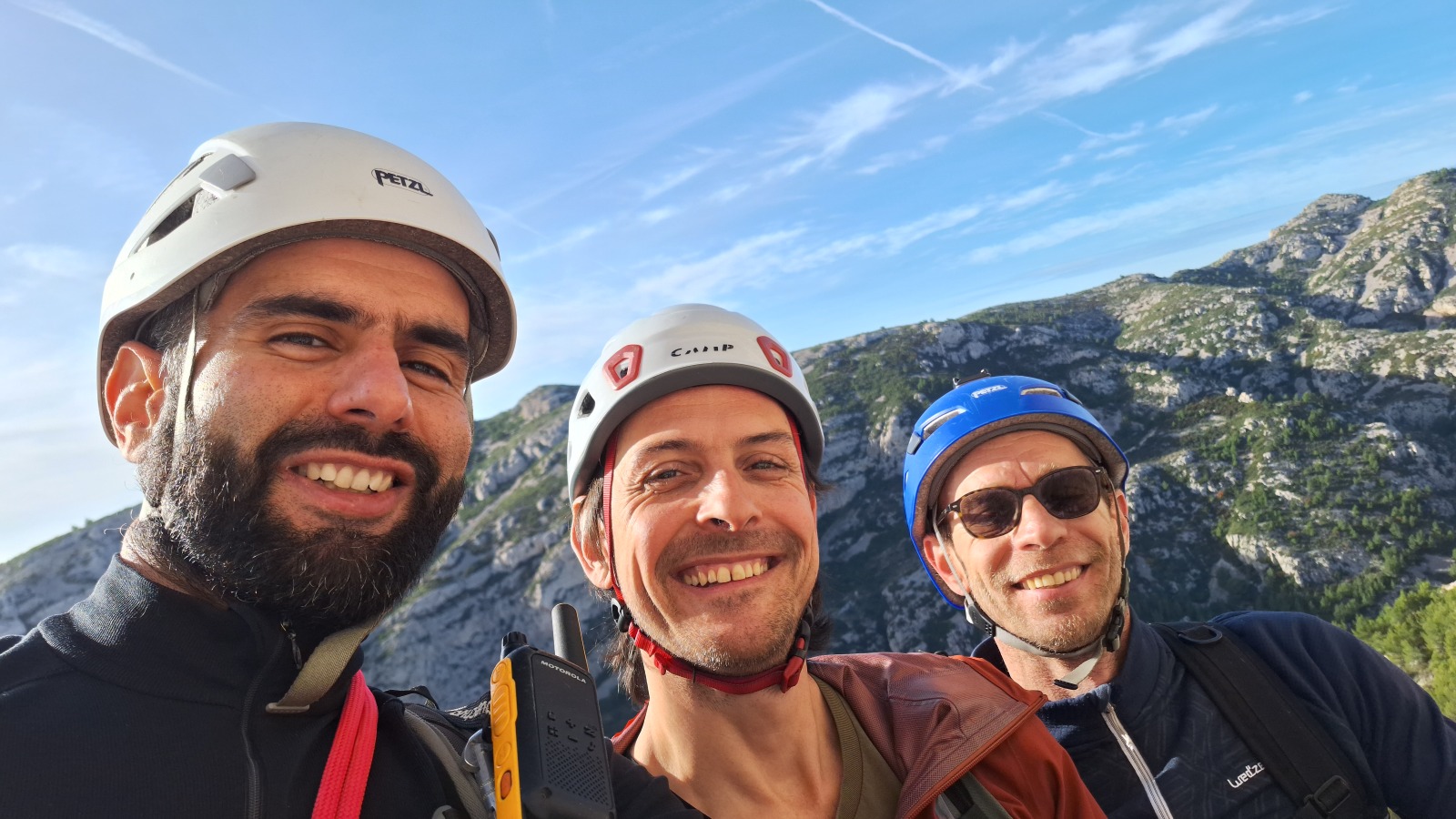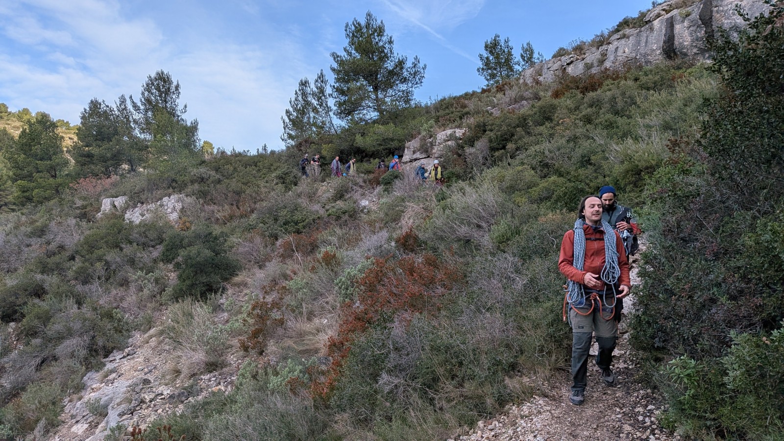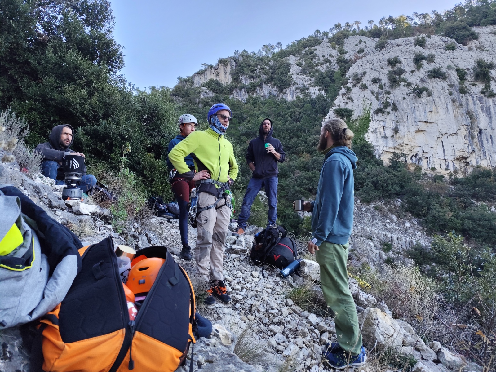 Nous sommes donc 12 sur le parking d’Aiglun à 9h, sans trop de retard malgré un réveil râté de JP. Ju a récupéré le matos la veille et s’occupe de la distribution. Maintenant, la plupart des grimpeurs ont leur matos à quelques détails près, hormis Mattieu L. qui s’est incrusté depuis le cycle élargi, profitant de l’absence de certains. Pour lui, c’est une grande première, et quelle première !