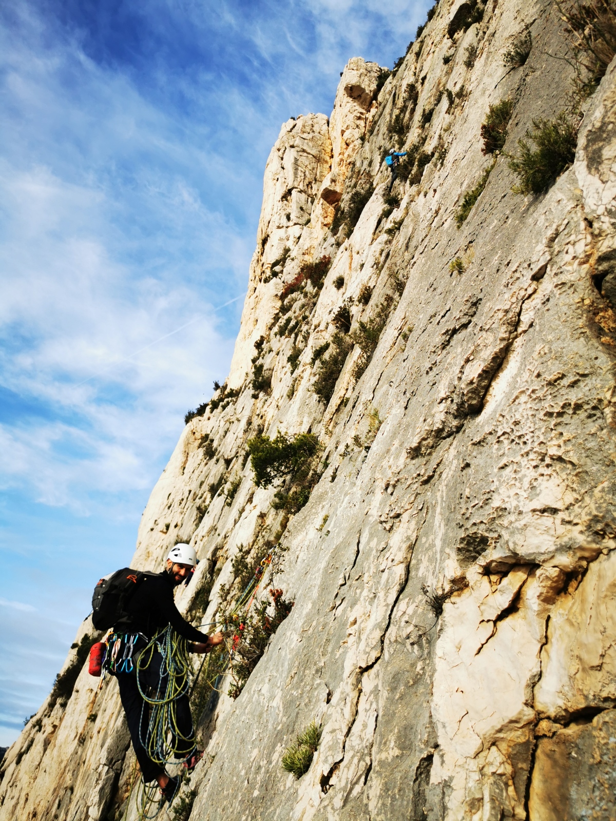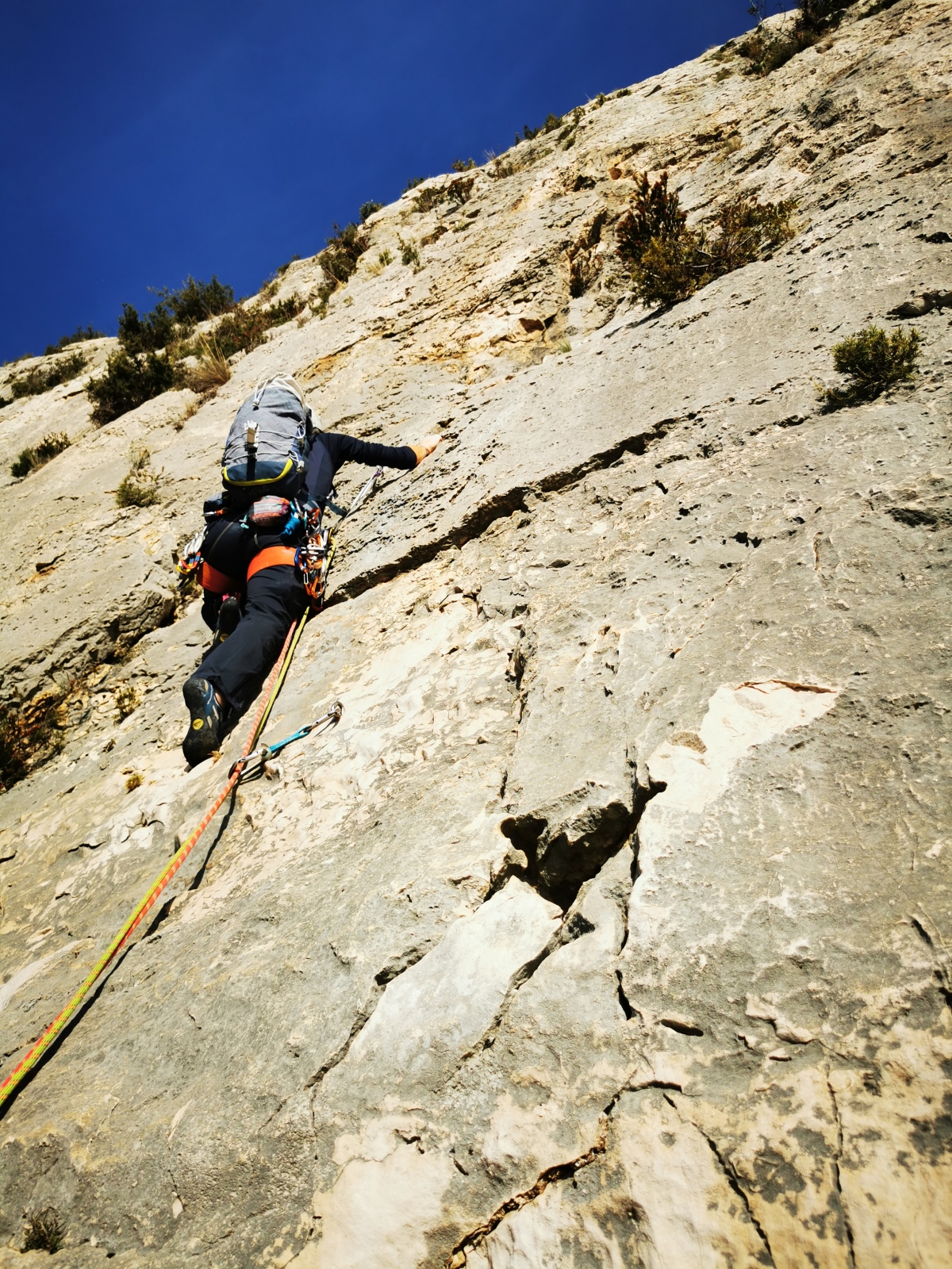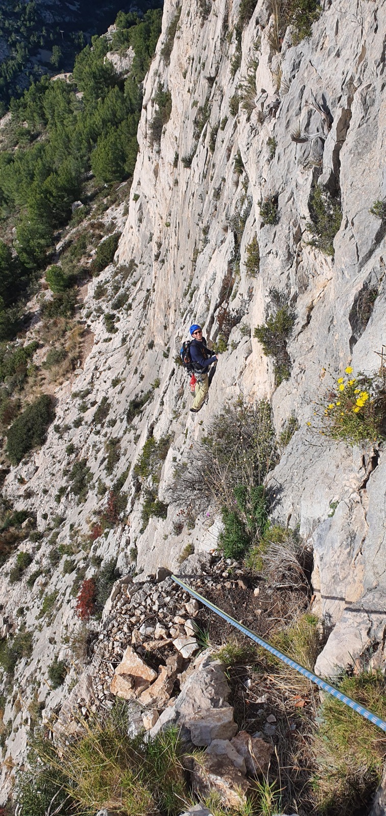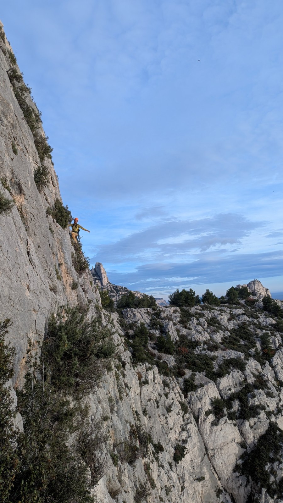 L’objectif premier était de parvenir à sortir avant la nuit. La première longueur étant commune, il s’agissait d’être efficaces tout au long de la journée et particulièrement sur le départ. Je laisse donc les groupe finir de se préparer en toute confiance et j’attaque avec ma cordée la marche d’approche d’une grosse vingtaine de minutes. Il fait un peu froid mais la paroi prend déjà le soleil. Comme toujours en cette période, il s’agit de composer entre prendre plein de vêtements pour être sûr de ne pas avoir froid et le poids du sac. Je penche vers un sac plutôt léger car il ne semble pas y avoir du vent et aucun nuage n’est prévu. Arrivé au pied de la paroi, après avoir cherché quelques minutes le départ bien caché, je range la couche thermique au fond du sac et ce sera t-shirt jusqu’au sommet !