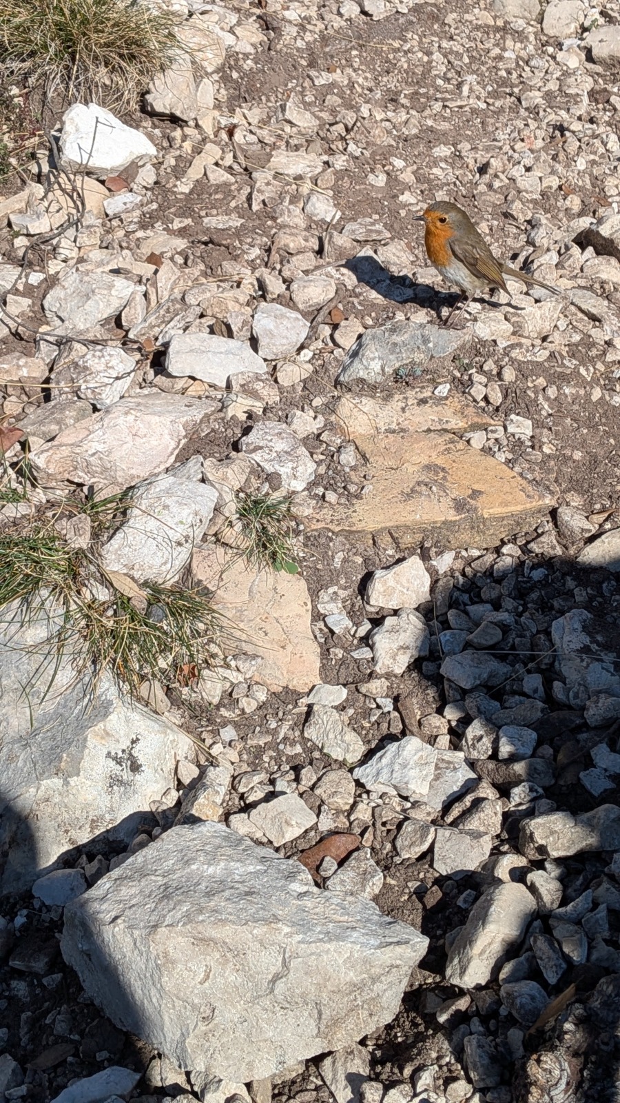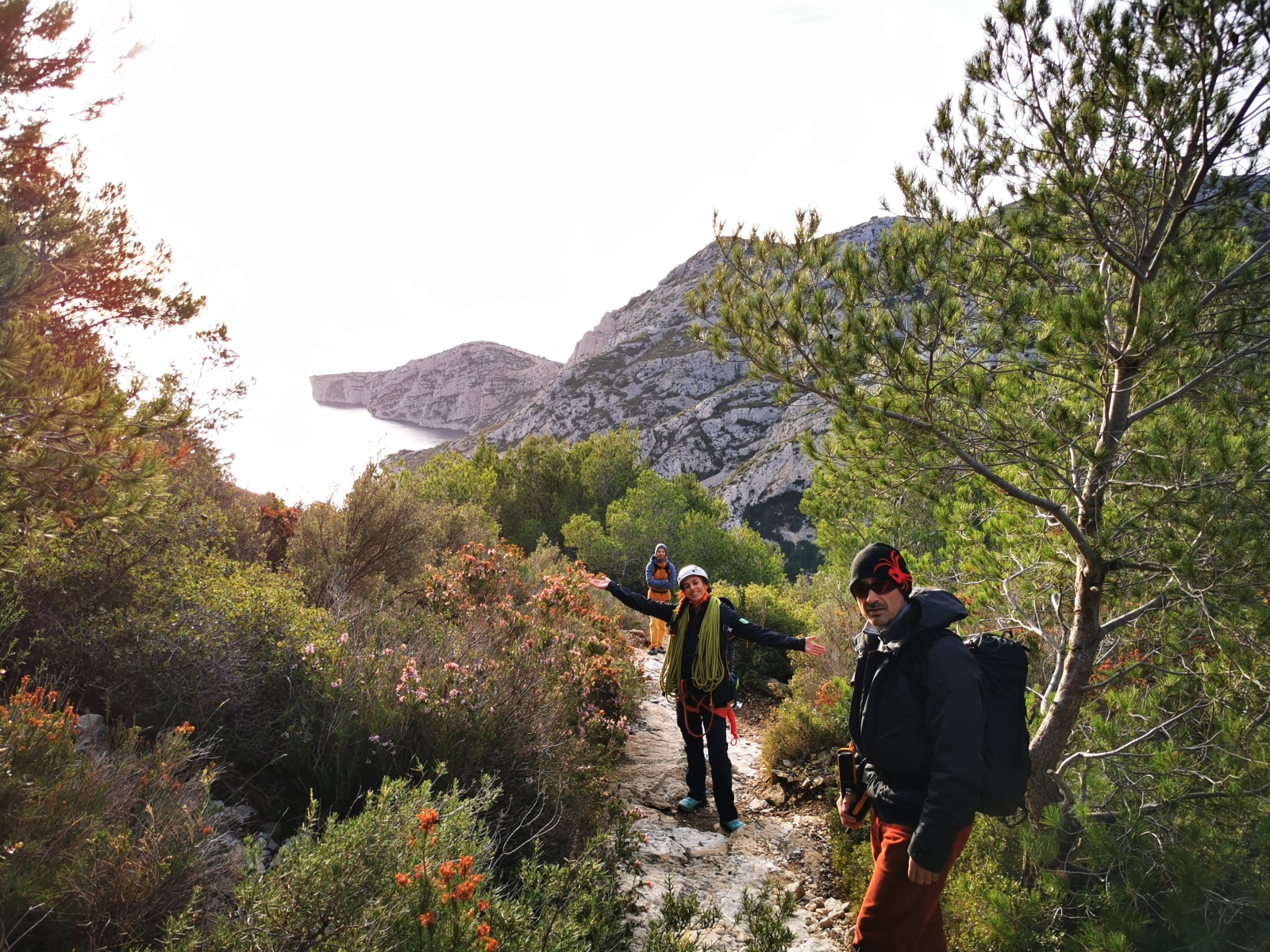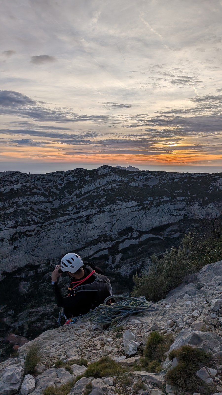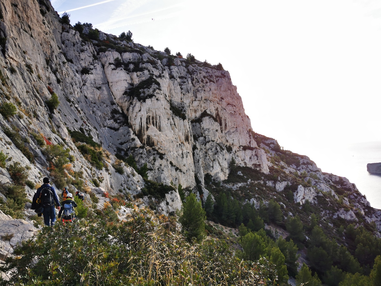 L’objectif premier était de parvenir à sortir avant la nuit. La première longueur étant commune, il s’agissait d’être efficaces tout au long de la journée et particulièrement sur le départ. Je laisse donc les groupe finir de se préparer en toute confiance et j’attaque avec ma cordée la marche d’approche d’une grosse vingtaine de minutes. Il fait un peu froid mais la paroi prend déjà le soleil. Comme toujours en cette période, il s’agit de composer entre prendre plein de vêtements pour être sûr de ne pas avoir froid et le poids du sac. Je penche vers un sac plutôt léger car il ne semble pas y avoir du vent et aucun nuage n’est prévu. Arrivé au pied de la paroi, après avoir cherché quelques minutes le départ bien caché, je range la couche thermique au fond du sac et ce sera t-shirt jusqu’au sommet !