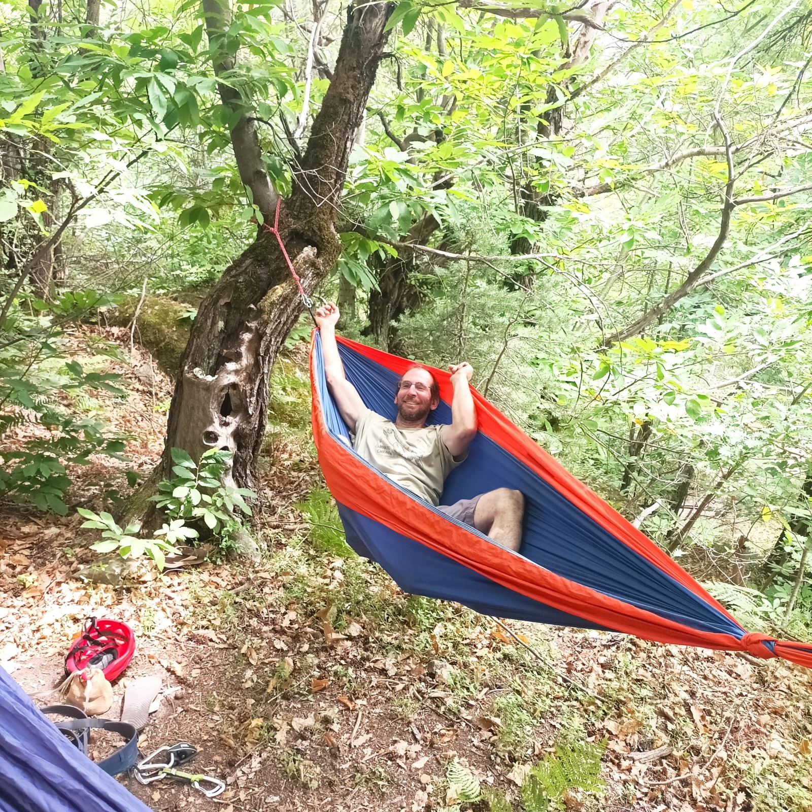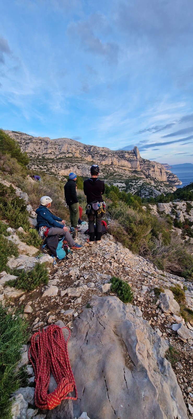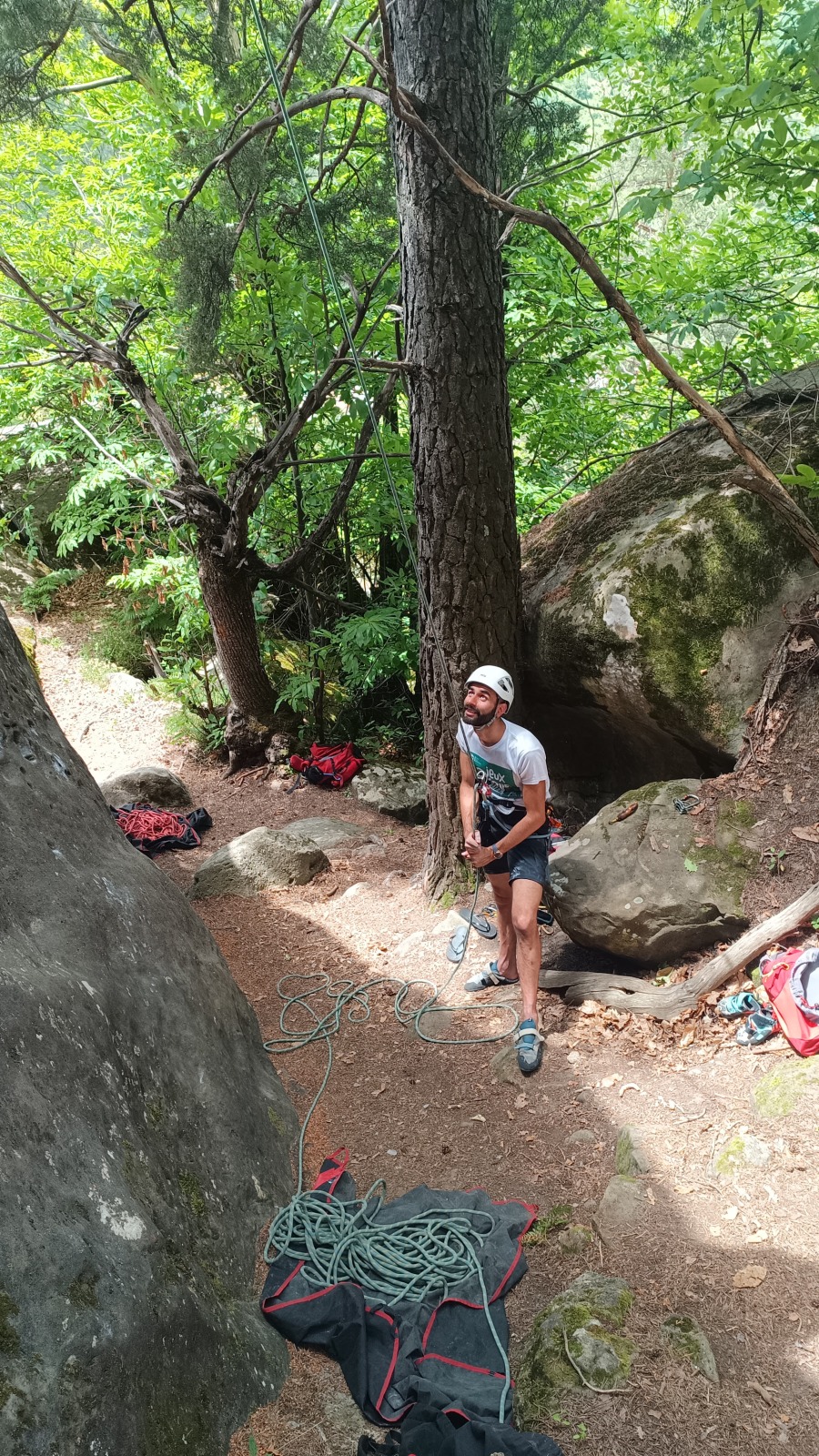 Pendant ce temps, Julien organise un petit mouflage pour aider Mattieu L dans le 6a+ tout en laissant les dégaines pour Djé qui apprécie le geste. Il enquille ensuite avec les deux dernières longueurs pas très intéressantes. Nous avons déjà rangé nos cordes lorsqu’il arrive au chêne.