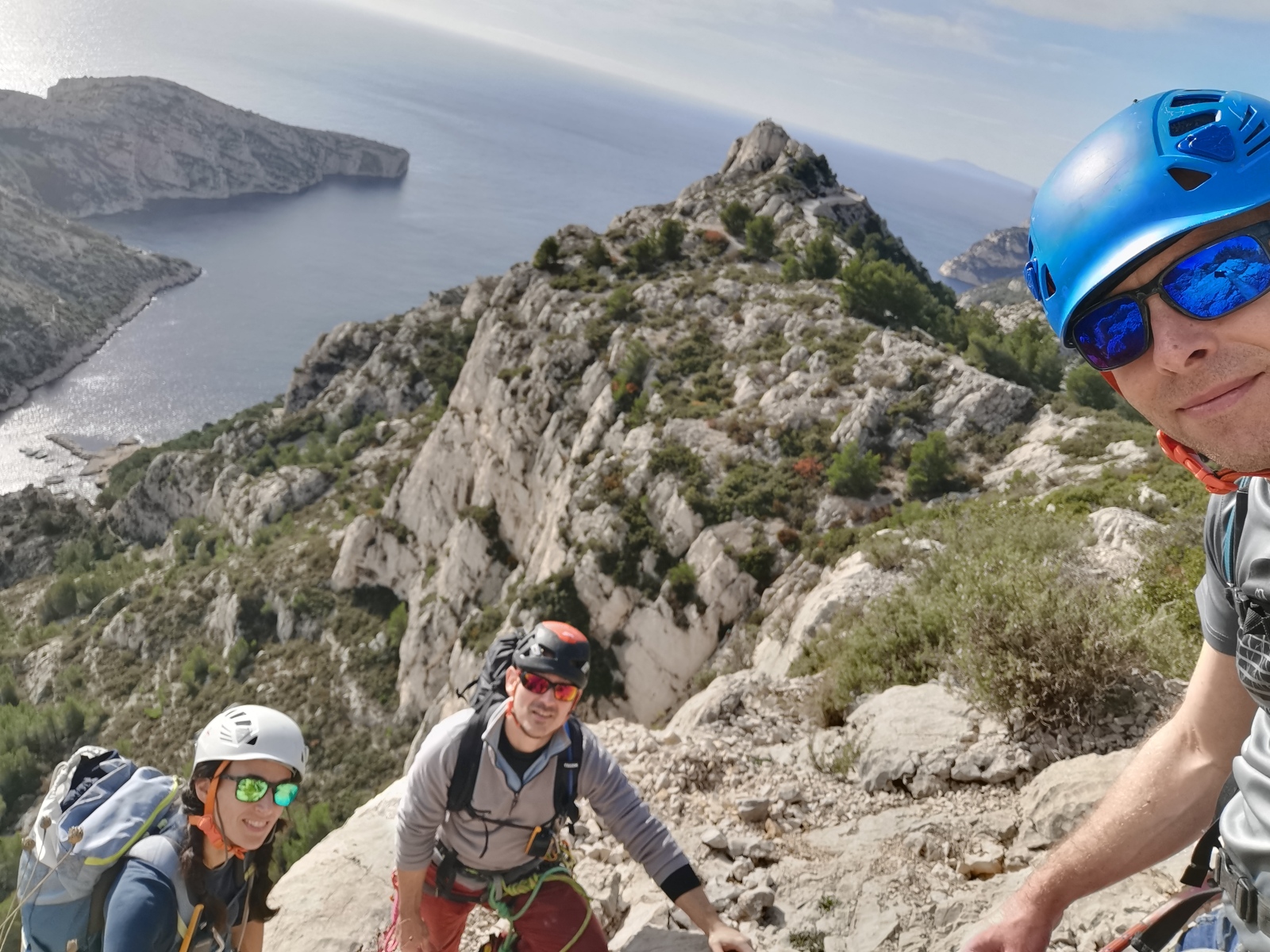 Djé a recollé à la cordée le précédant mais ils ont la chance d’avoir des relais confortables, ce qui n’est absolument pas notre cas. Mais on a rapidement pris un peu d’avance sur la cordée JP que j’attends aux relais juste un peu pour vérifier que tout va bien. On peut même se permettre de prendre une pause sandwichs au seul relais vraiment confortable après la magnifique L6 où je reprends la tête de la cordée pour enchaîner le deuxième 6a+, une longueur exceptionnelle en très léger dévers sur gros trous. Je prends mon pied comme pas possible.