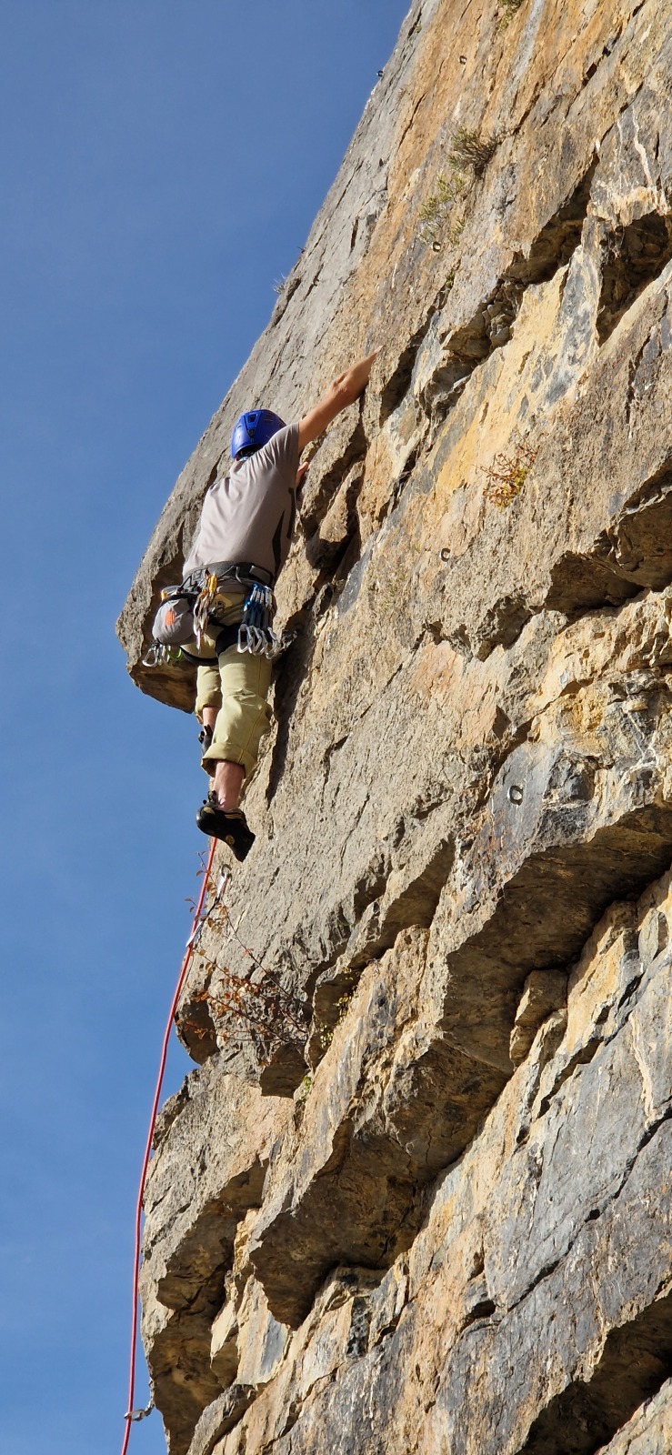 Je suis donc avec Thibaud et Laura dans les Chevreuils. Etant le plus rapide, je me lance dans la première longueur en 5c assez teigneux pour une longueur de chauffe pour arriver au premier relais pas hyper confortable, rapidement suivis par mes deux camarades du jour. Julien prend la tête de la cordée suivante composée de Roxane et Mattieu L. Il nous dépasse par la gauche pour atteindre un premier relais un peu plus haut et plus spacieux dans l’Eperon. Je suis déjà dans la L2 en 6a+ fin et pas facile tandis que Djé attaque la L1. Il part dans l’éperon avec Jean et Florian. JP prend la tête de la dernière cordée avec Matthieu H et Jean-Luc.
