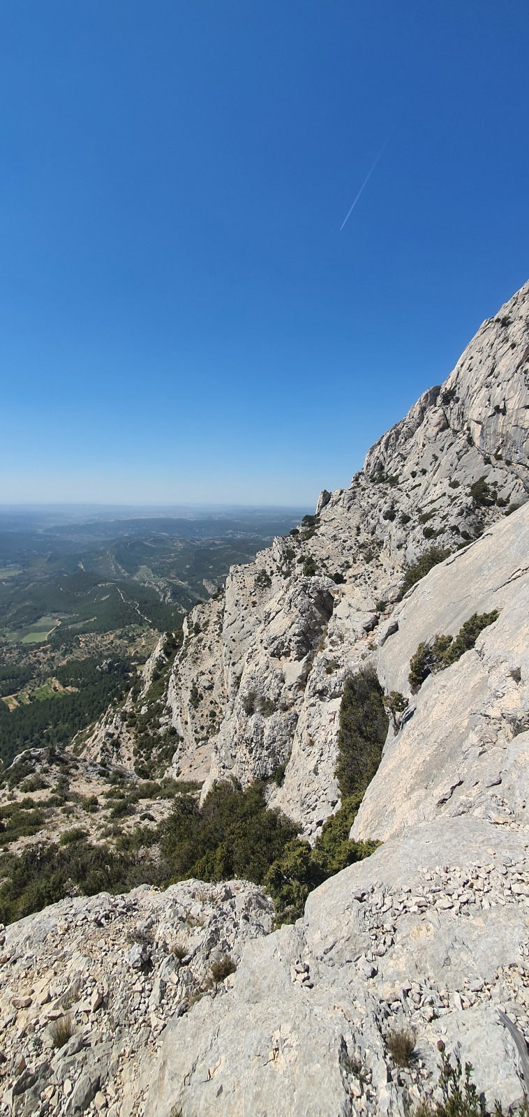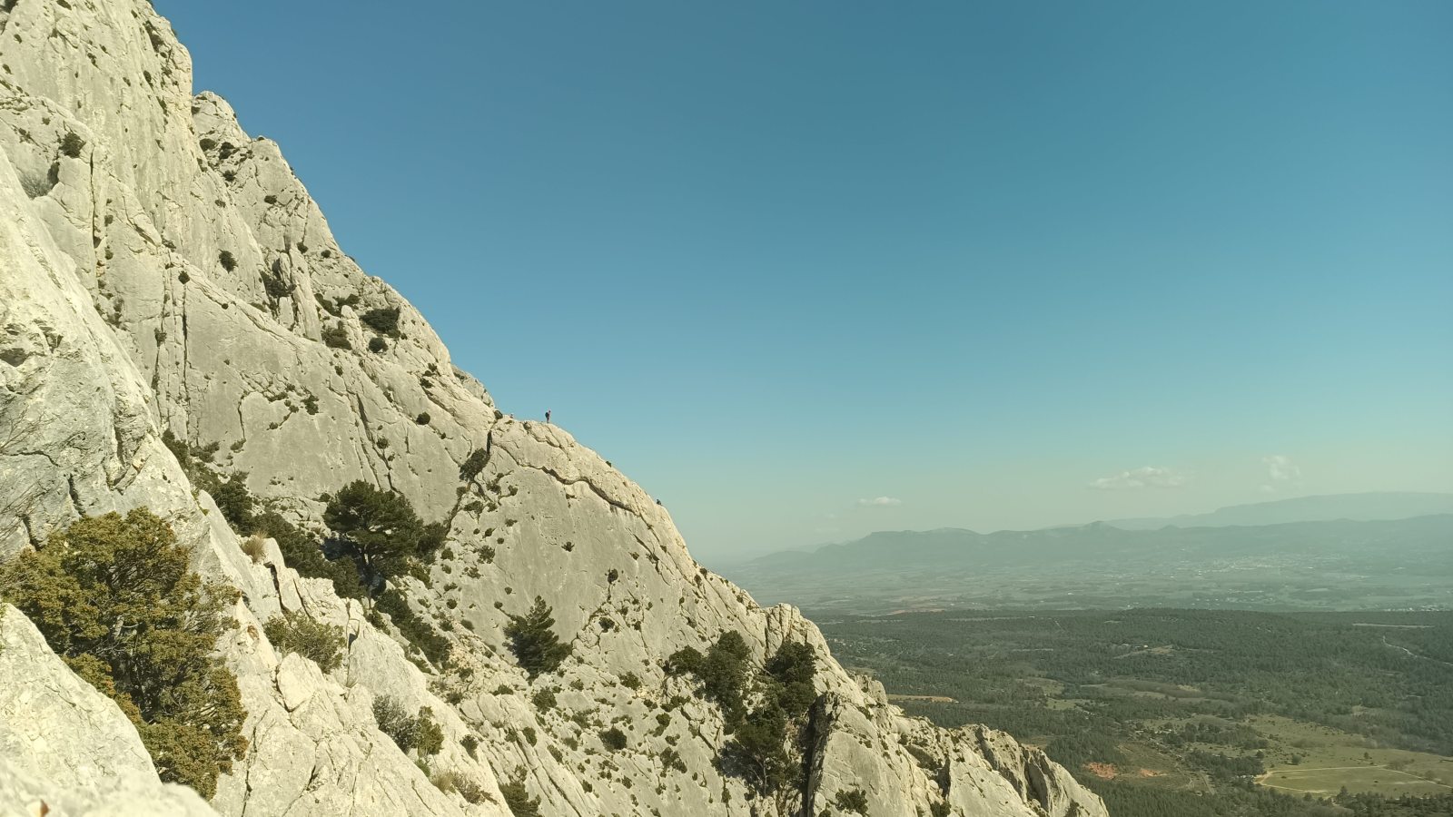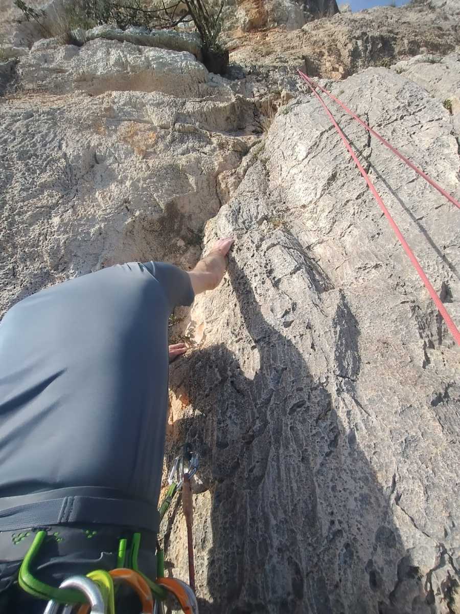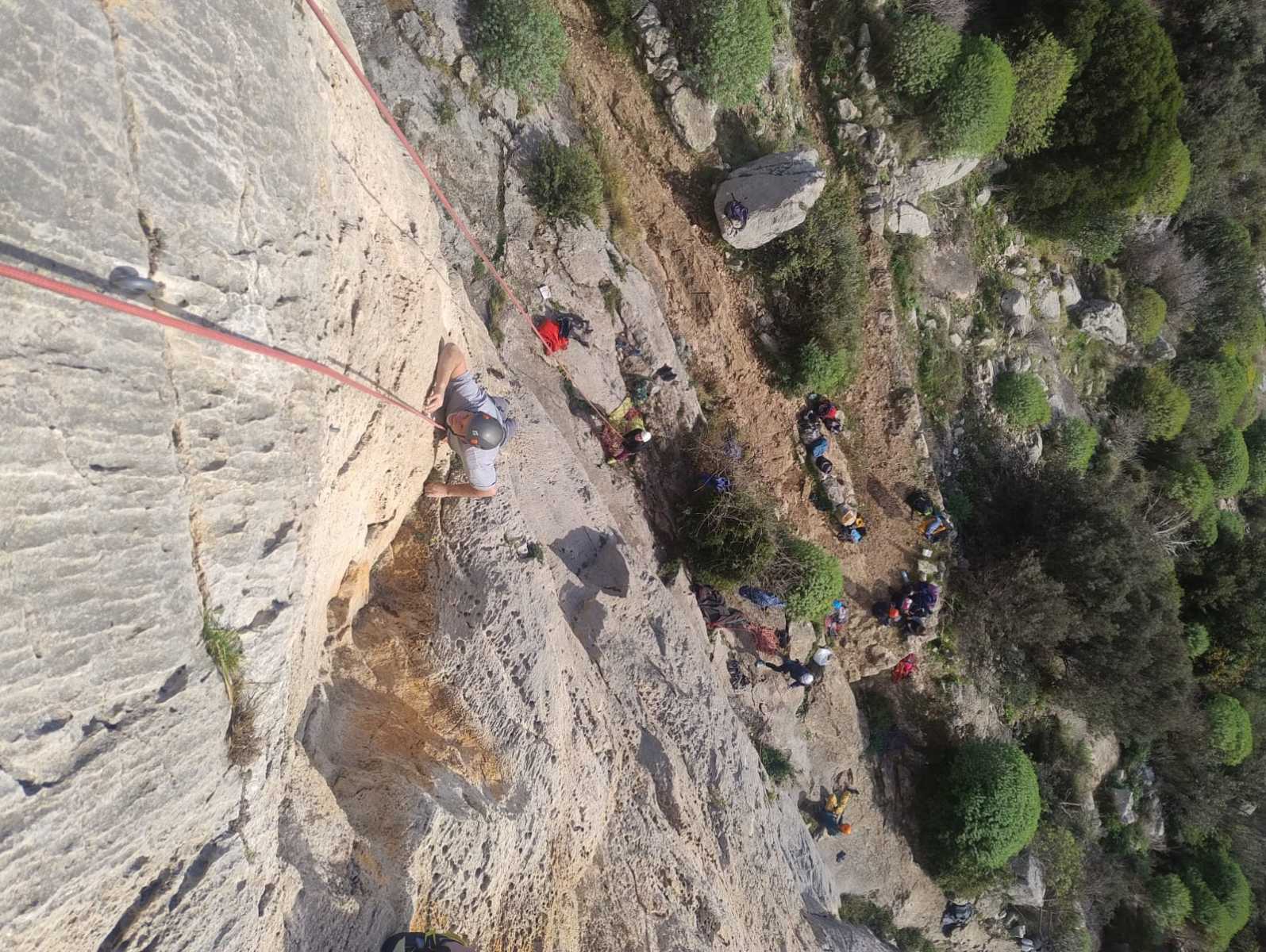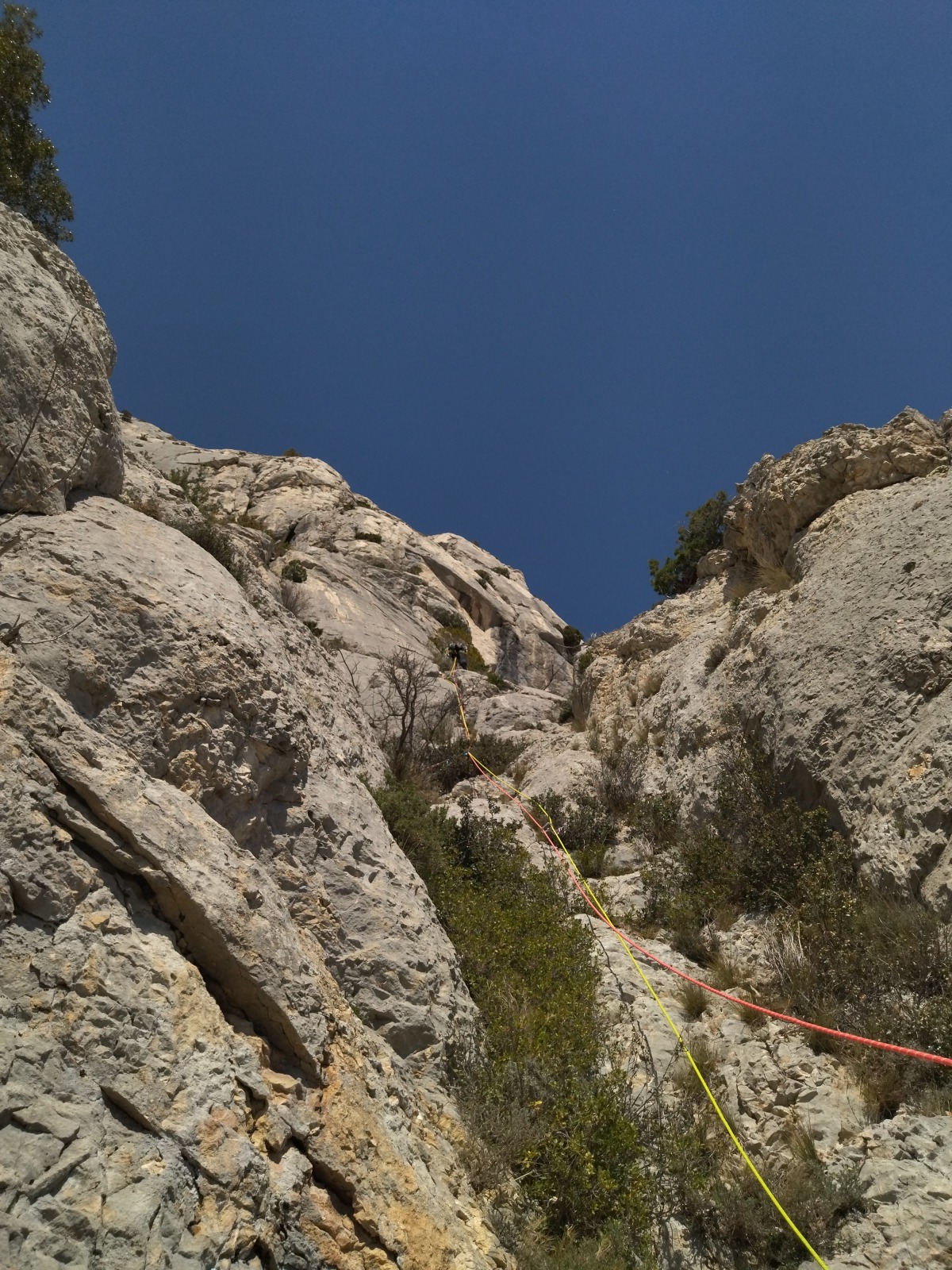 Désormais, la totalité des cordées a pris de la hauteur et lorsque nous levons les yeux nous apercevons au dessus de nos têtes le sommet de nos voies et tout un tas d’individus tentant d’y parvenir tels des fourmis essayant de s’extraire d’un piège. Yannick étant arrivé sur la première terrasse, je le laisse gérer les cordées qui arrivent pour en profiter pour monter au R2 du croupion, préclipper les deux premières dégaines pour Sabine qui va partir en tête, et corriger les erreurs de Michèle/Delph.
