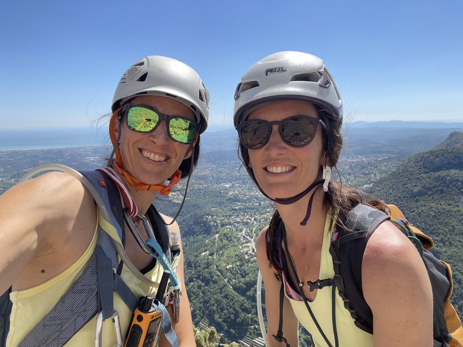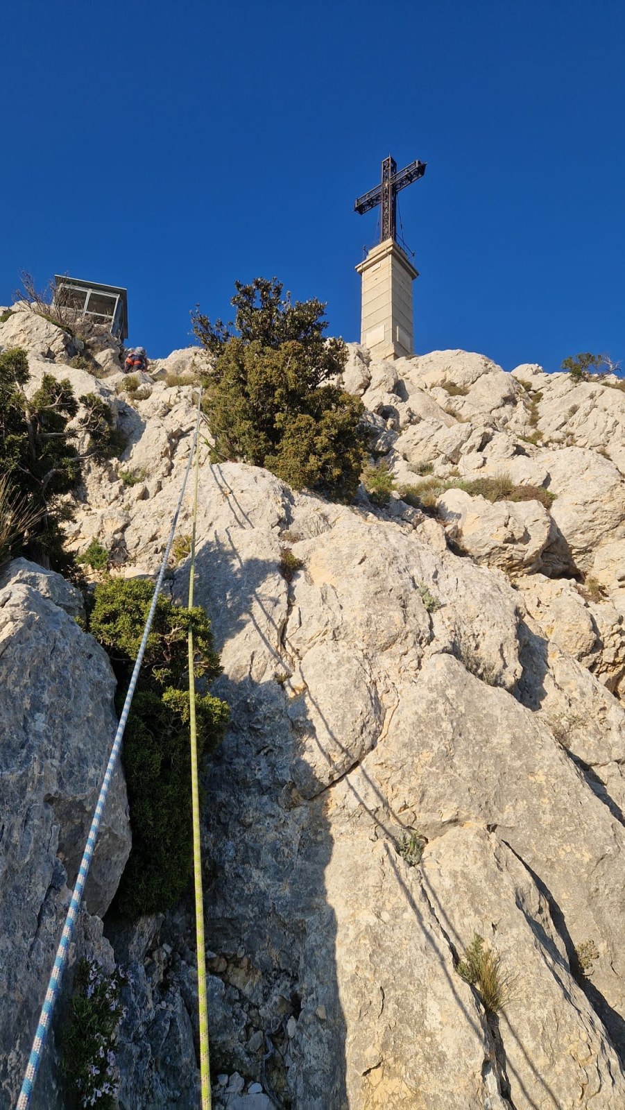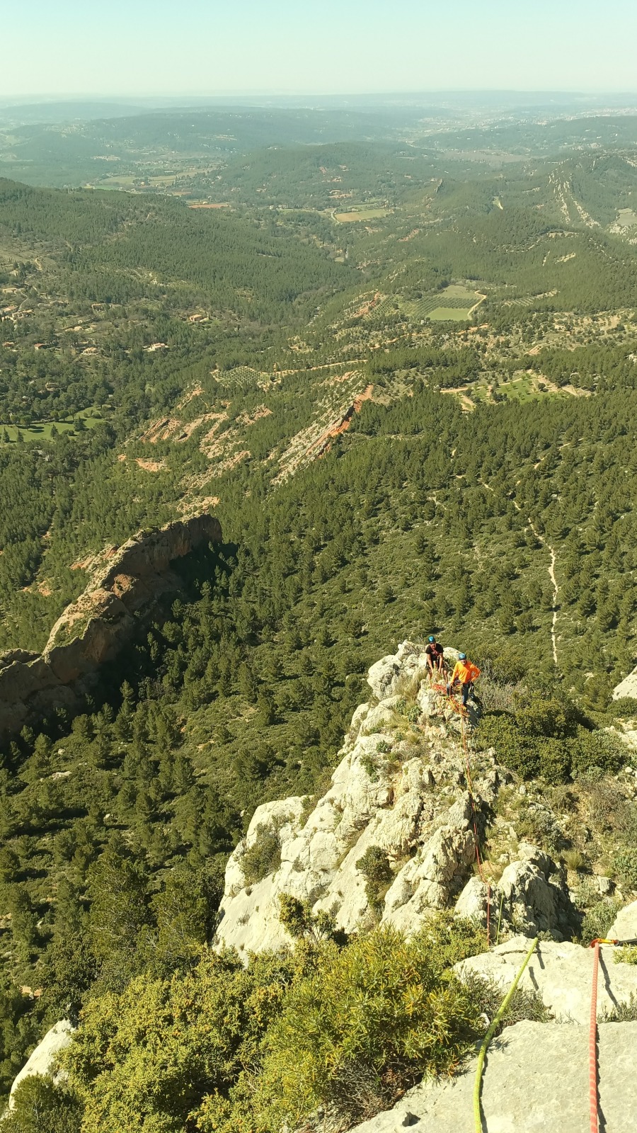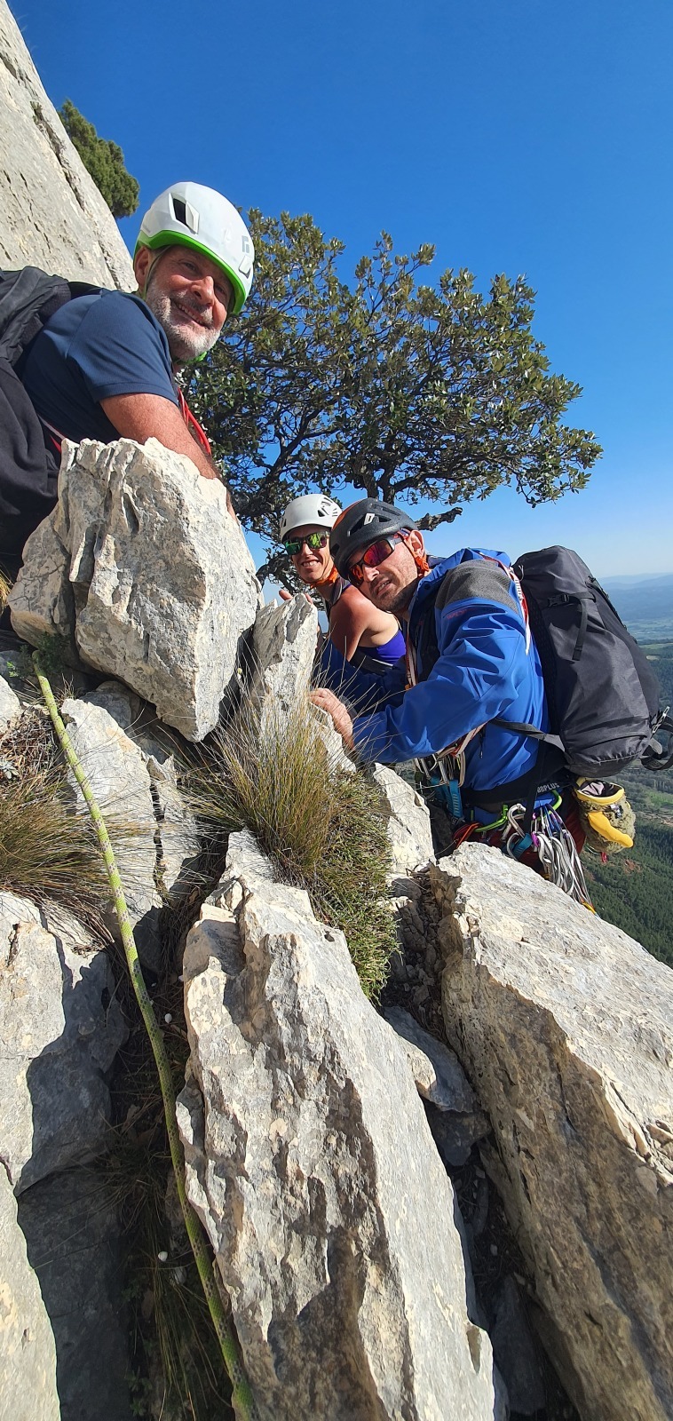 Les cordées parviennent progressivement au sommet. Michèle fait la dernière longueur en tête, Djé, Xav et Thibaud se rétablissent à la cime. Thomas a repris la tête et c’est dorénavant une formalité pour lui de grimper au dessus du point et de construire des relais et assurer Sabine et Yannick. Le couple Gouix et Julien arrivent également et Florian randonne le crux de la dernière longueur et permet à sa cordée de sortir également.