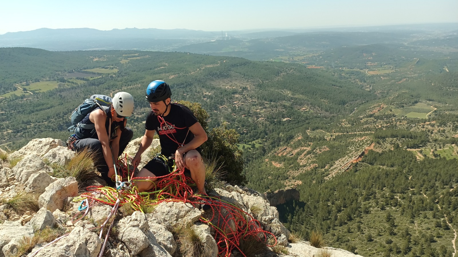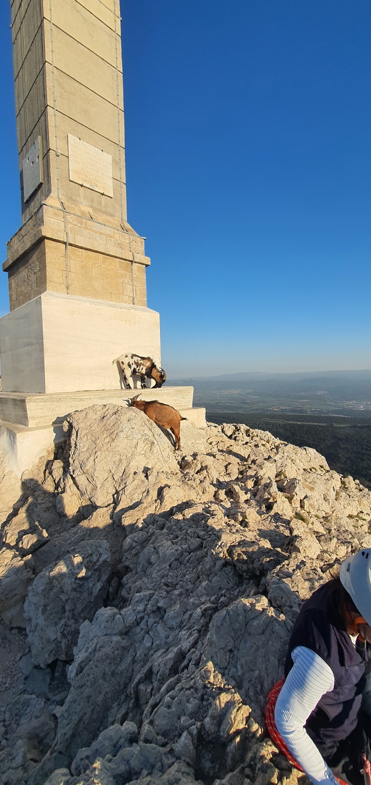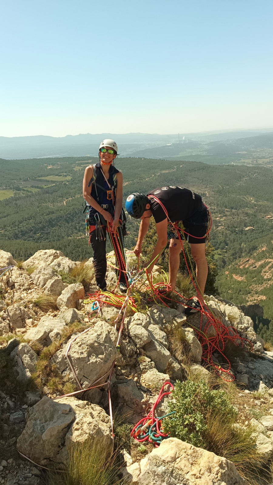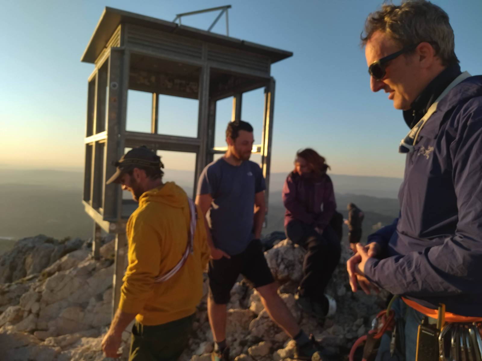 Les cordées parviennent progressivement au sommet. Michèle fait la dernière longueur en tête, Djé, Xav et Thibaud se rétablissent à la cime. Thomas a repris la tête et c’est dorénavant une formalité pour lui de grimper au dessus du point et de construire des relais et assurer Sabine et Yannick. Le couple Gouix et Julien arrivent également et Florian randonne le crux de la dernière longueur et permet à sa cordée de sortir également.