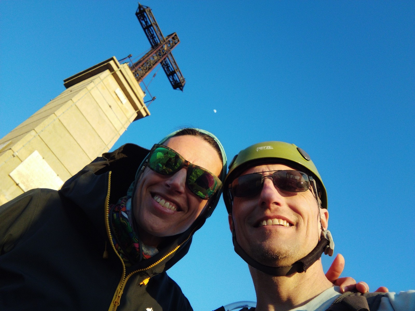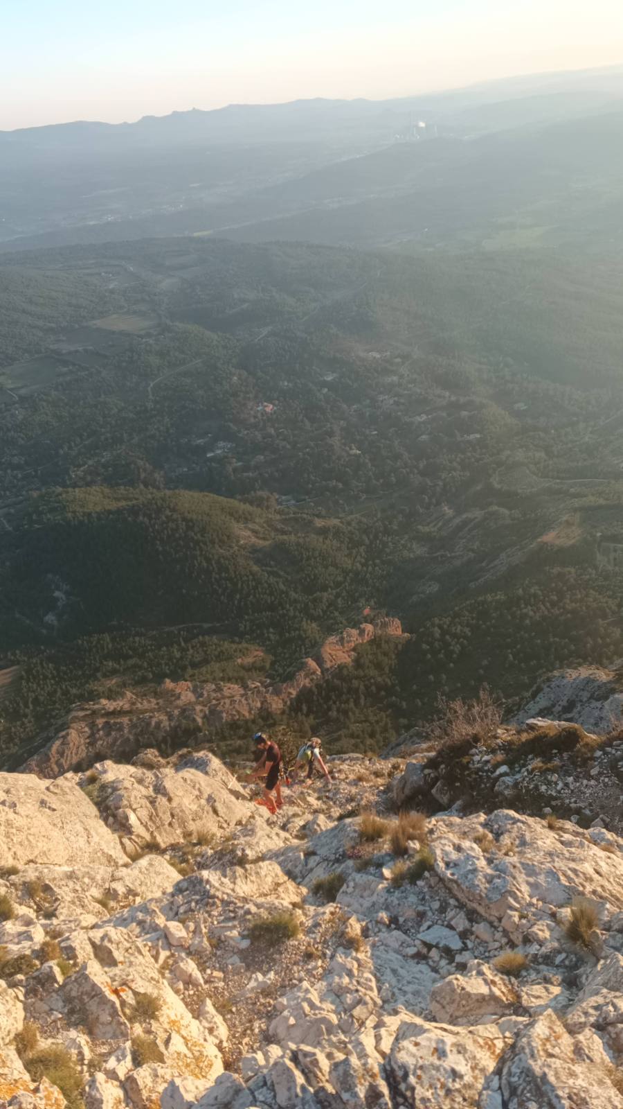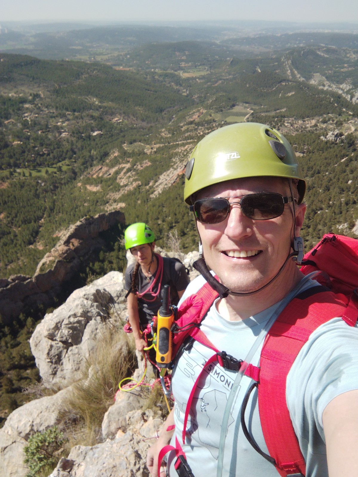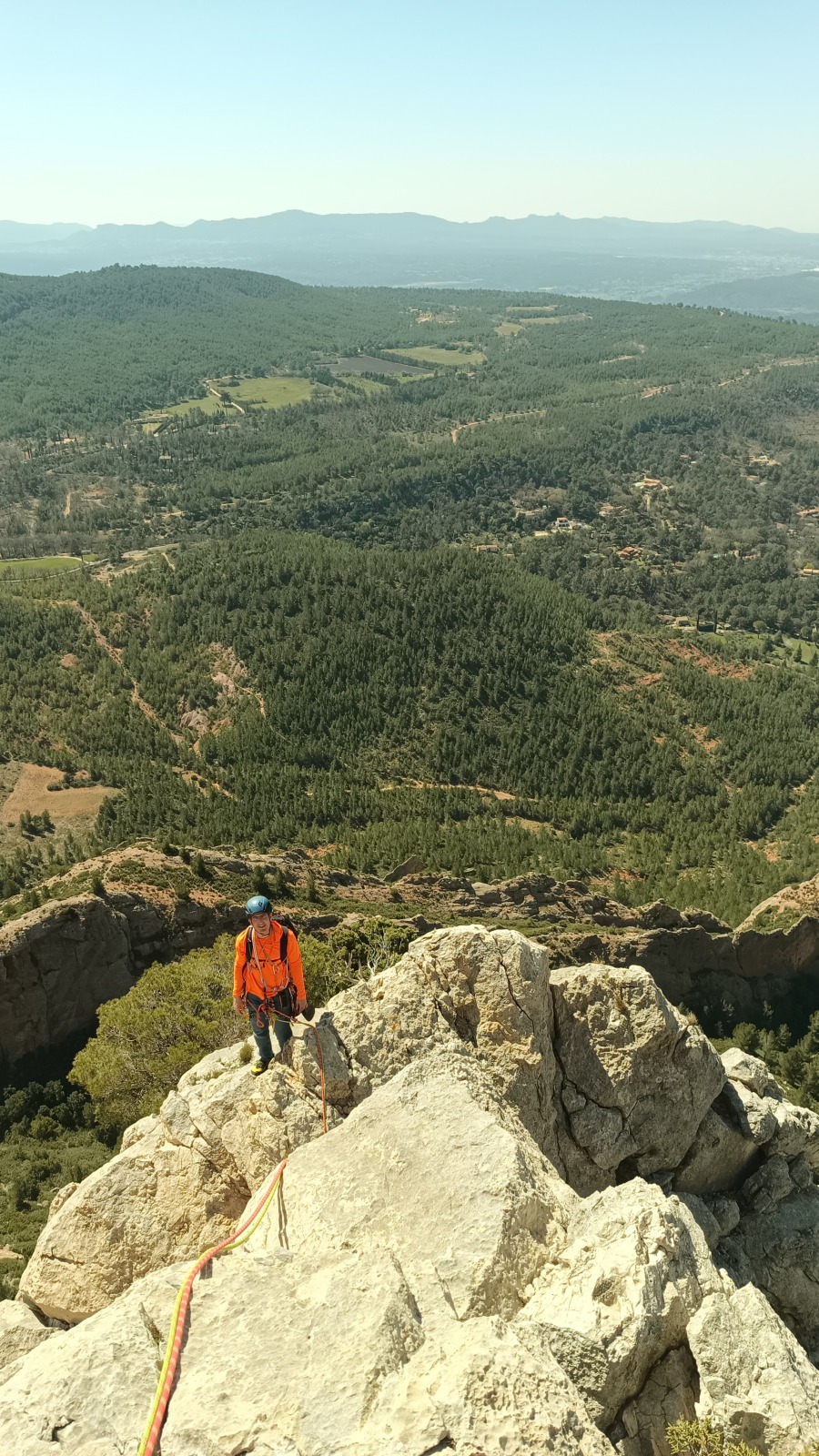 Les cordées parviennent progressivement au sommet. Michèle fait la dernière longueur en tête, Djé, Xav et Thibaud se rétablissent à la cime. Thomas a repris la tête et c’est dorénavant une formalité pour lui de grimper au dessus du point et de construire des relais et assurer Sabine et Yannick. Le couple Gouix et Julien arrivent également et Florian randonne le crux de la dernière longueur et permet à sa cordée de sortir également.