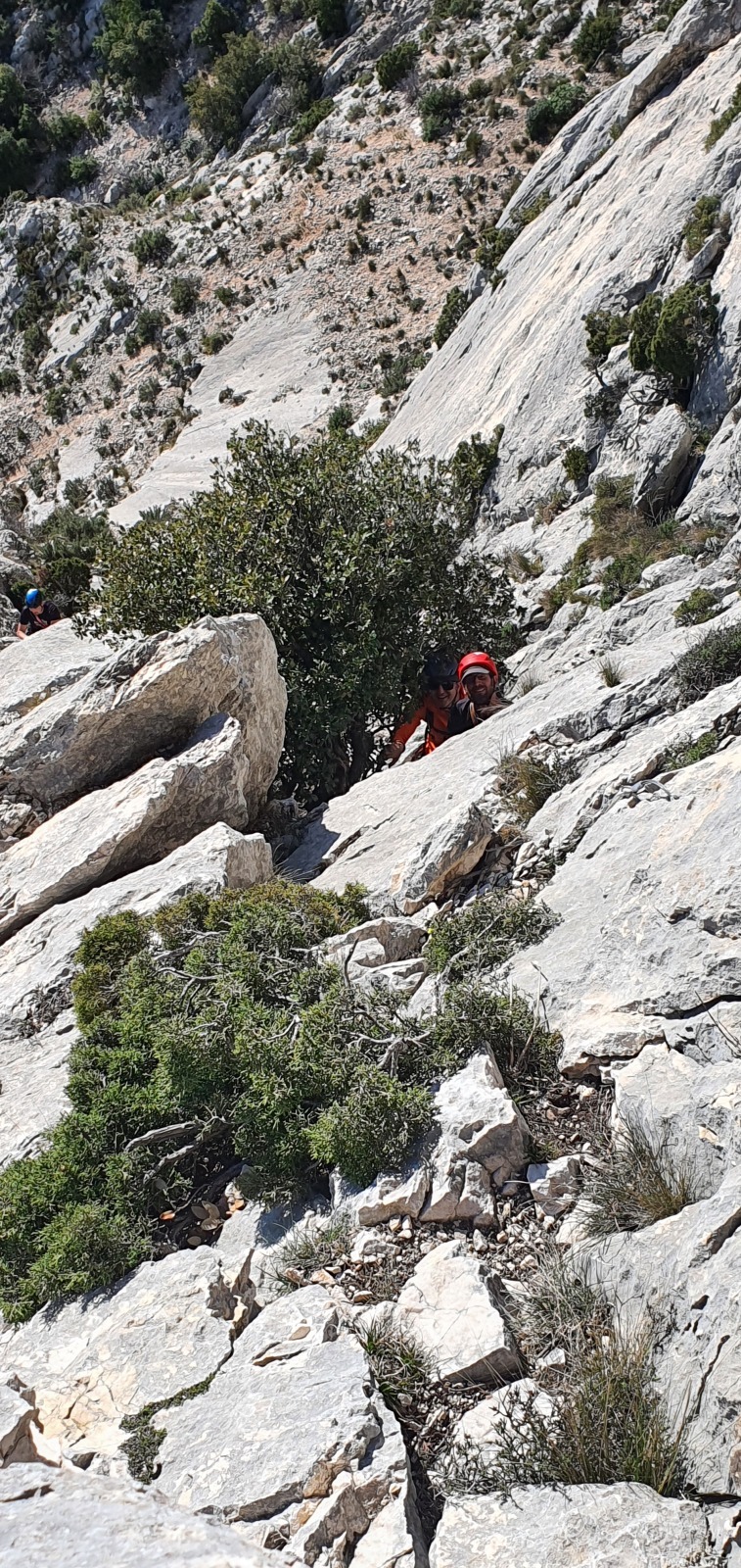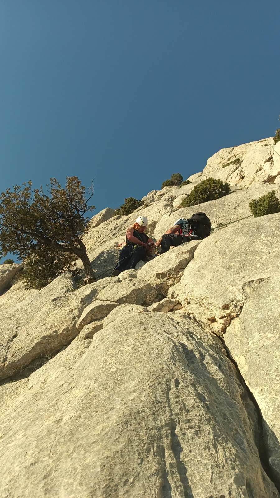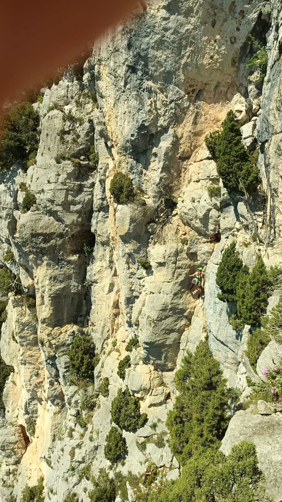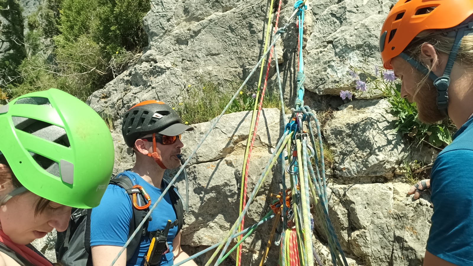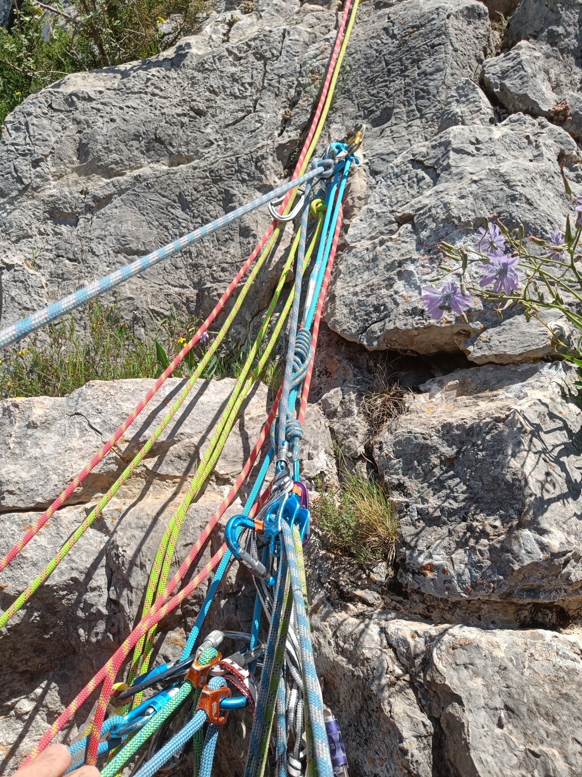 J’attends Sabine puis je rejoins Michèle et Isa au R3 pour expliquer comment sangler un becquet. De là, on voit arriver tranquillement Xav depuis un 6a, puis Thibaud et Djé. Tout se passe bien de leur côté. Brice est en tête dans la longueur de transition et cherche un peu son itinéraire mais finit par comprendre où il doit aller alors que je redescends en rappel pour me poster sur la deuxième terrase d’où je peux voir plein de monde et de relais. Jean est dans la 4ème longueur du croupion alors que Cécile, Delph et Isa sont déjà en haut. Je demande à Cécile de redescendre au R4 pour vérfier Jean : nickel.