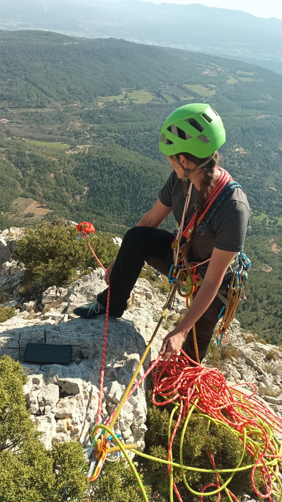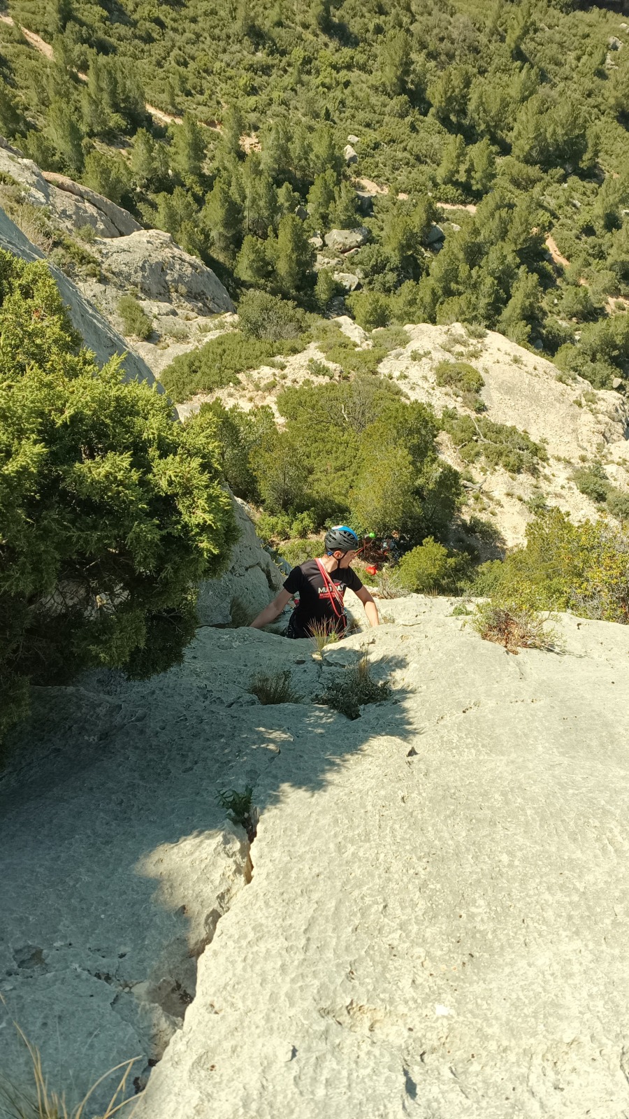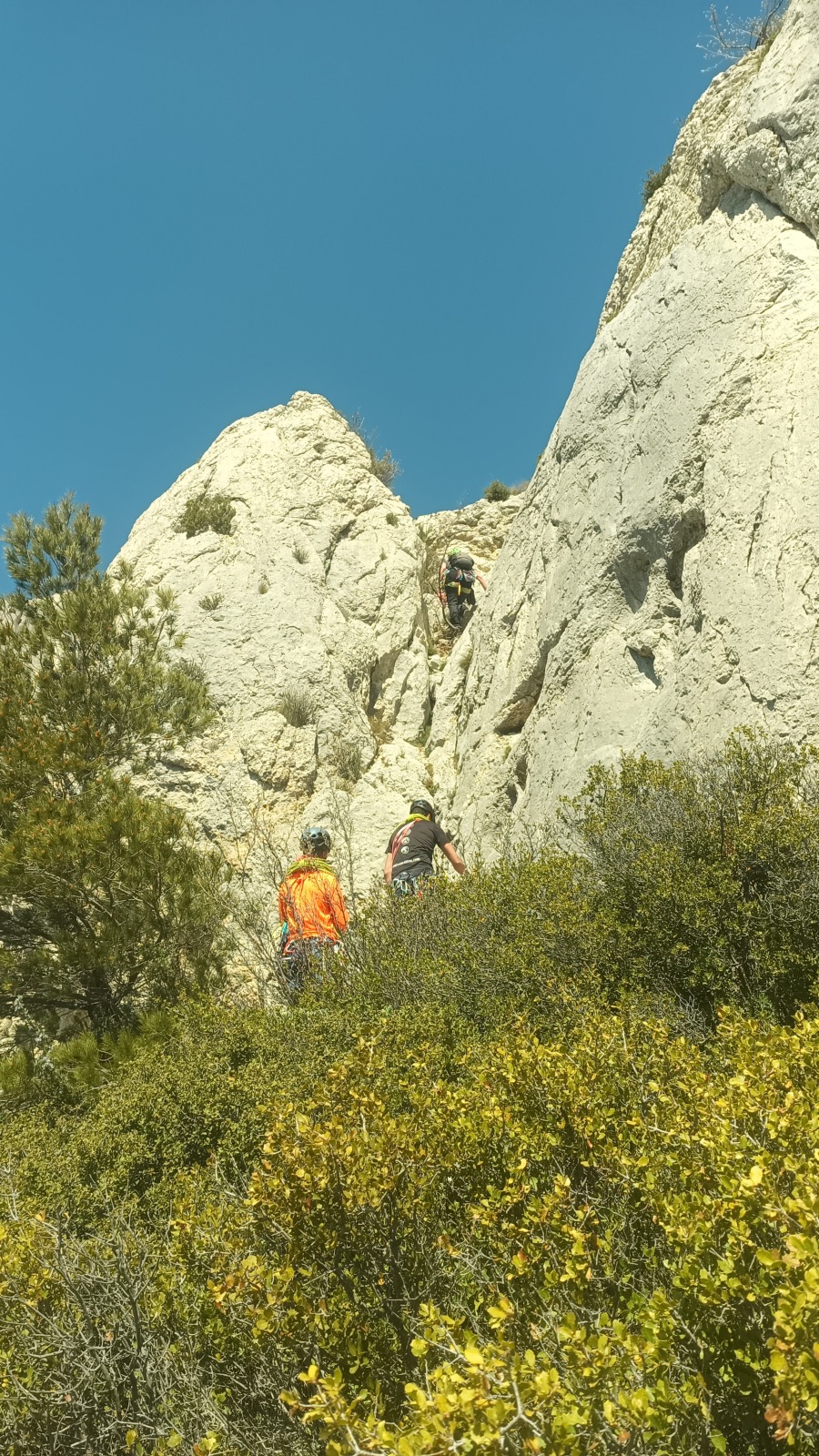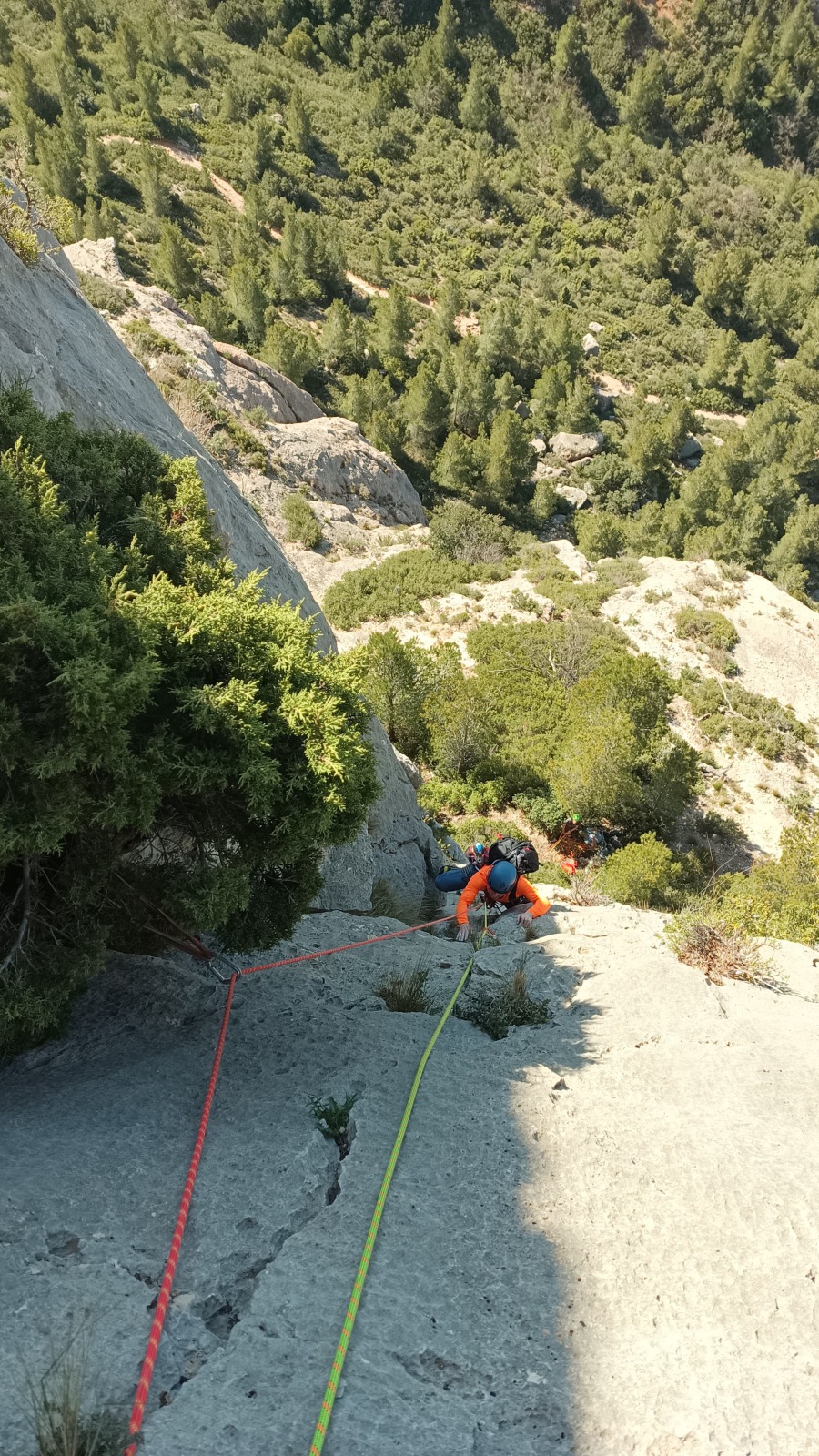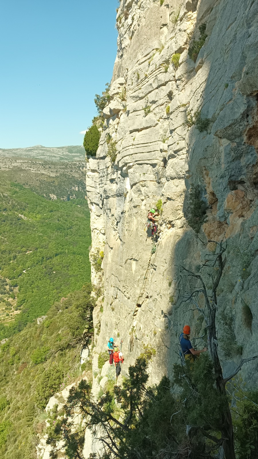 J’attends Sabine puis je rejoins Michèle et Isa au R3 pour expliquer comment sangler un becquet. De là, on voit arriver tranquillement Xav depuis un 6a, puis Thibaud et Djé. Tout se passe bien de leur côté. Brice est en tête dans la longueur de transition et cherche un peu son itinéraire mais finit par comprendre où il doit aller alors que je redescends en rappel pour me poster sur la deuxième terrase d’où je peux voir plein de monde et de relais. Jean est dans la 4ème longueur du croupion alors que Cécile, Delph et Isa sont déjà en haut. Je demande à Cécile de redescendre au R4 pour vérfier Jean : nickel.