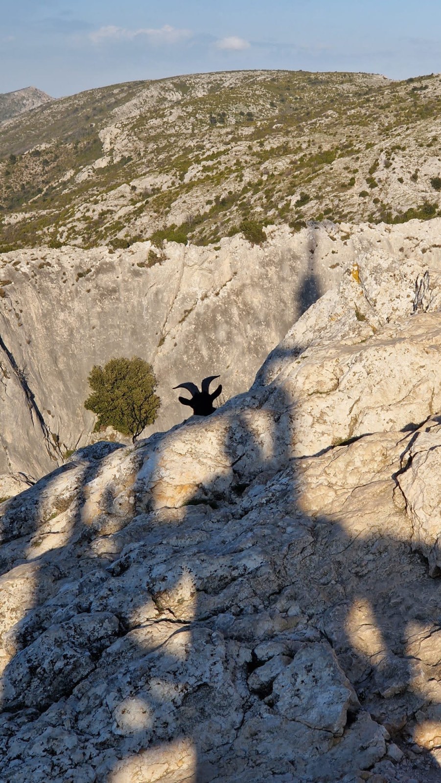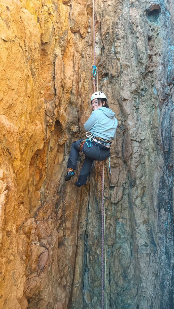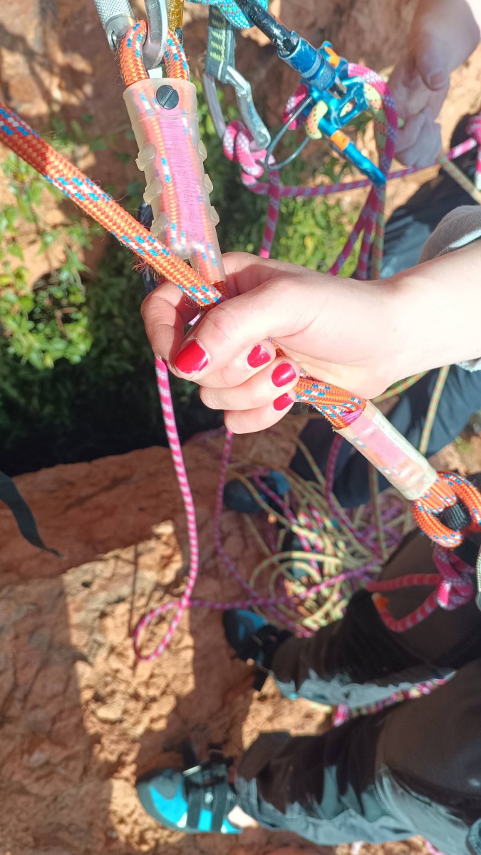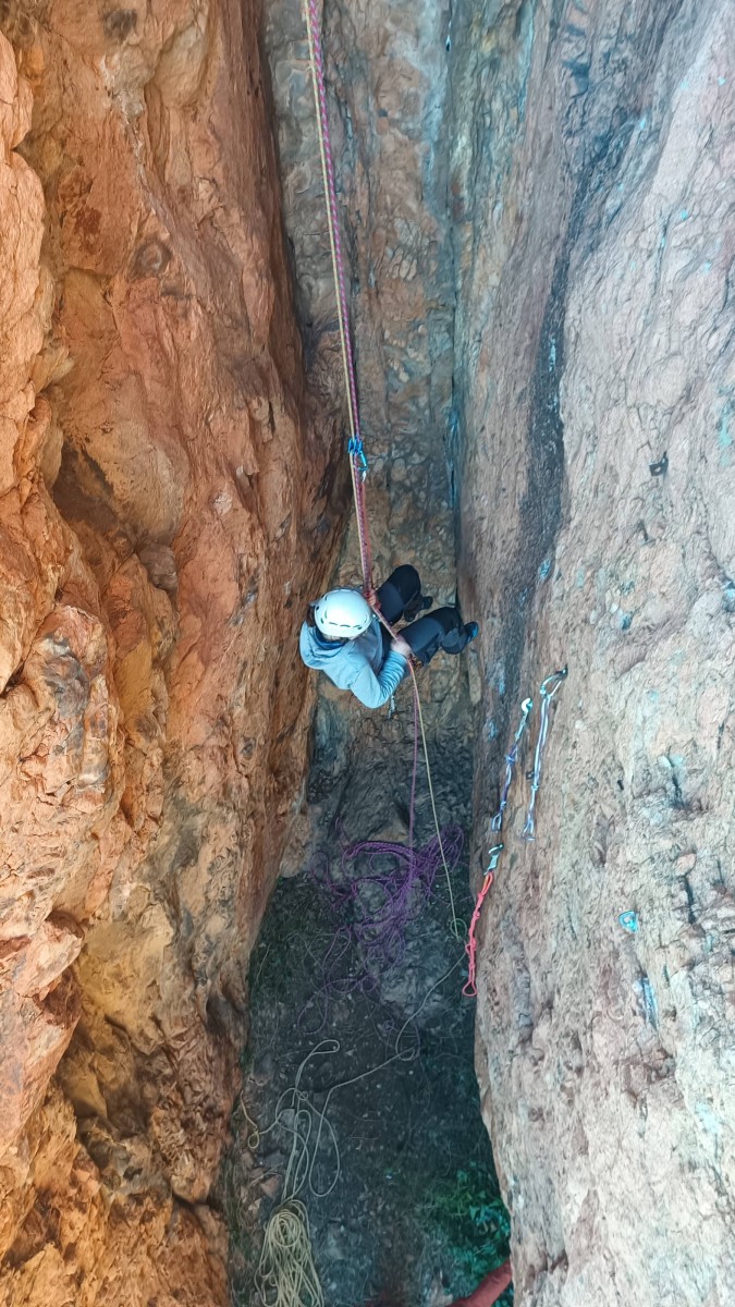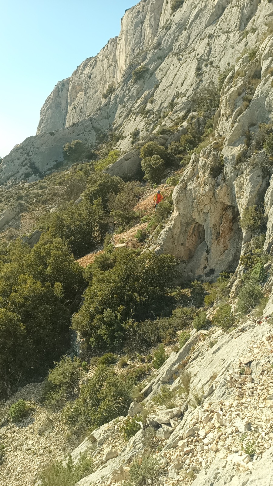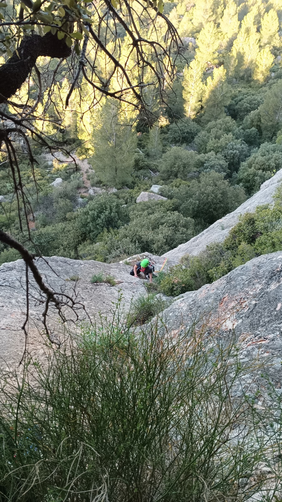 J’attends Sabine puis je rejoins Michèle et Isa au R3 pour expliquer comment sangler un becquet. De là, on voit arriver tranquillement Xav depuis un 6a, puis Thibaud et Djé. Tout se passe bien de leur côté. Brice est en tête dans la longueur de transition et cherche un peu son itinéraire mais finit par comprendre où il doit aller alors que je redescends en rappel pour me poster sur la deuxième terrase d’où je peux voir plein de monde et de relais. Jean est dans la 4ème longueur du croupion alors que Cécile, Delph et Isa sont déjà en haut. Je demande à Cécile de redescendre au R4 pour vérfier Jean : nickel.