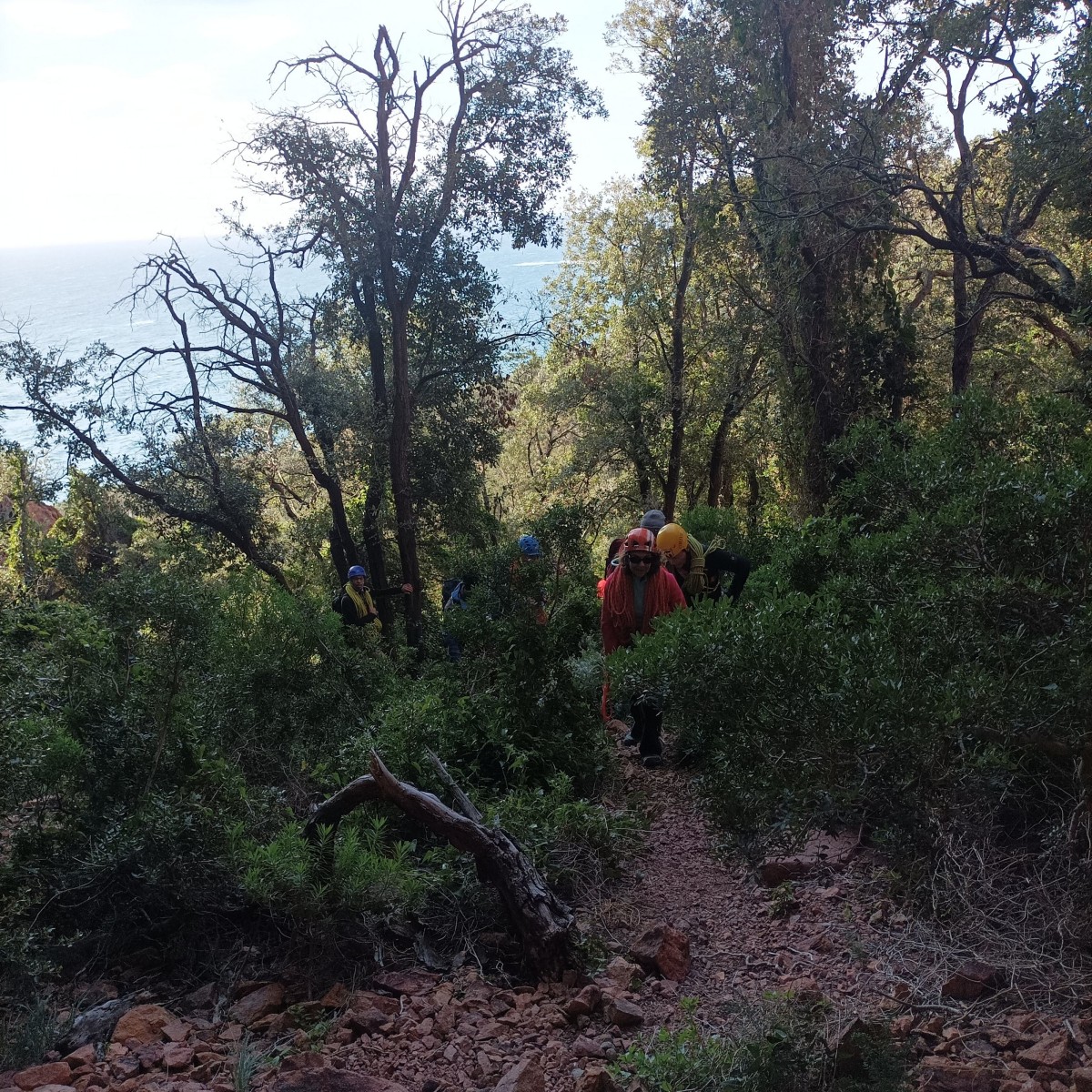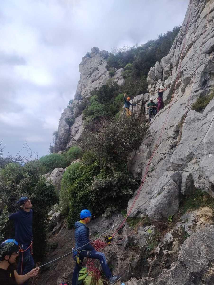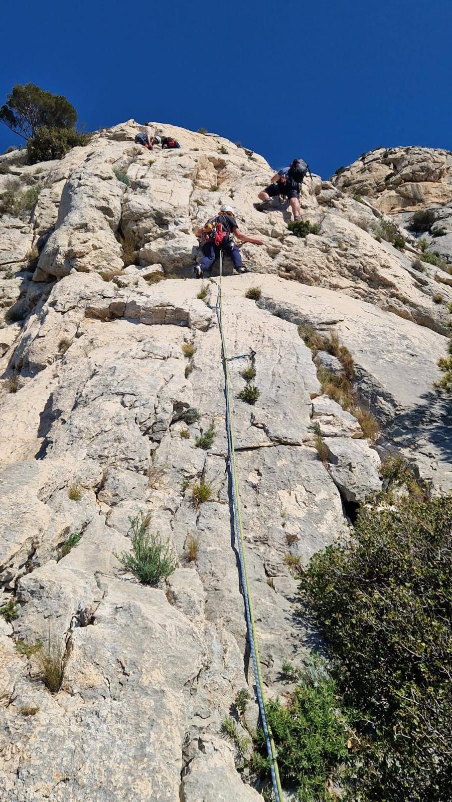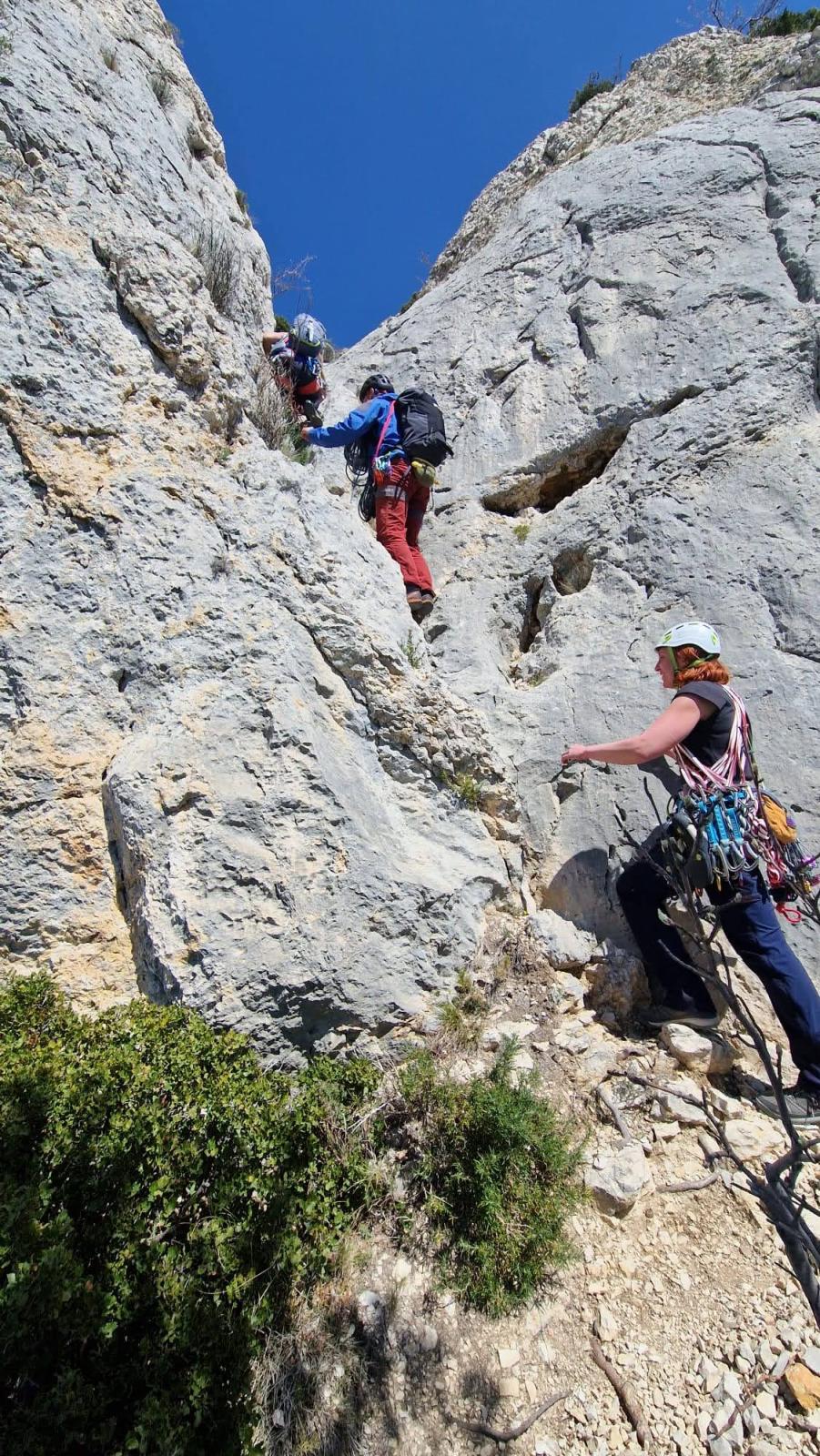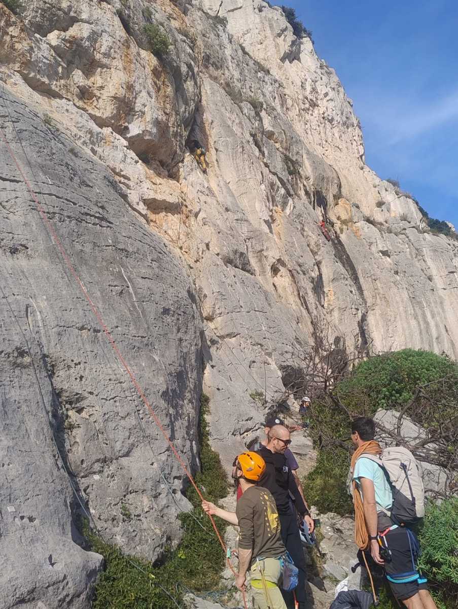 Il est donc 9h30 lorsque nous arrivons sur place, le soleil nous illumine de ses doux rayons matinaux et la mer agitée témoigne qu’ici le vent a soufflé fort ces derniers jours. Après la distribution des dégaines, des dynaloops, des systèmes d’assurage, des casques et des indispensables mousquetons de sécurité, nous voilà partis à 26 en file indienne sur la courte marche d’approche nous menant aux pieds des différentes grandes voies. D’autres cordées du CAF de Montauroux ont les mêmes ambitions que nous et, ayant lu mon post sur Facebook prévenant qu’on allait être très nombreux, sont arrivés quelques minutes avant, nous offrant le temps de réviser une dernière fois les manips histoire de se rassurer et de limiter les erreurs possibles.