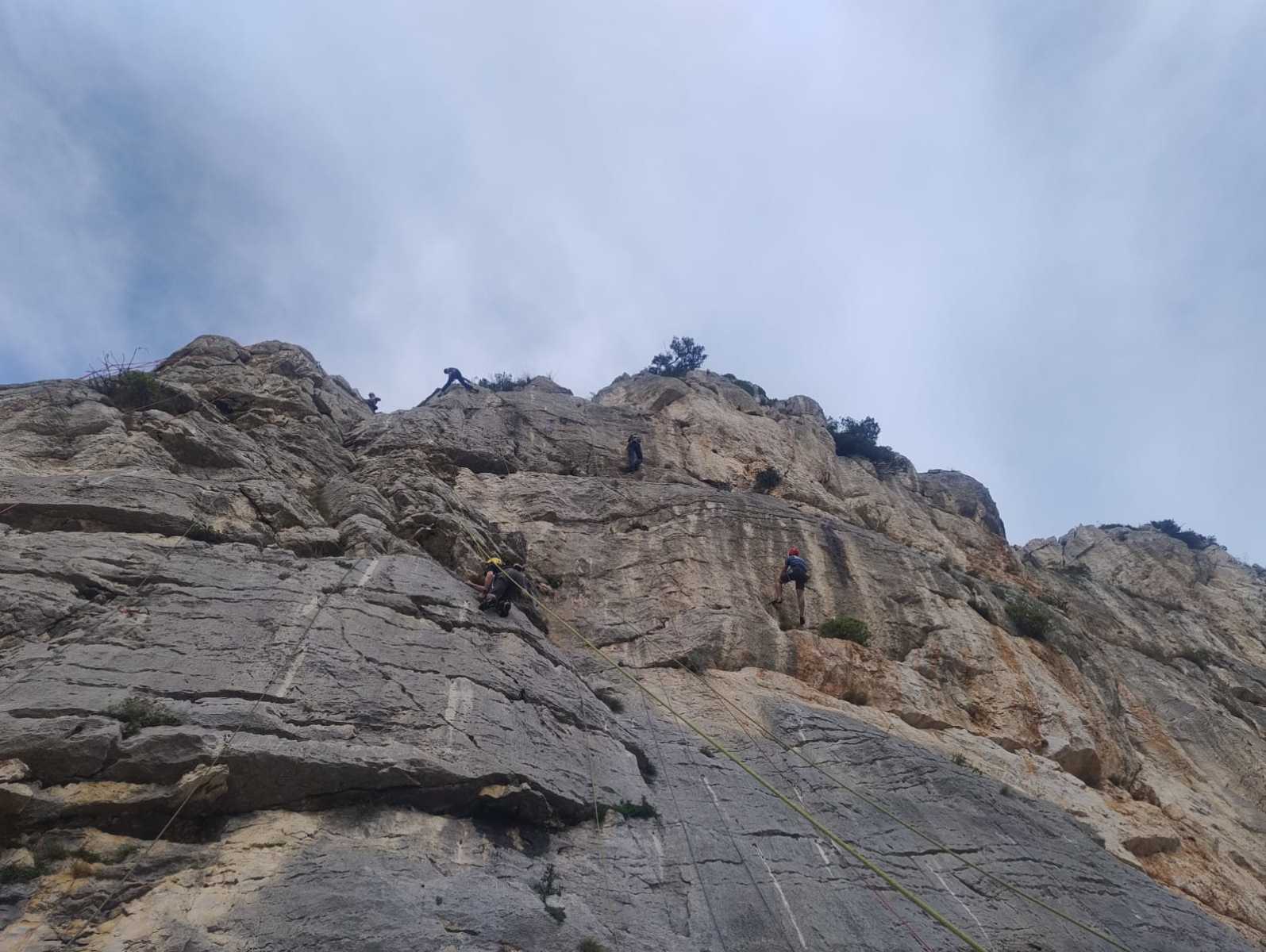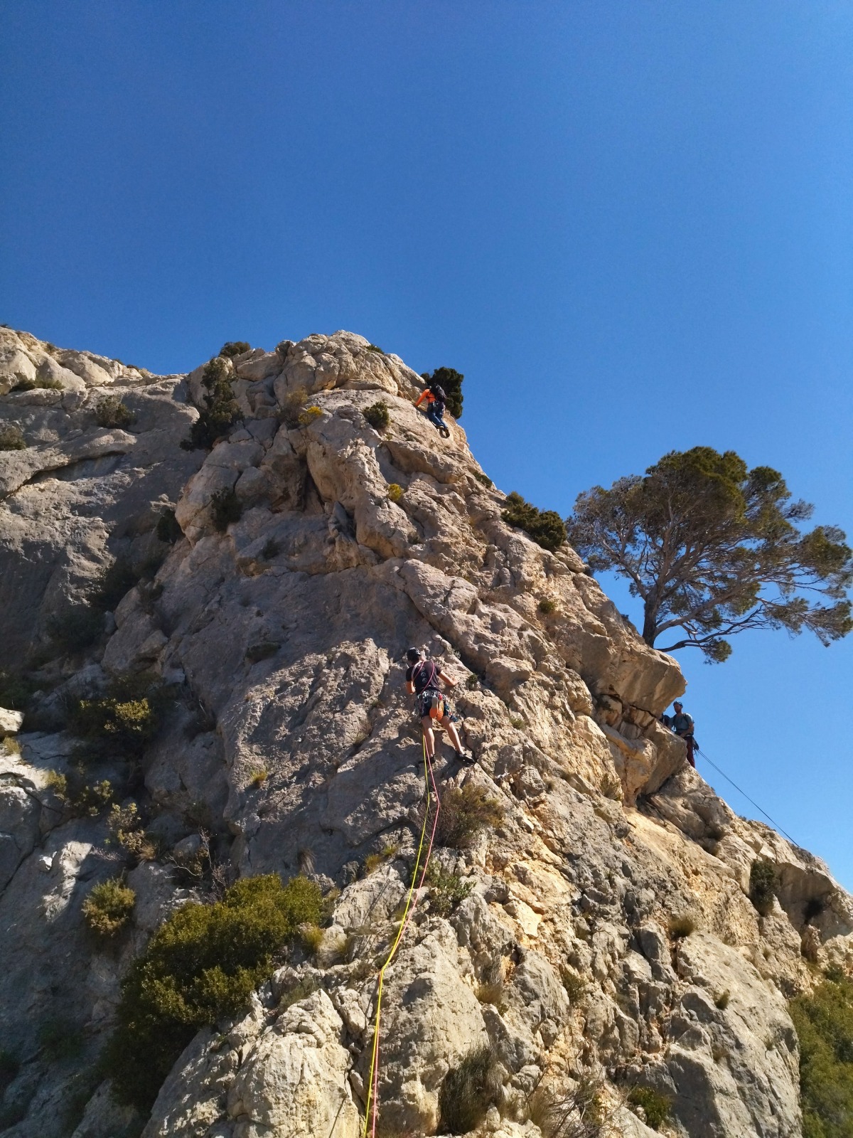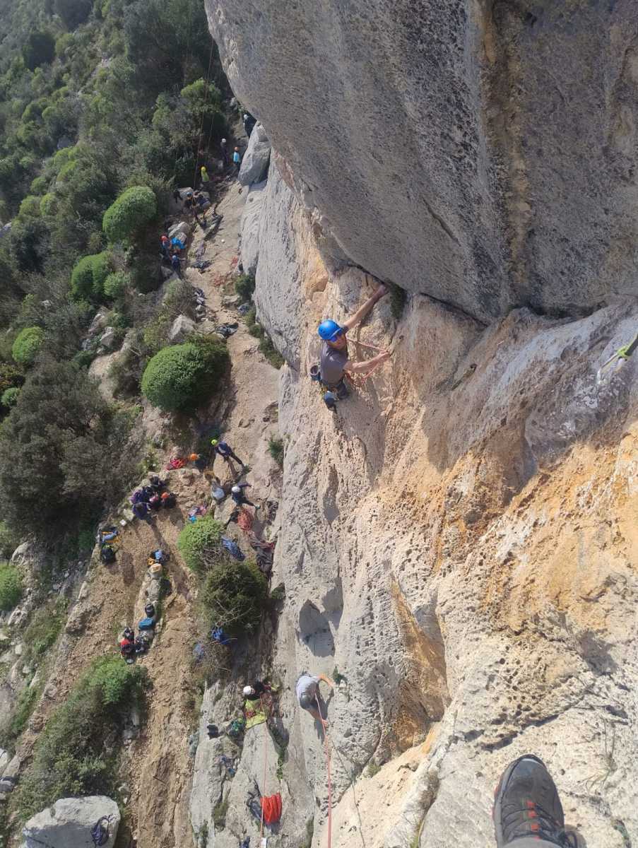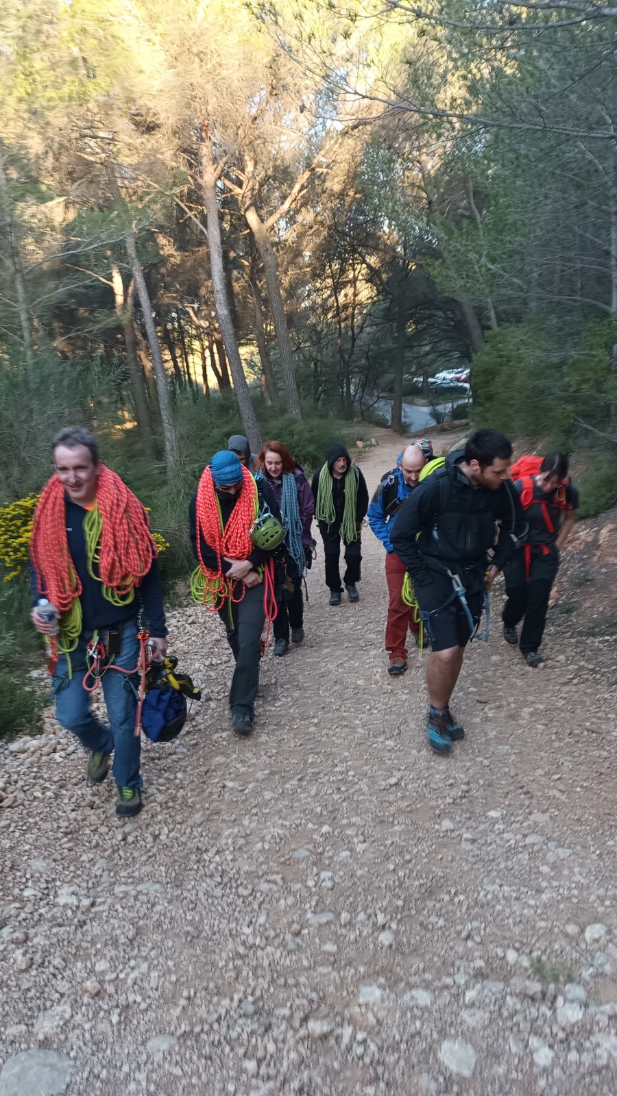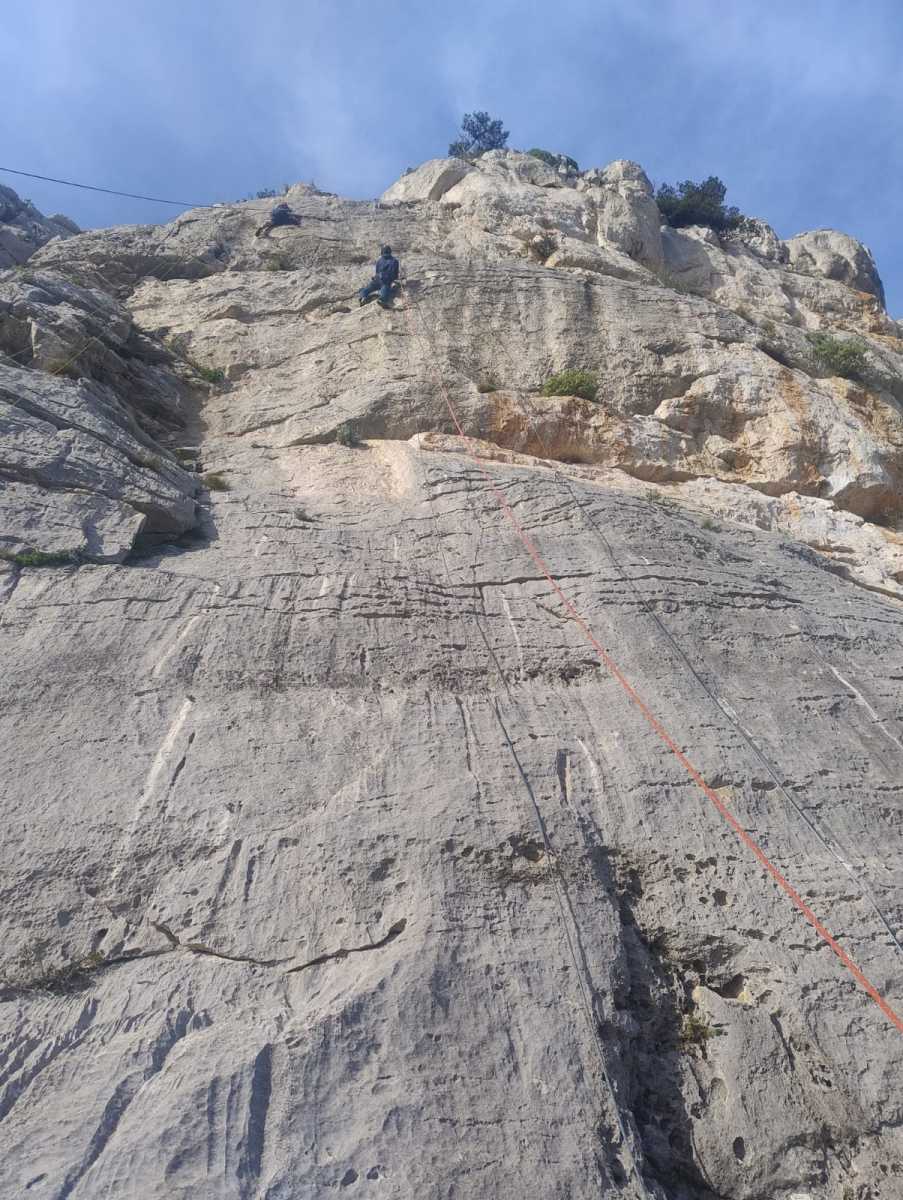 Il est donc 9h30 lorsque nous arrivons sur place, le soleil nous illumine de ses doux rayons matinaux et la mer agitée témoigne qu’ici le vent a soufflé fort ces derniers jours. Après la distribution des dégaines, des dynaloops, des systèmes d’assurage, des casques et des indispensables mousquetons de sécurité, nous voilà partis à 26 en file indienne sur la courte marche d’approche nous menant aux pieds des différentes grandes voies. D’autres cordées du CAF de Montauroux ont les mêmes ambitions que nous et, ayant lu mon post sur Facebook prévenant qu’on allait être très nombreux, sont arrivés quelques minutes avant, nous offrant le temps de réviser une dernière fois les manips histoire de se rassurer et de limiter les erreurs possibles.