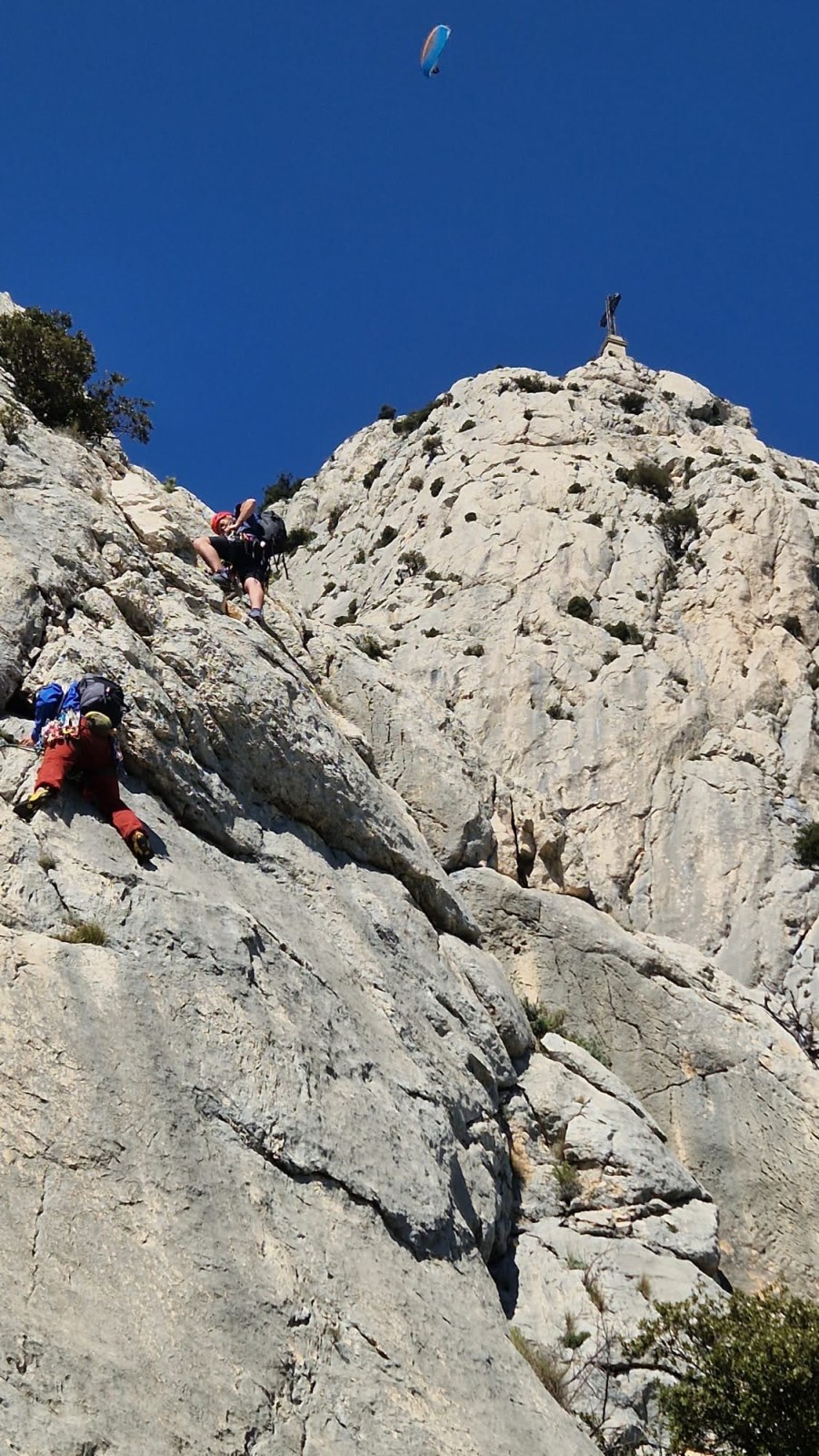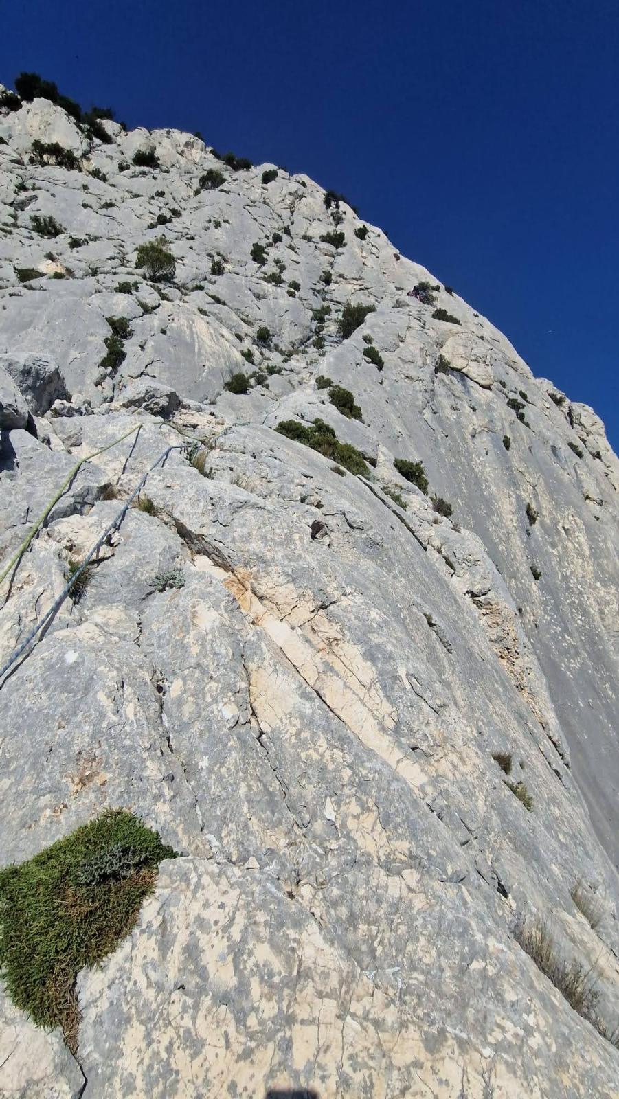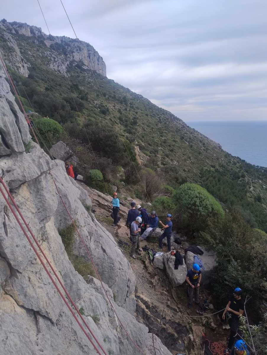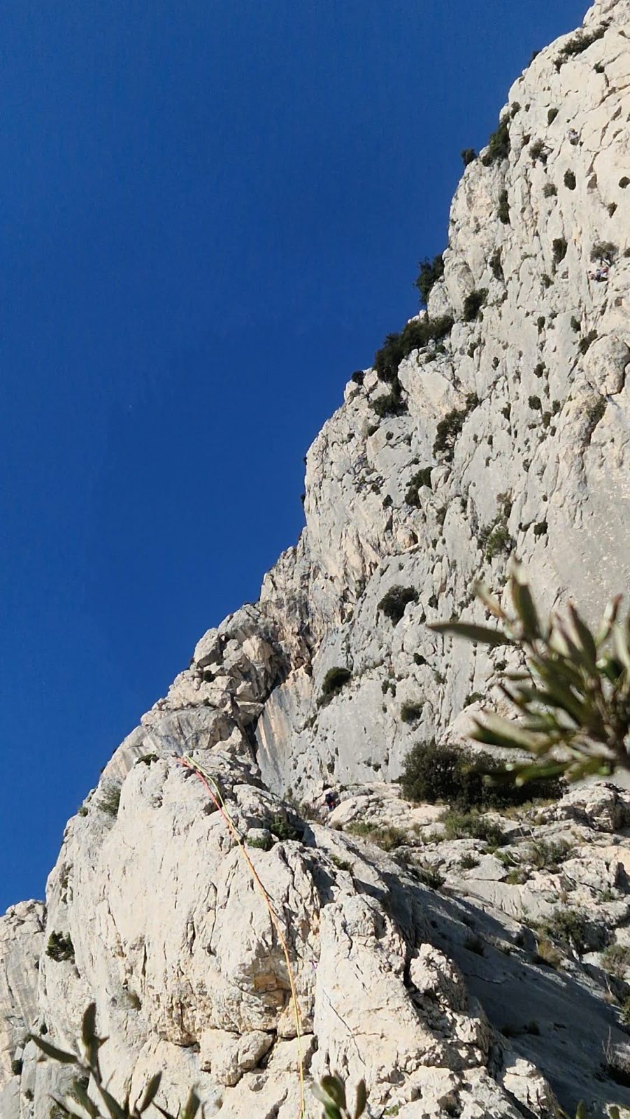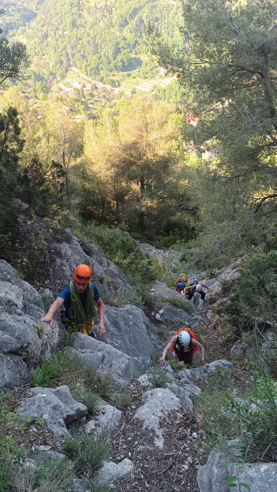 Il est donc 9h30 lorsque nous arrivons sur place, le soleil nous illumine de ses doux rayons matinaux et la mer agitée témoigne qu’ici le vent a soufflé fort ces derniers jours. Après la distribution des dégaines, des dynaloops, des systèmes d’assurage, des casques et des indispensables mousquetons de sécurité, nous voilà partis à 26 en file indienne sur la courte marche d’approche nous menant aux pieds des différentes grandes voies. D’autres cordées du CAF de Montauroux ont les mêmes ambitions que nous et, ayant lu mon post sur Facebook prévenant qu’on allait être très nombreux, sont arrivés quelques minutes avant, nous offrant le temps de réviser une dernière fois les manips histoire de se rassurer et de limiter les erreurs possibles.