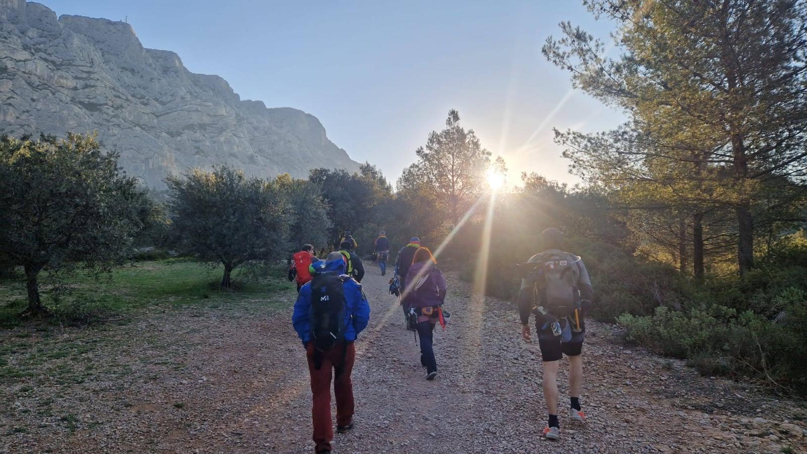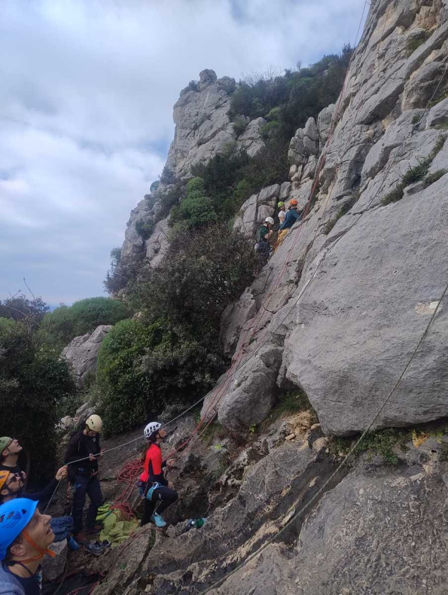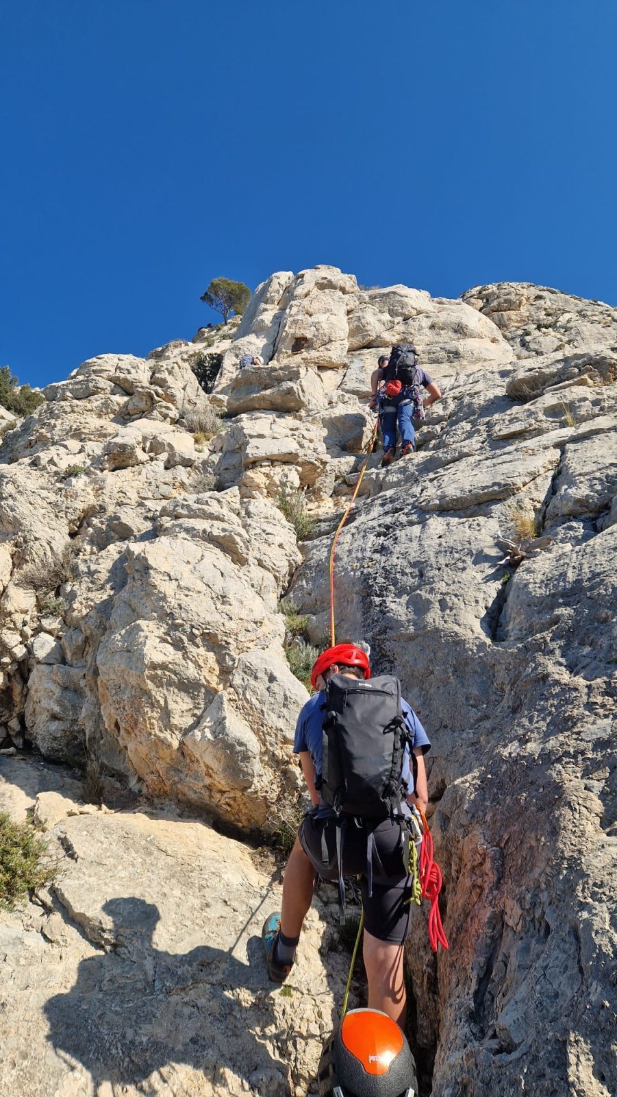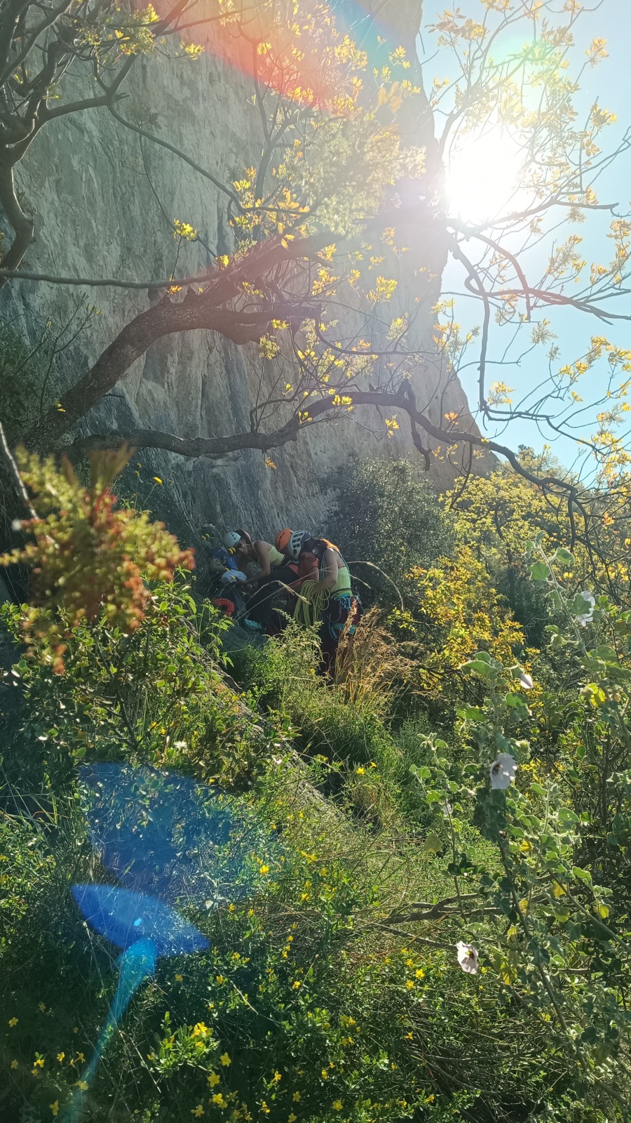 Il est donc 9h30 lorsque nous arrivons sur place, le soleil nous illumine de ses doux rayons matinaux et la mer agitée témoigne qu’ici le vent a soufflé fort ces derniers jours. Après la distribution des dégaines, des dynaloops, des systèmes d’assurage, des casques et des indispensables mousquetons de sécurité, nous voilà partis à 26 en file indienne sur la courte marche d’approche nous menant aux pieds des différentes grandes voies. D’autres cordées du CAF de Montauroux ont les mêmes ambitions que nous et, ayant lu mon post sur Facebook prévenant qu’on allait être très nombreux, sont arrivés quelques minutes avant, nous offrant le temps de réviser une dernière fois les manips histoire de se rassurer et de limiter les erreurs possibles.