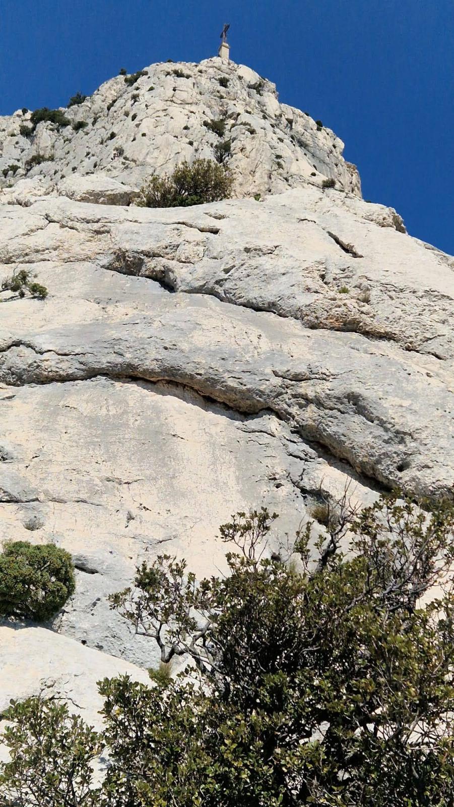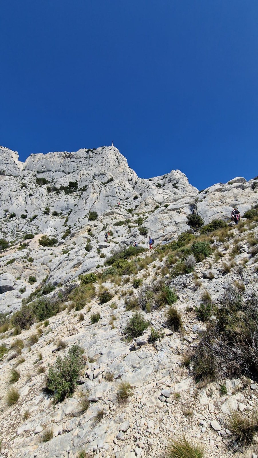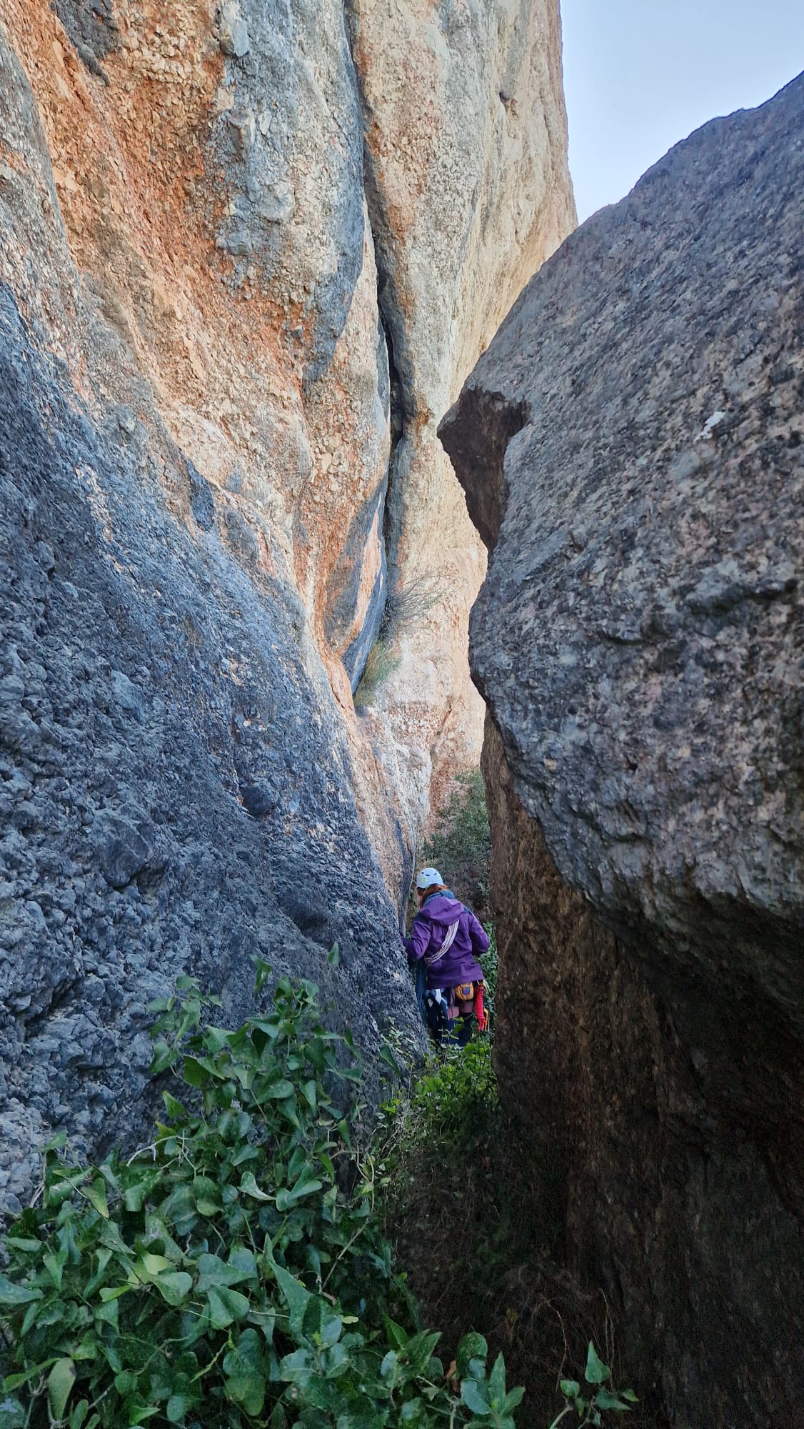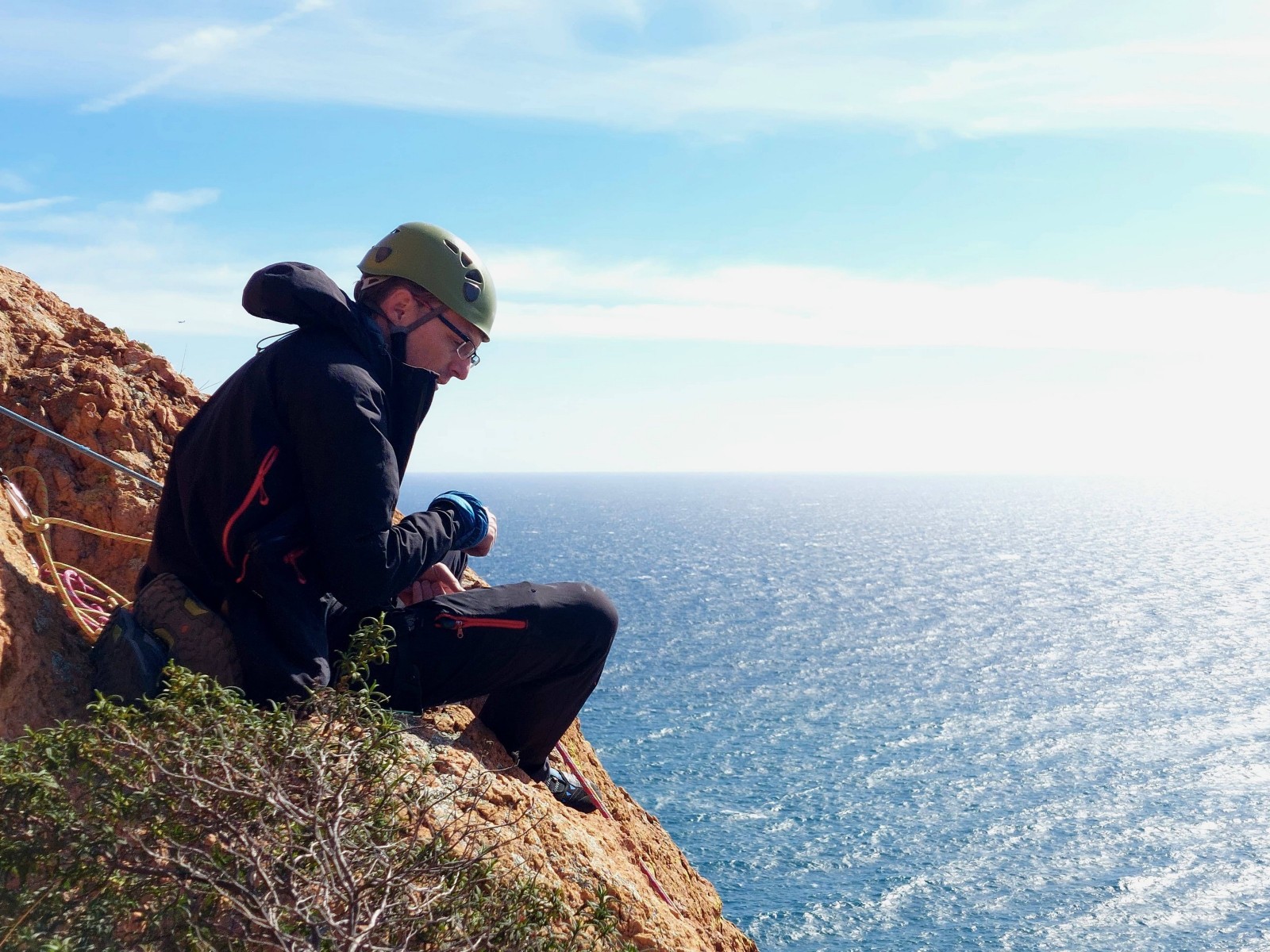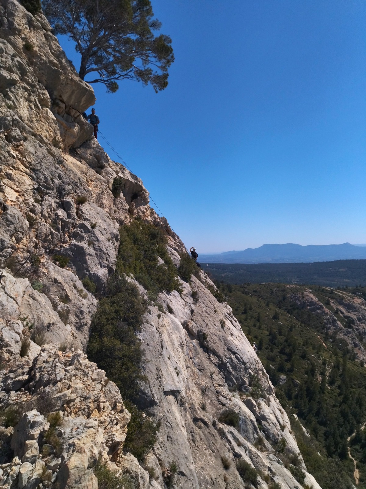 Il est donc 9h30 lorsque nous arrivons sur place, le soleil nous illumine de ses doux rayons matinaux et la mer agitée témoigne qu’ici le vent a soufflé fort ces derniers jours. Après la distribution des dégaines, des dynaloops, des systèmes d’assurage, des casques et des indispensables mousquetons de sécurité, nous voilà partis à 26 en file indienne sur la courte marche d’approche nous menant aux pieds des différentes grandes voies. D’autres cordées du CAF de Montauroux ont les mêmes ambitions que nous et, ayant lu mon post sur Facebook prévenant qu’on allait être très nombreux, sont arrivés quelques minutes avant, nous offrant le temps de réviser une dernière fois les manips histoire de se rassurer et de limiter les erreurs possibles.