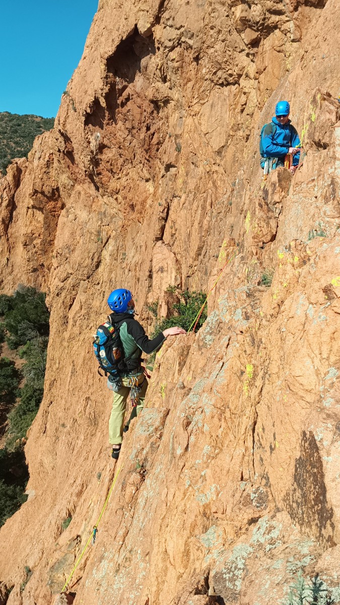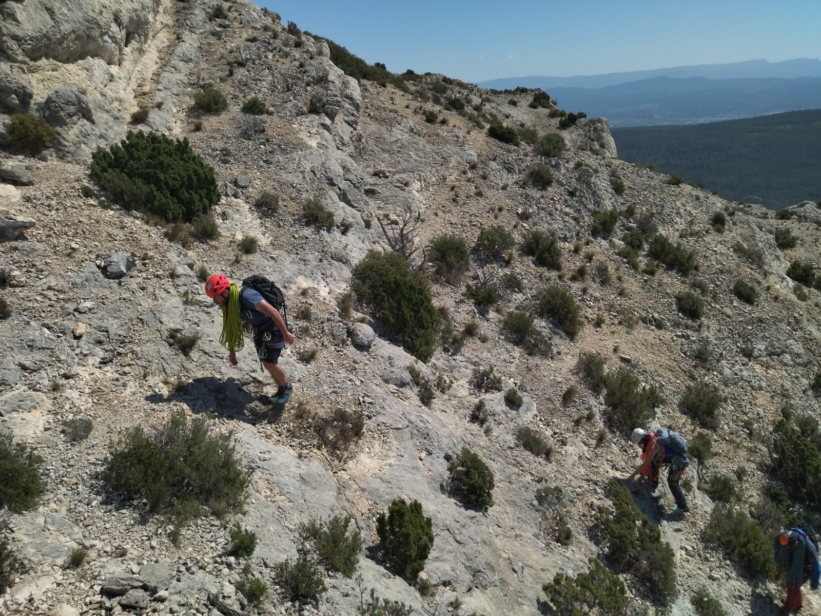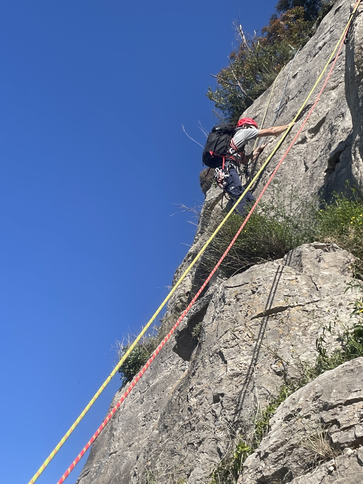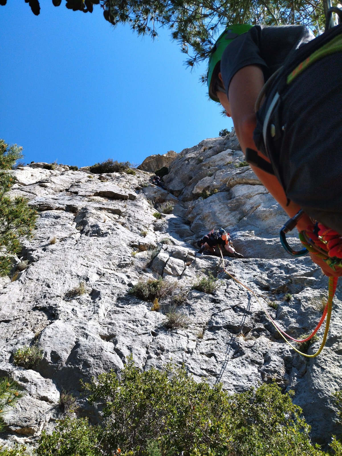 Nous avions organisé deux sessions au gymnase pour initier aux manips d’assurage du haut et de rappel mais on sait bien que c’est loin d’être suffisant pour être à l’aise et éviter les erreurs. Le jeu pour moi était donc d’organiser des cordées avec un grimpeur autonome à chaque fois, tout en gérant les choix des voies de chacun et le niveau de difficulté, sans faire d’embouteillages trop important ! Un joli casse-tête que Julien m’a aidé à résoudre la veille, histoire de ne pas perdre trop de temps au pied des voies. Je tiens aussi ici à remercier les ouvreurs des voies de niveau abordable et plutôt bien équipées ! Elles traversent des systèmes de vires et terrasses qui rendent la supervision et l’adaptation pas trop compliquées, c’est vraiment super !