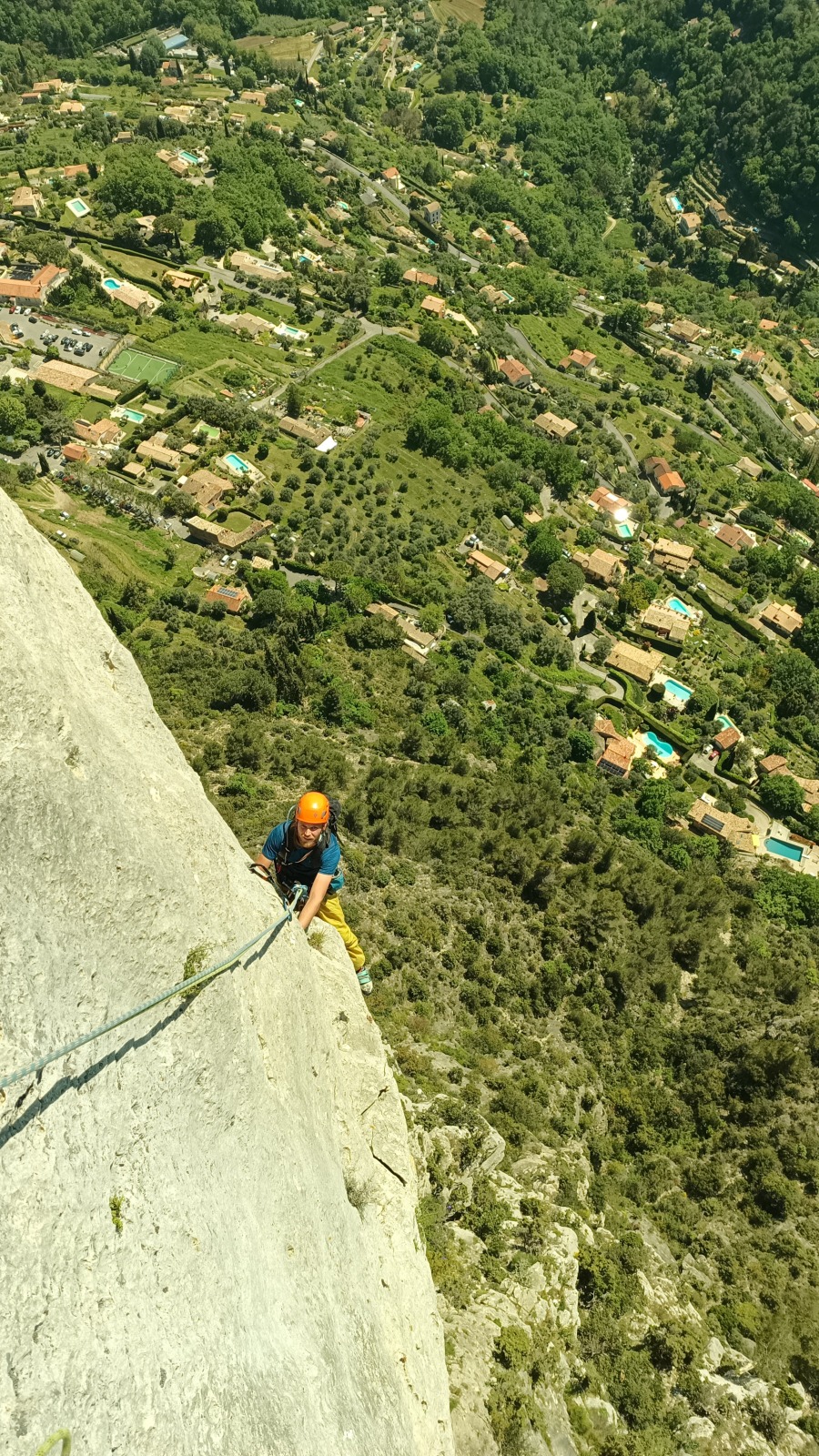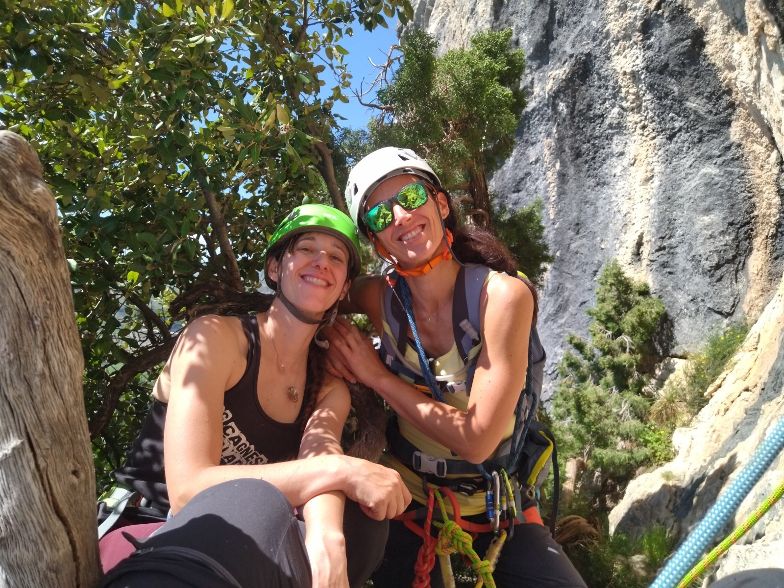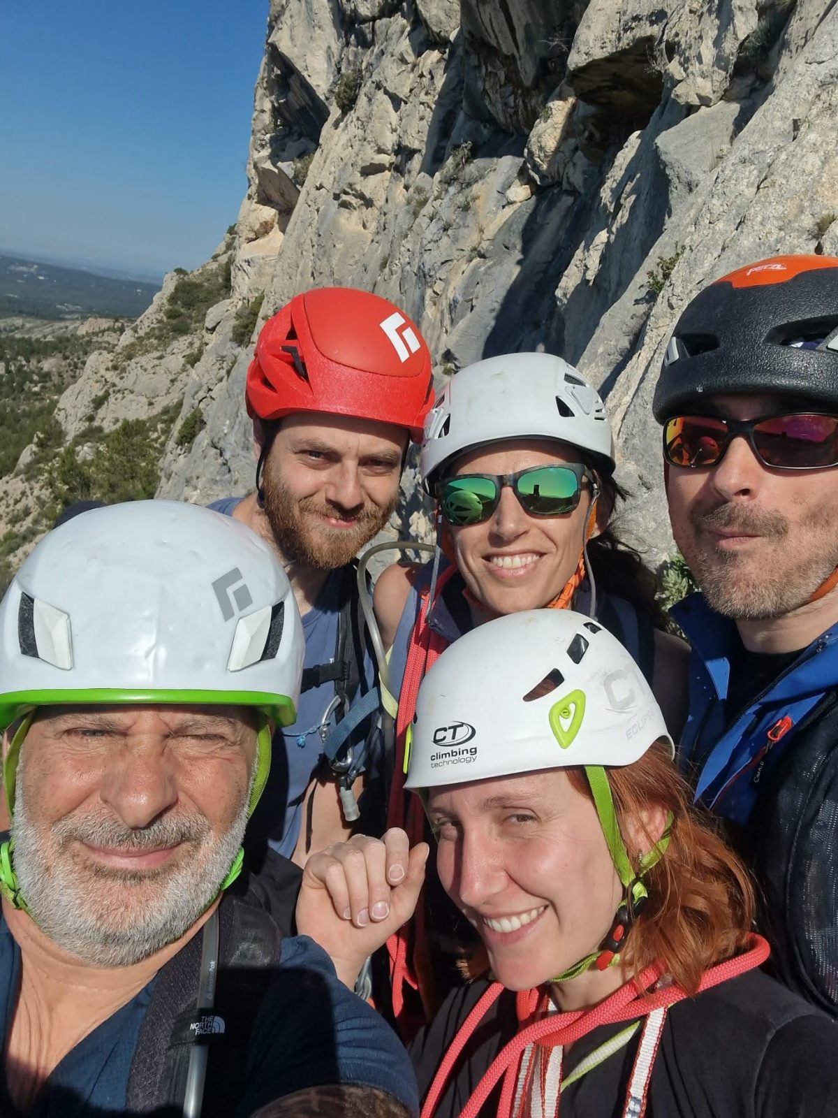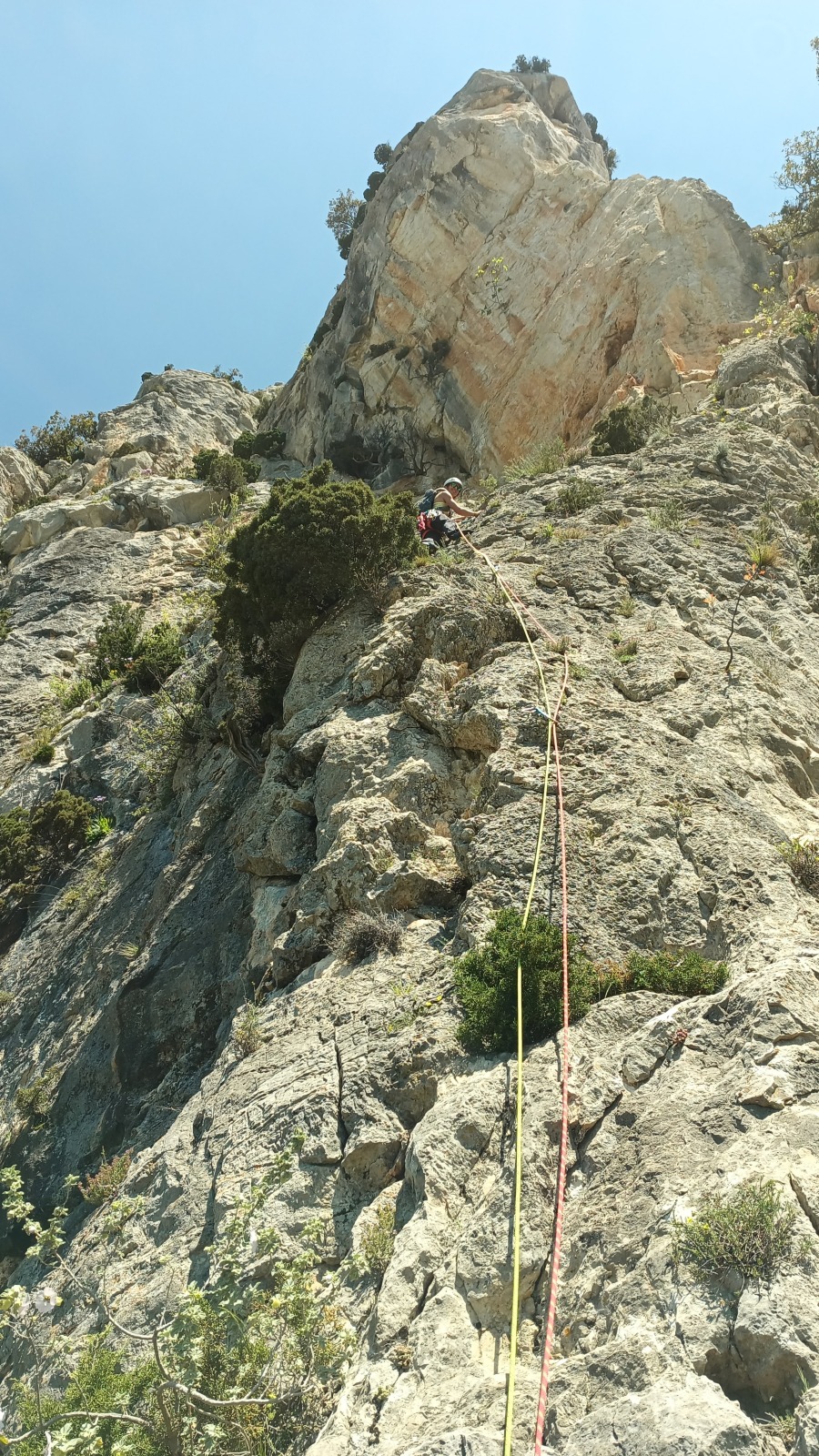 Nous avions organisé deux sessions au gymnase pour initier aux manips d’assurage du haut et de rappel mais on sait bien que c’est loin d’être suffisant pour être à l’aise et éviter les erreurs. Le jeu pour moi était donc d’organiser des cordées avec un grimpeur autonome à chaque fois, tout en gérant les choix des voies de chacun et le niveau de difficulté, sans faire d’embouteillages trop important ! Un joli casse-tête que Julien m’a aidé à résoudre la veille, histoire de ne pas perdre trop de temps au pied des voies. Je tiens aussi ici à remercier les ouvreurs des voies de niveau abordable et plutôt bien équipées ! Elles traversent des systèmes de vires et terrasses qui rendent la supervision et l’adaptation pas trop compliquées, c’est vraiment super !