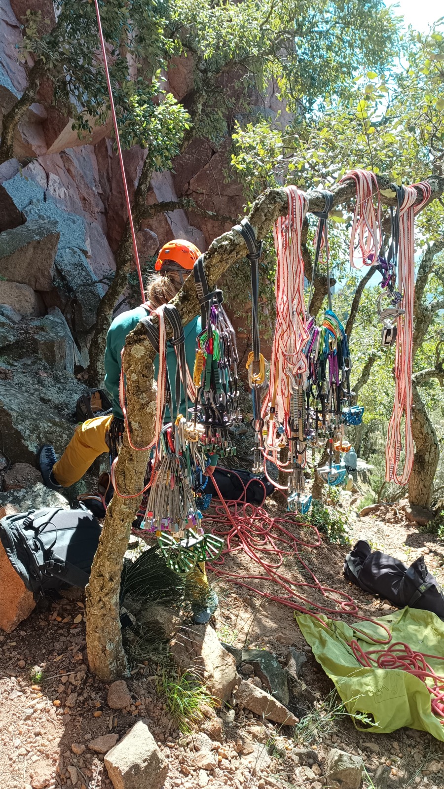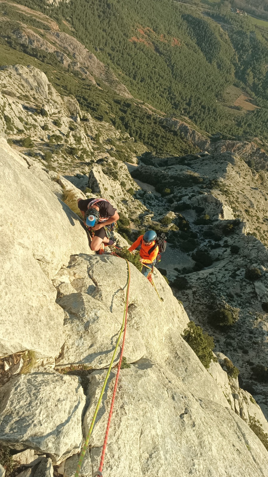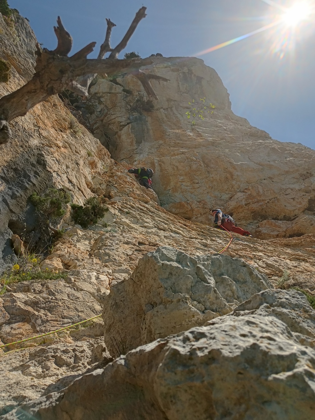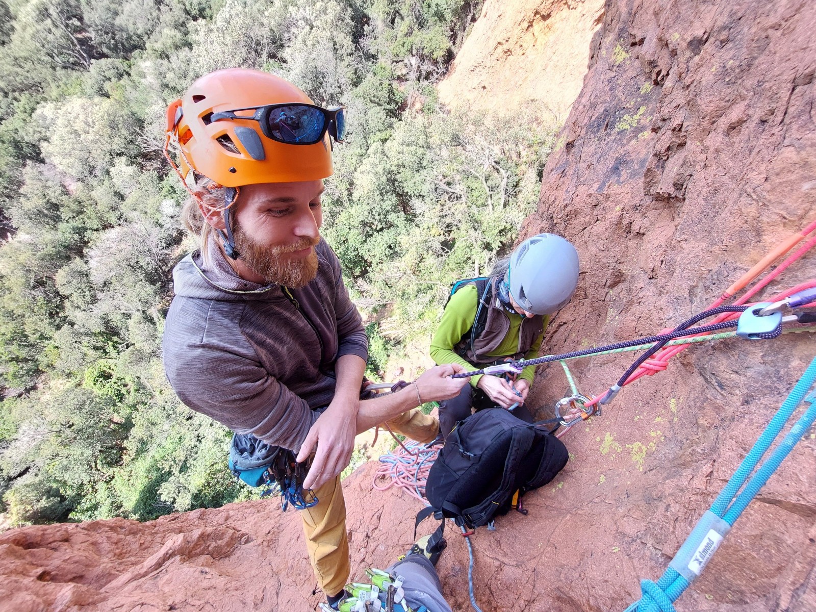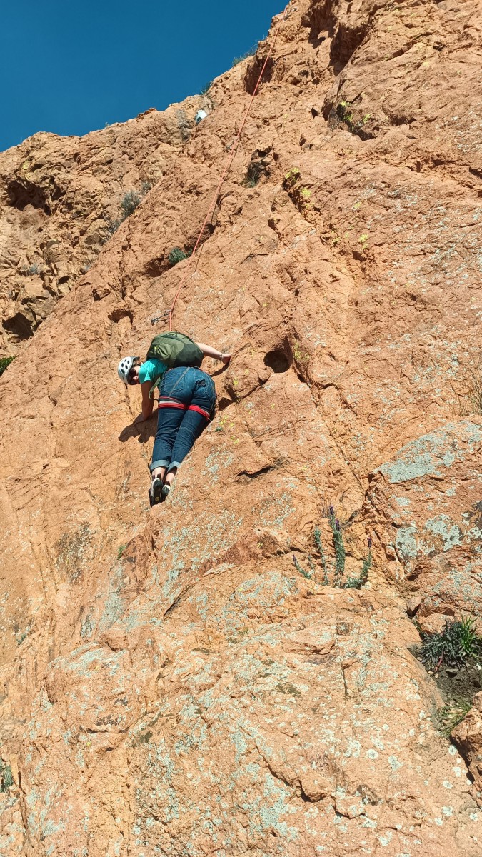 Nous avions organisé deux sessions au gymnase pour initier aux manips d’assurage du haut et de rappel mais on sait bien que c’est loin d’être suffisant pour être à l’aise et éviter les erreurs. Le jeu pour moi était donc d’organiser des cordées avec un grimpeur autonome à chaque fois, tout en gérant les choix des voies de chacun et le niveau de difficulté, sans faire d’embouteillages trop important ! Un joli casse-tête que Julien m’a aidé à résoudre la veille, histoire de ne pas perdre trop de temps au pied des voies. Je tiens aussi ici à remercier les ouvreurs des voies de niveau abordable et plutôt bien équipées ! Elles traversent des systèmes de vires et terrasses qui rendent la supervision et l’adaptation pas trop compliquées, c’est vraiment super !
