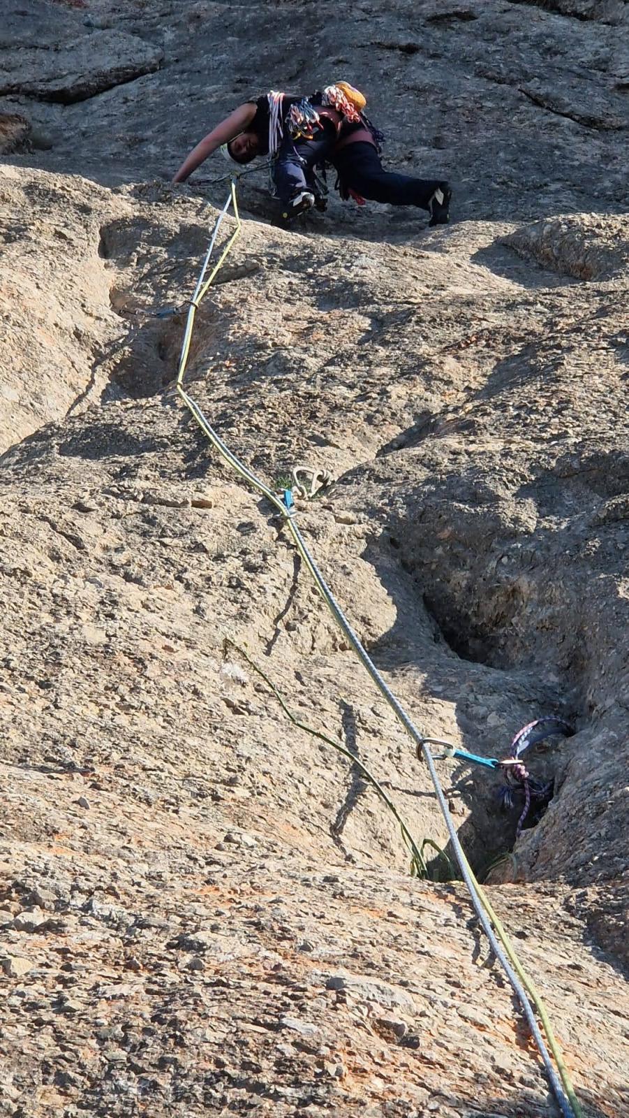 Juste à côté, Philippe est déjà à son R4 car le Tracas part de plus bas que les autres. Il est en cordée avec Jean-Luc, compagnon de toujours, et ont pour consigne de vérifier les manips d’Eponine et David derrière eux, sous la supervision d’Alexis. Eponine qui, par ailleurs, fait sa première voie en tête sur du caillou et apprend à poser des dégaines ! Tout va bien de ce côté.