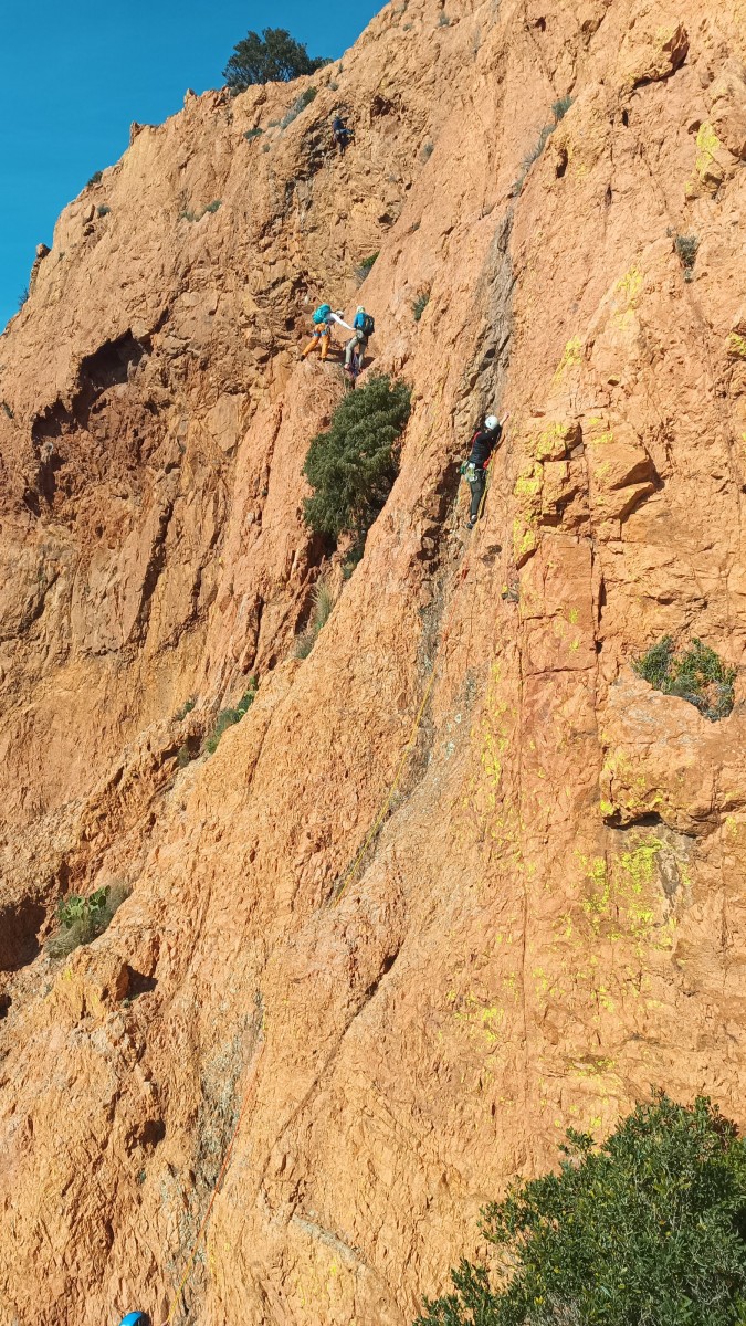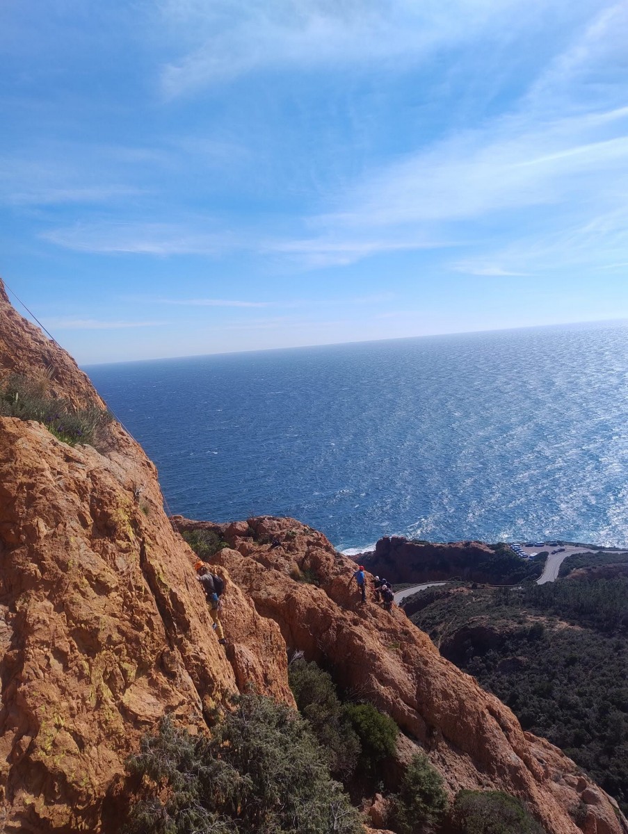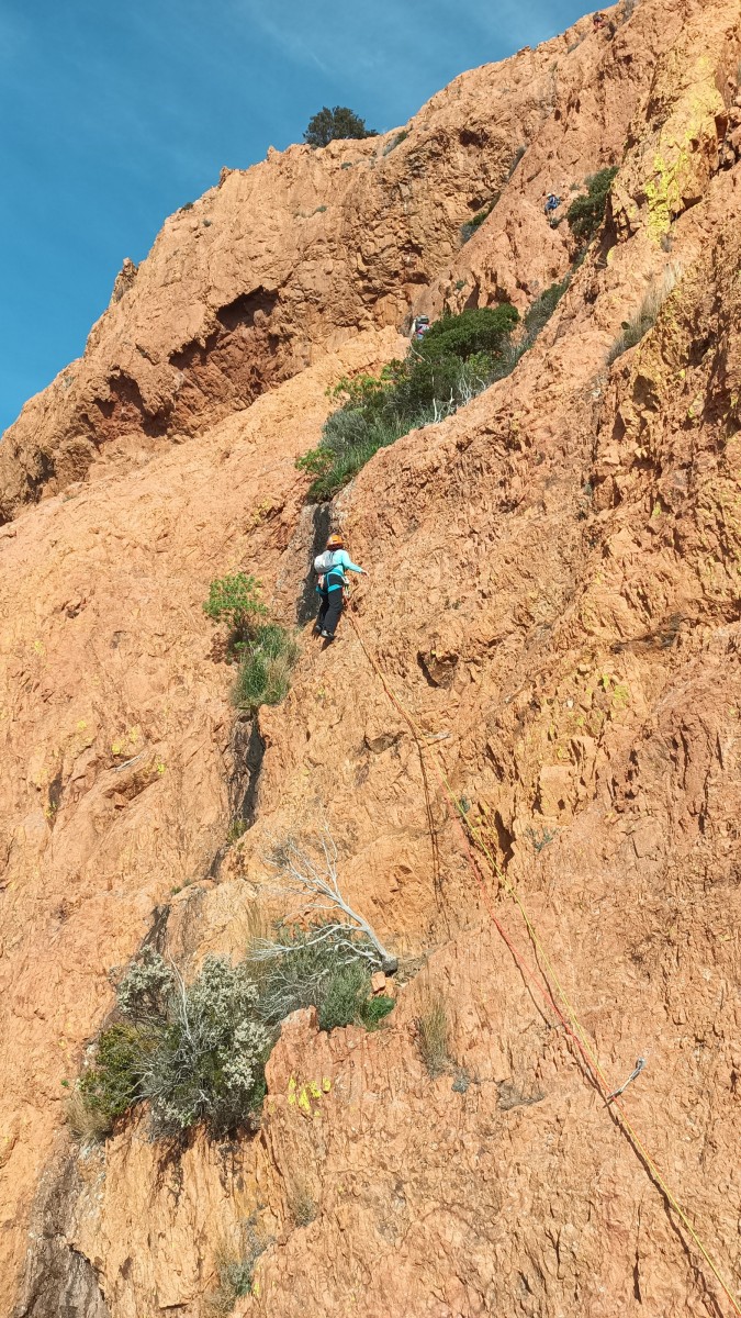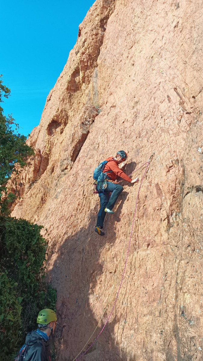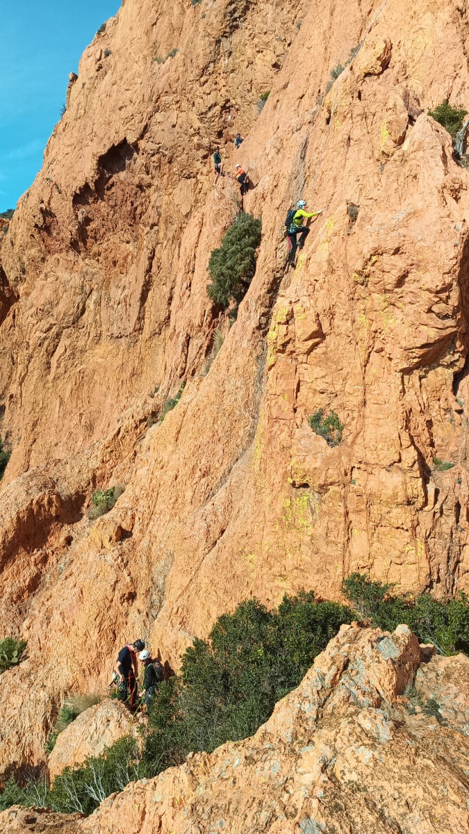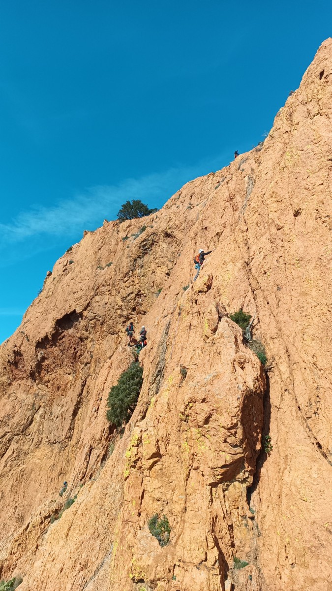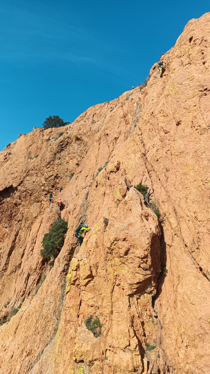 Ce week-end, ils étaient 24 grimpeur·ses du club à apprécier bronzer sur les parois du rocher St Barthélémy, sur la bien nommée corniche d’or, entre Mandelieu et St Raphaël. 24 grimpeur·ses de niveaux divers, certains à l’expérience confirmée, d’autres qui découvraient l’activité quelques semaines auparavant.