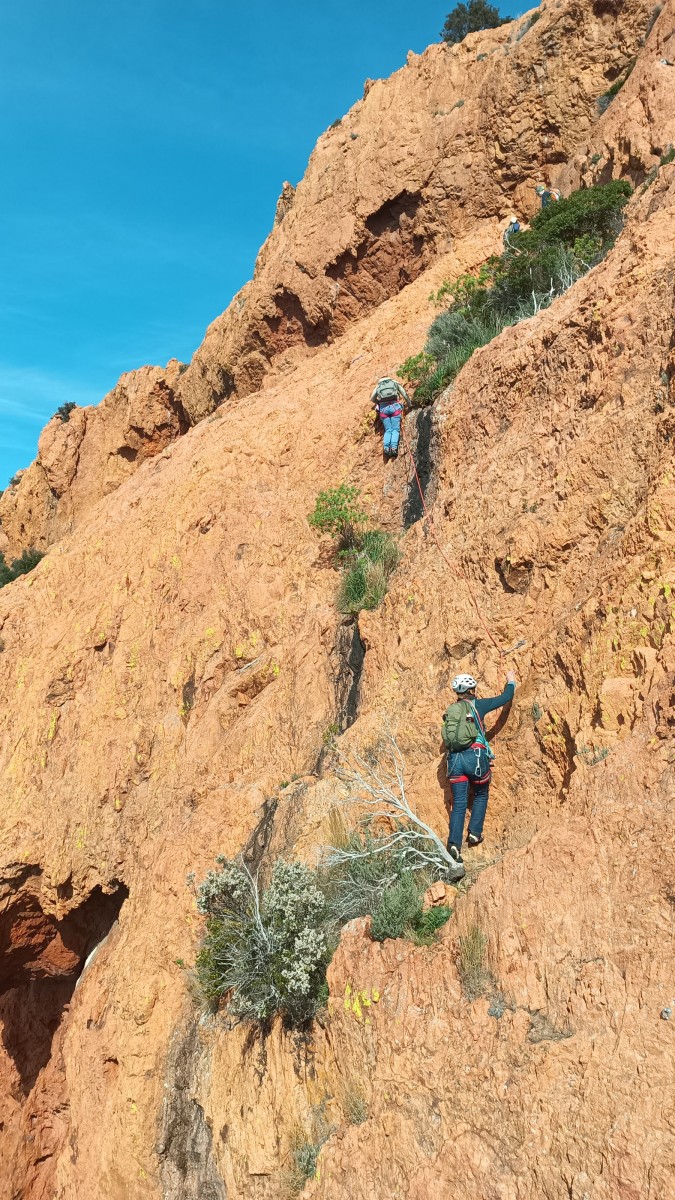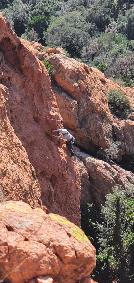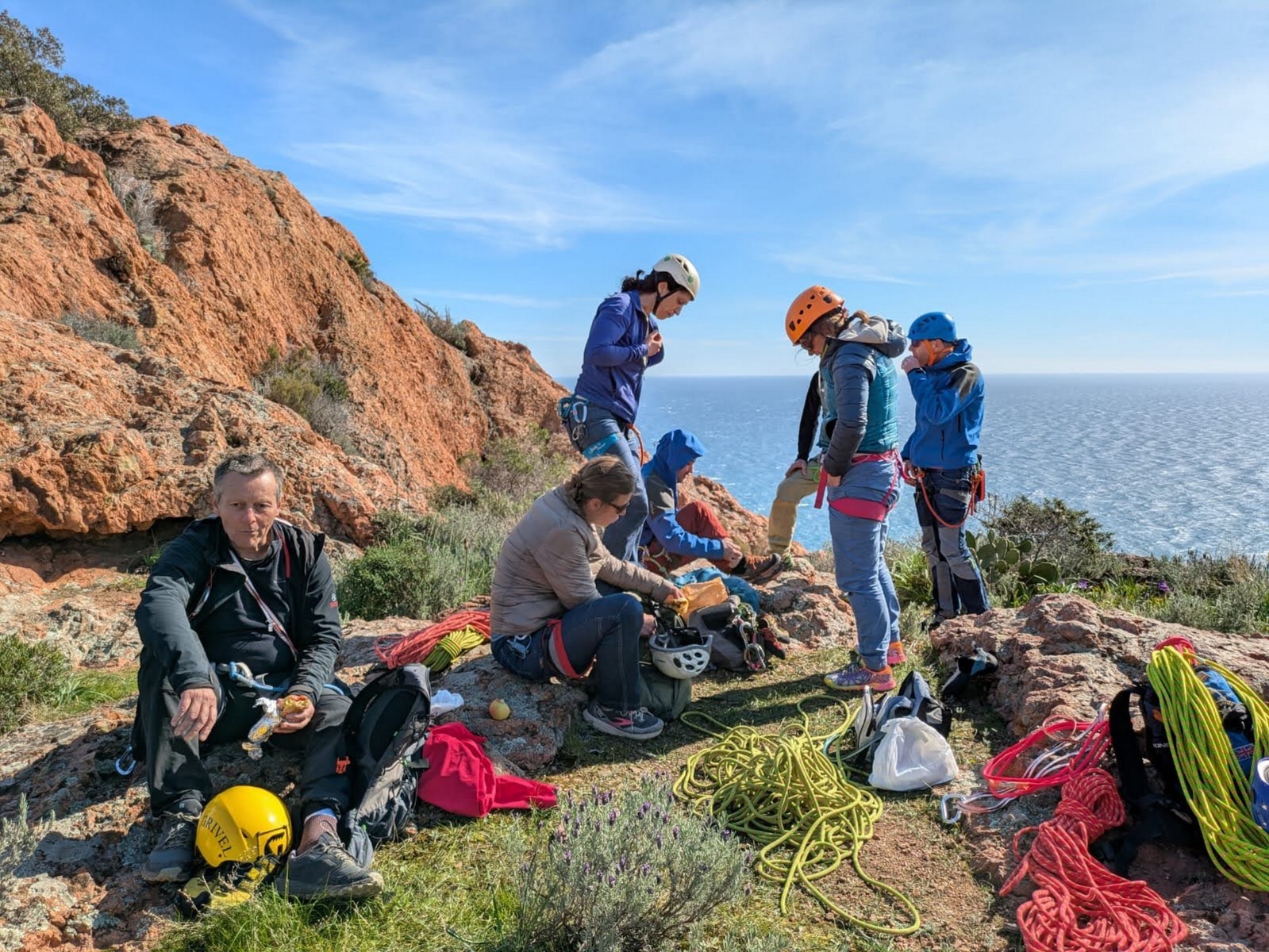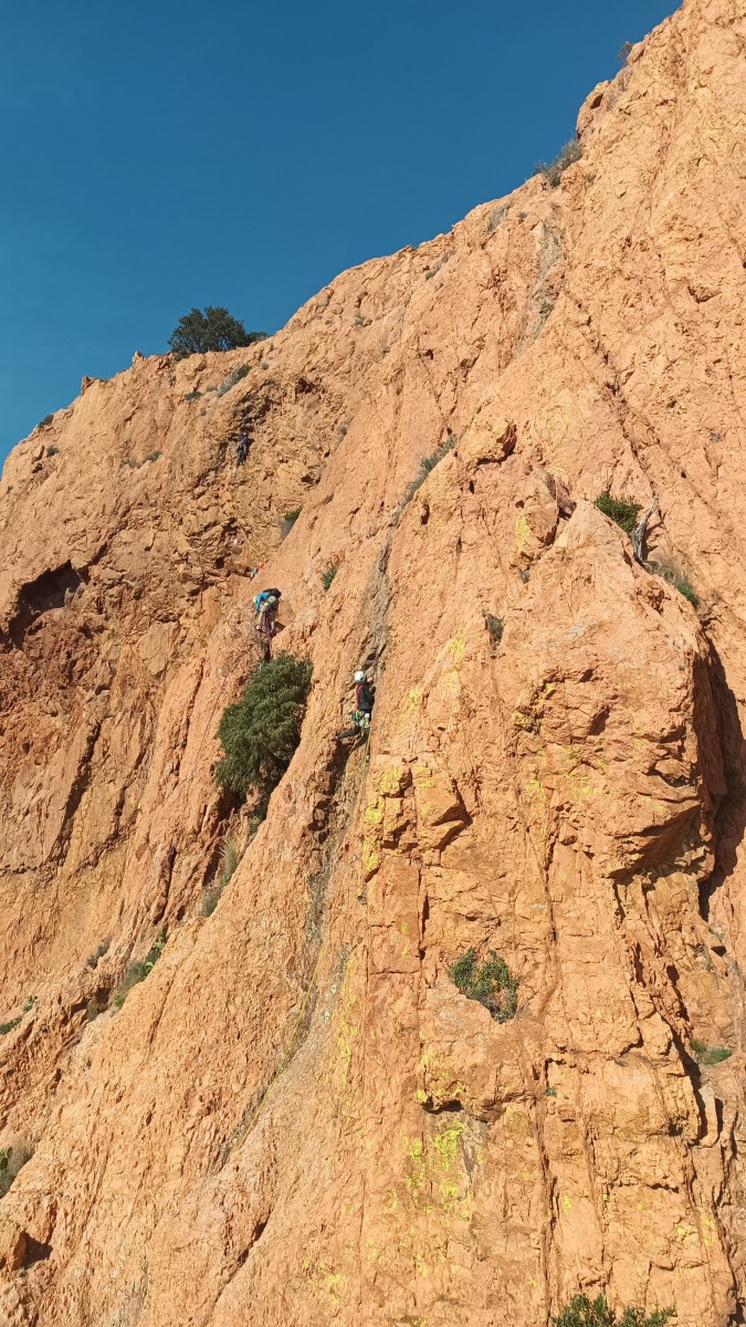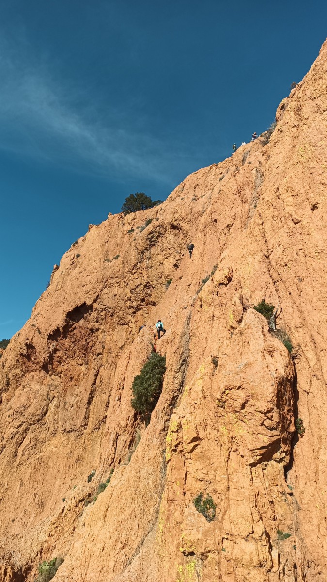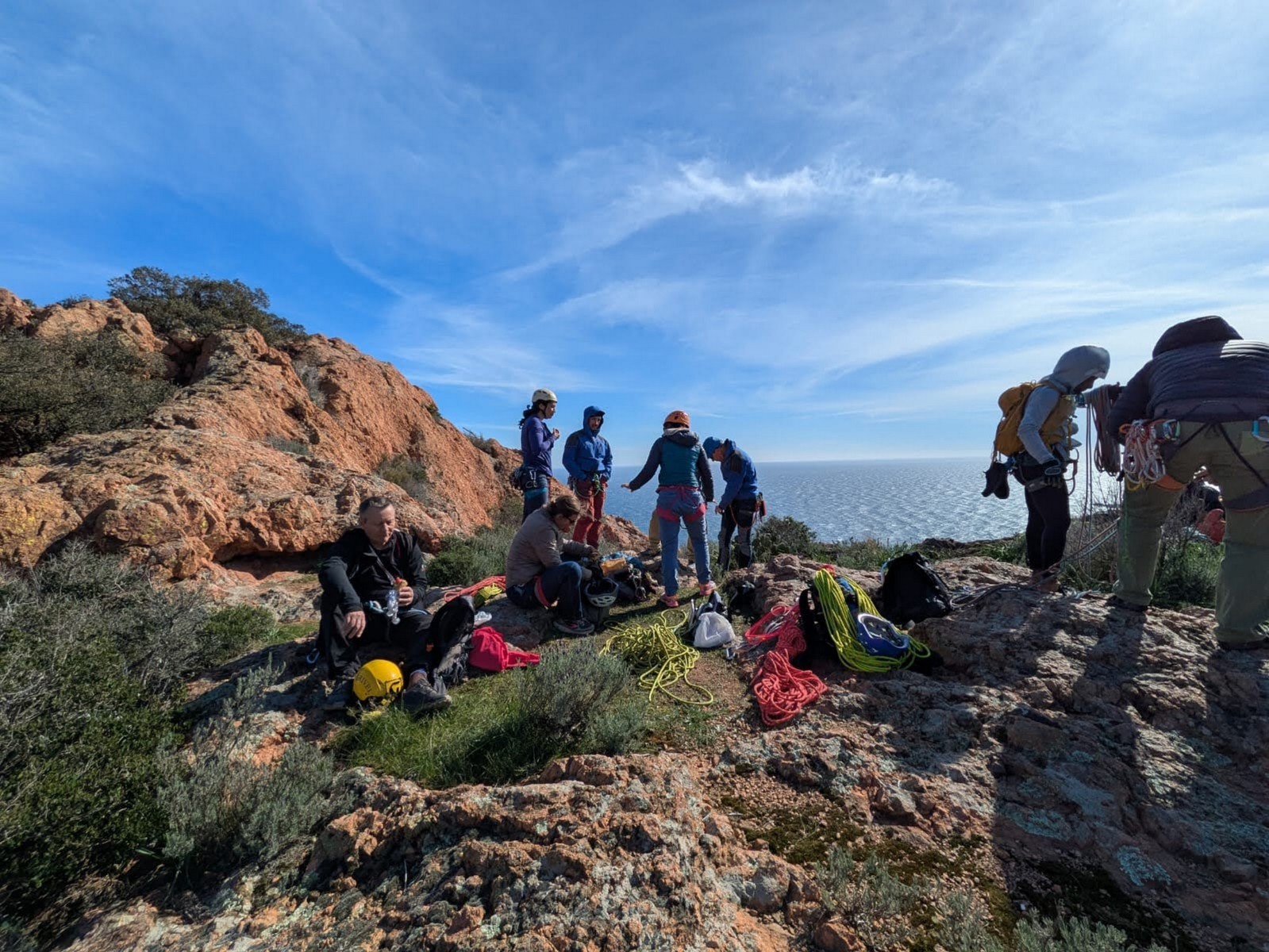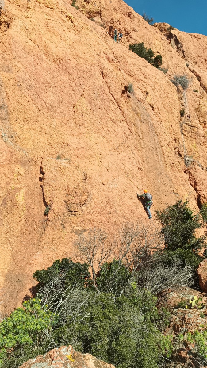Ce week-end, ils étaient 24 grimpeur·ses du club à apprécier bronzer sur les parois du rocher St Barthélémy, sur la bien nommée corniche d’or, entre Mandelieu et St Raphaël. 24 grimpeur·ses de niveaux divers, certains à l’expérience confirmée, d’autres qui découvraient l’activité quelques semaines auparavant.