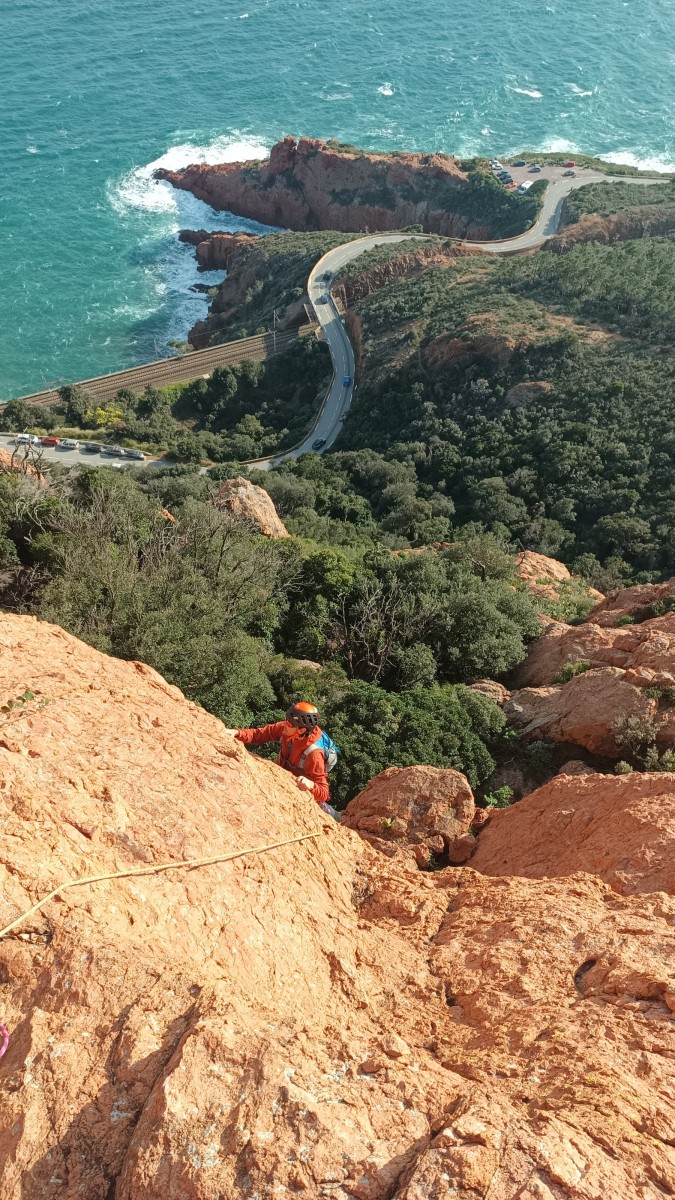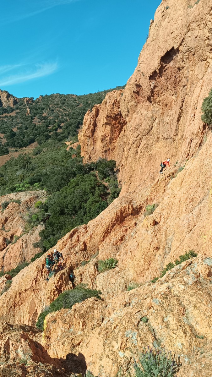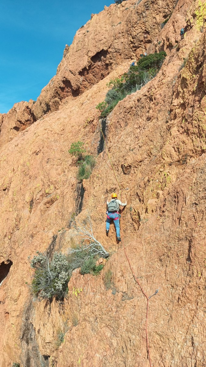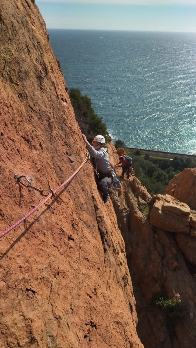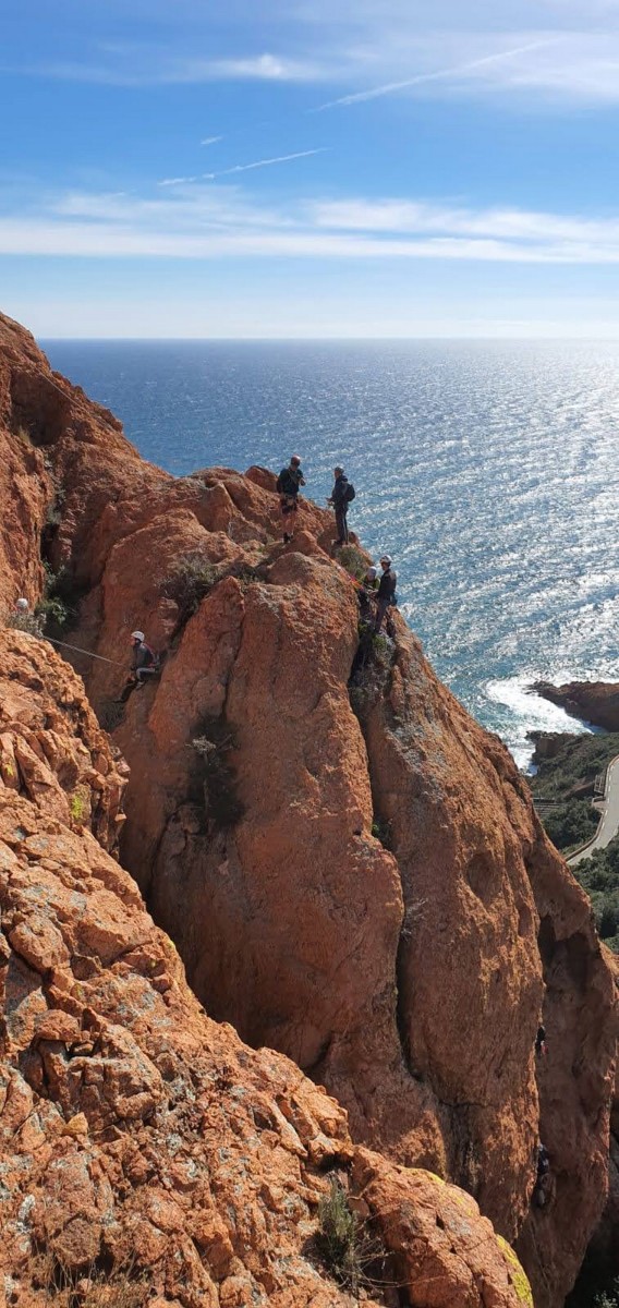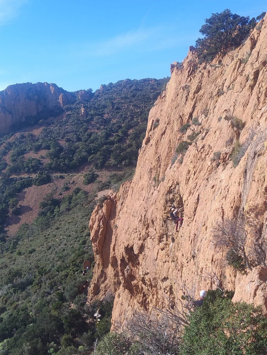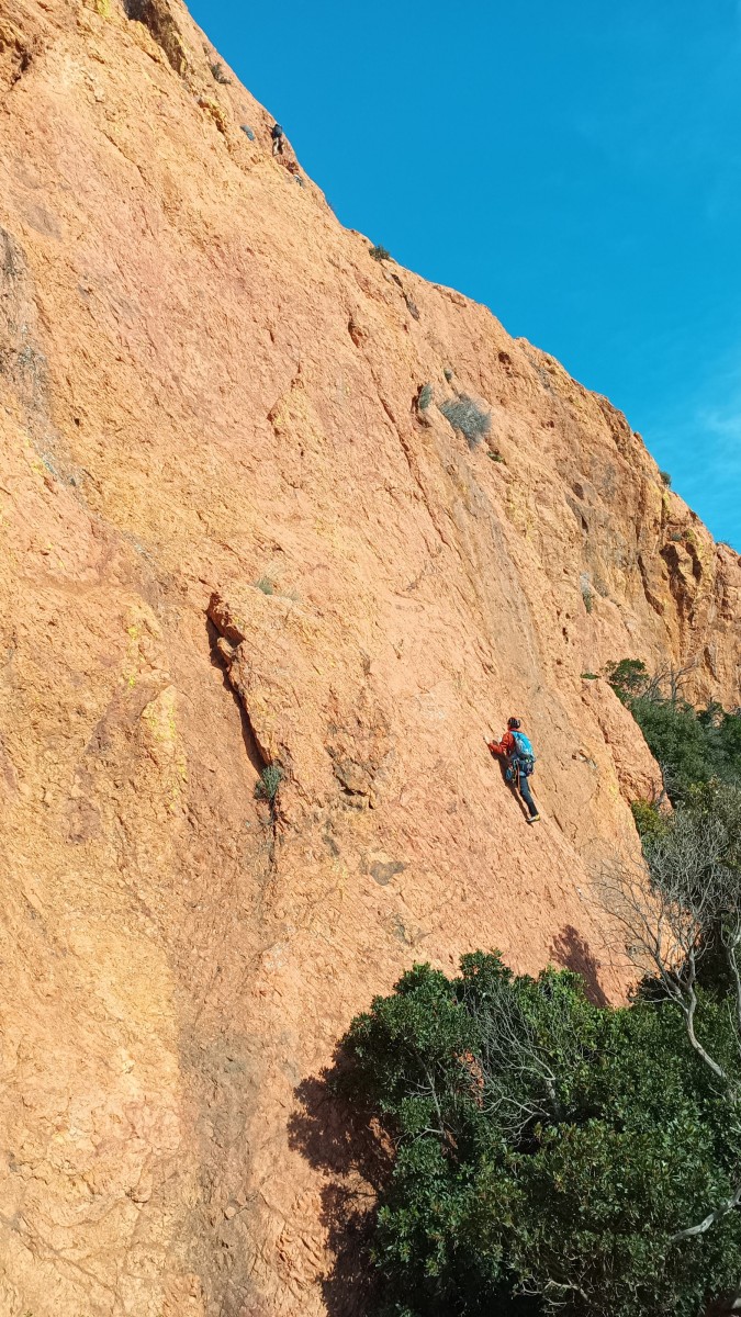 Ce week-end, ils étaient 24 grimpeur·ses du club à apprécier bronzer sur les parois du rocher St Barthélémy, sur la bien nommée corniche d’or, entre Mandelieu et St Raphaël. 24 grimpeur·ses de niveaux divers, certains à l’expérience confirmée, d’autres qui découvraient l’activité quelques semaines auparavant.