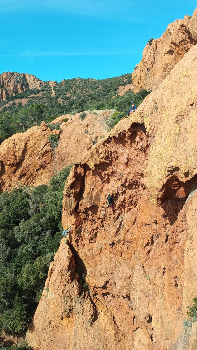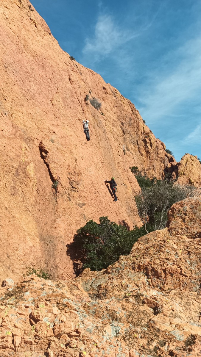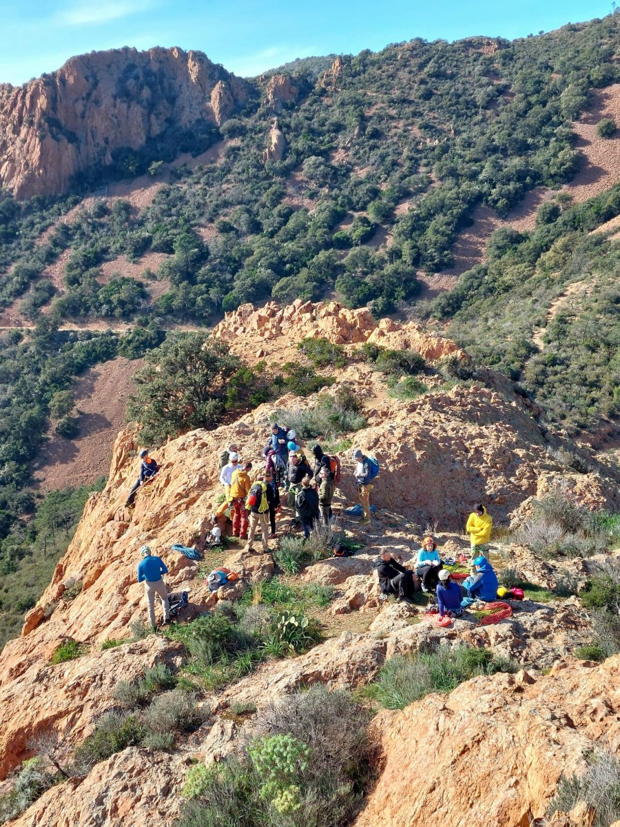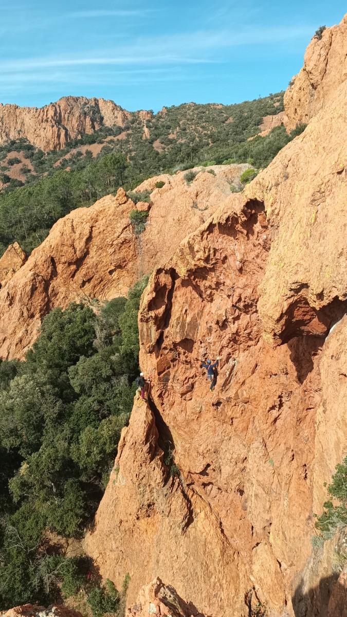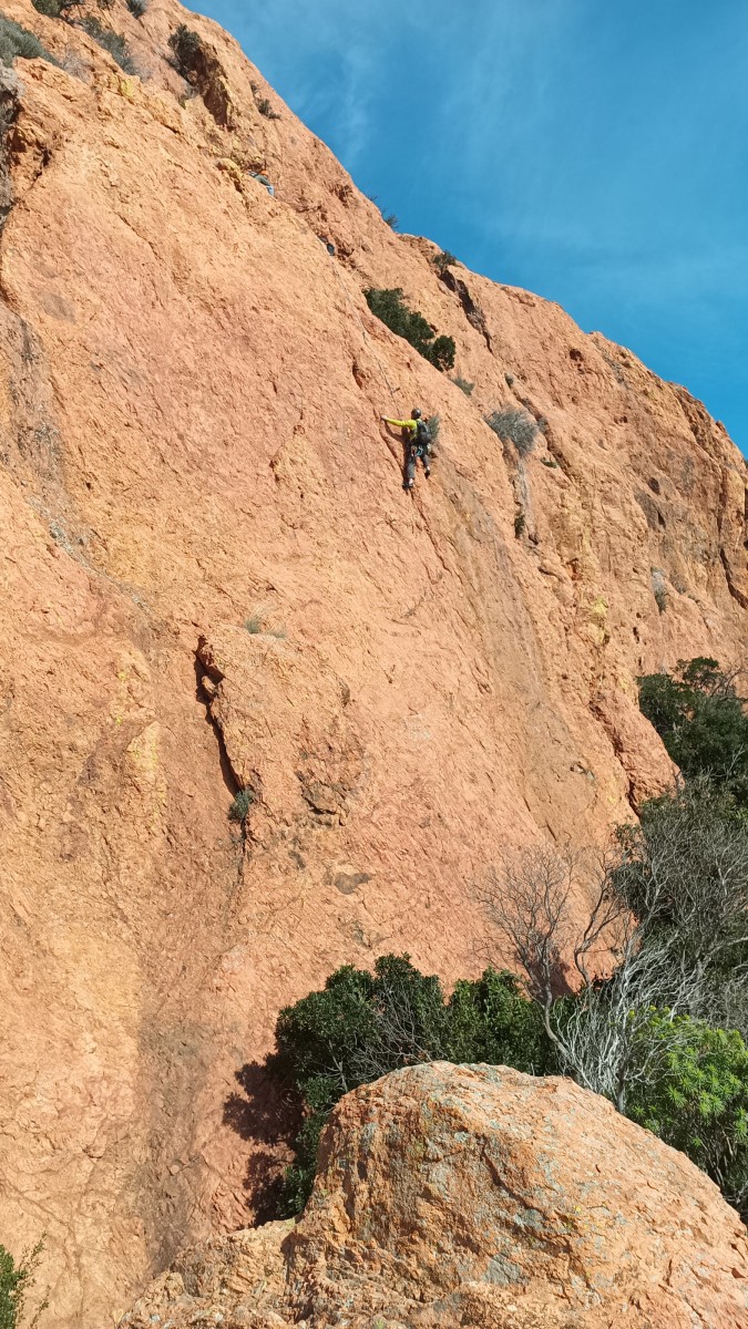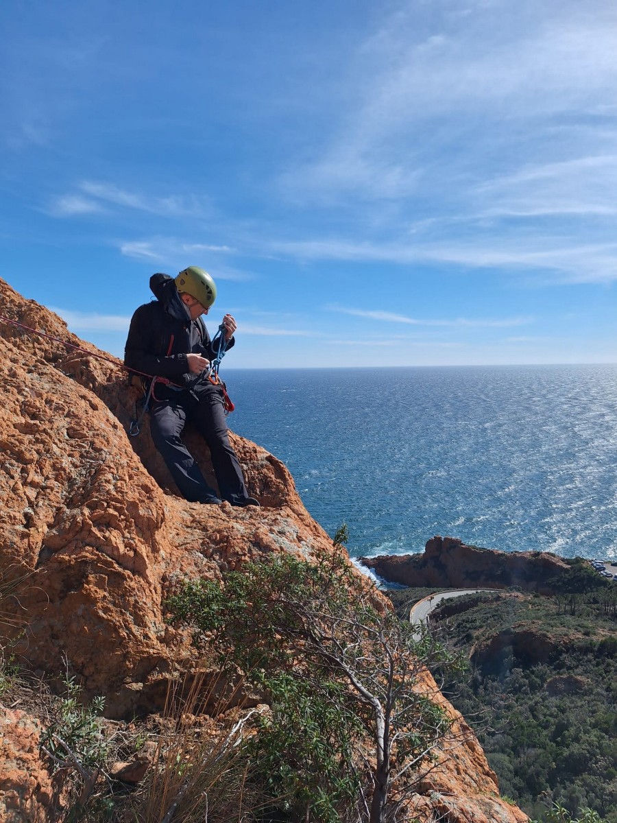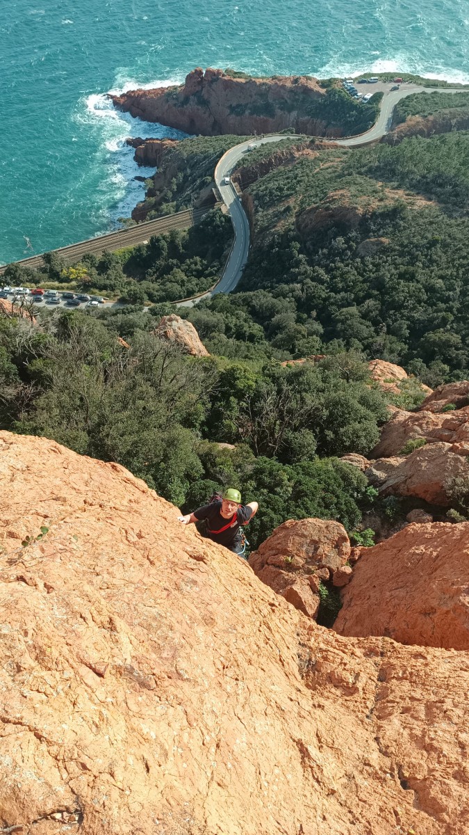Ce week-end, ils étaient 24 grimpeur·ses du club à apprécier bronzer sur les parois du rocher St Barthélémy, sur la bien nommée corniche d’or, entre Mandelieu et St Raphaël. 24 grimpeur·ses de niveaux divers, certains à l’expérience confirmée, d’autres qui découvraient l’activité quelques semaines auparavant.