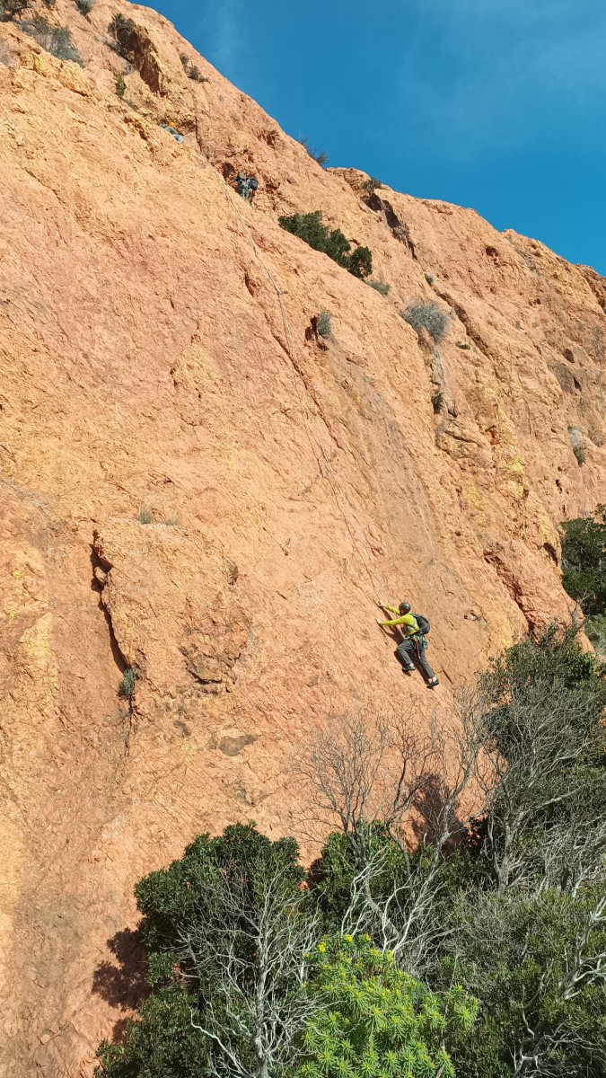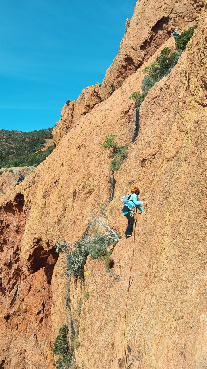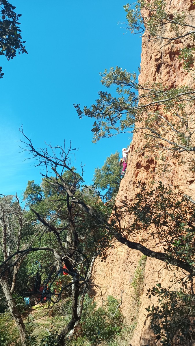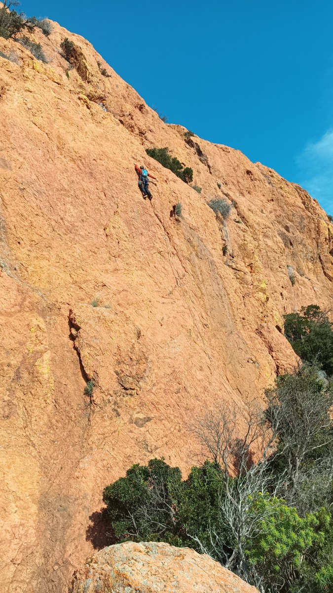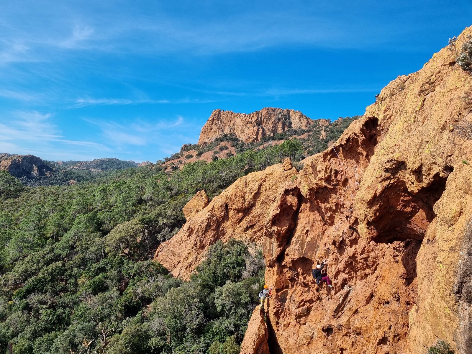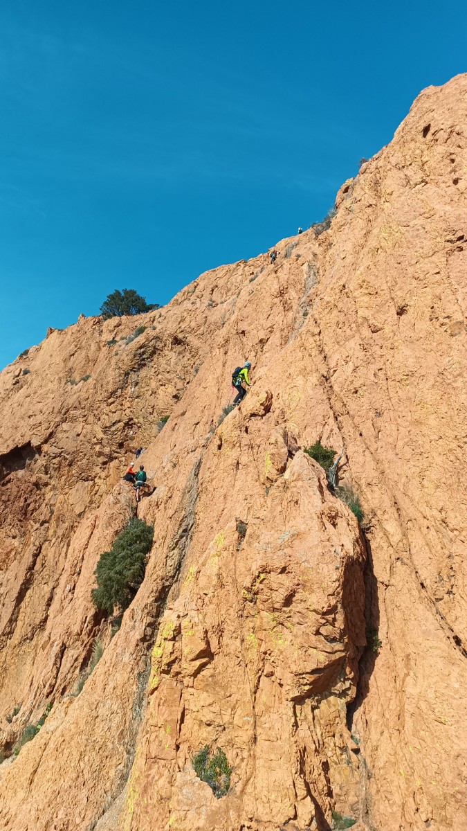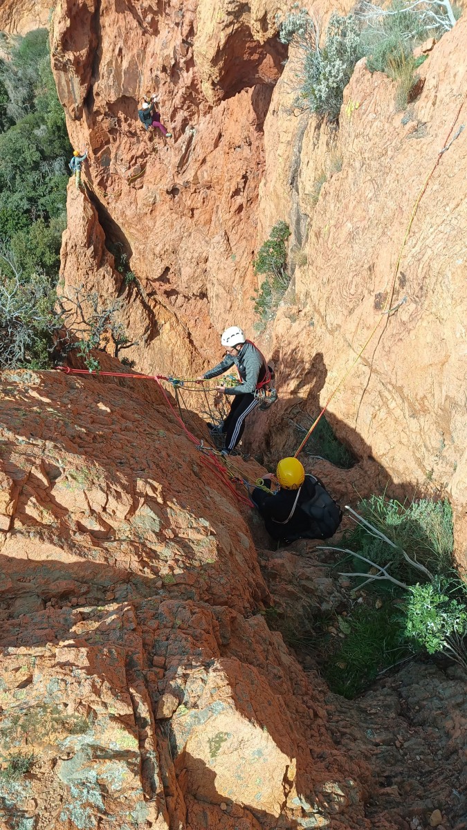 Ce week-end, ils étaient 24 grimpeur·ses du club à apprécier bronzer sur les parois du rocher St Barthélémy, sur la bien nommée corniche d’or, entre Mandelieu et St Raphaël. 24 grimpeur·ses de niveaux divers, certains à l’expérience confirmée, d’autres qui découvraient l’activité quelques semaines auparavant.