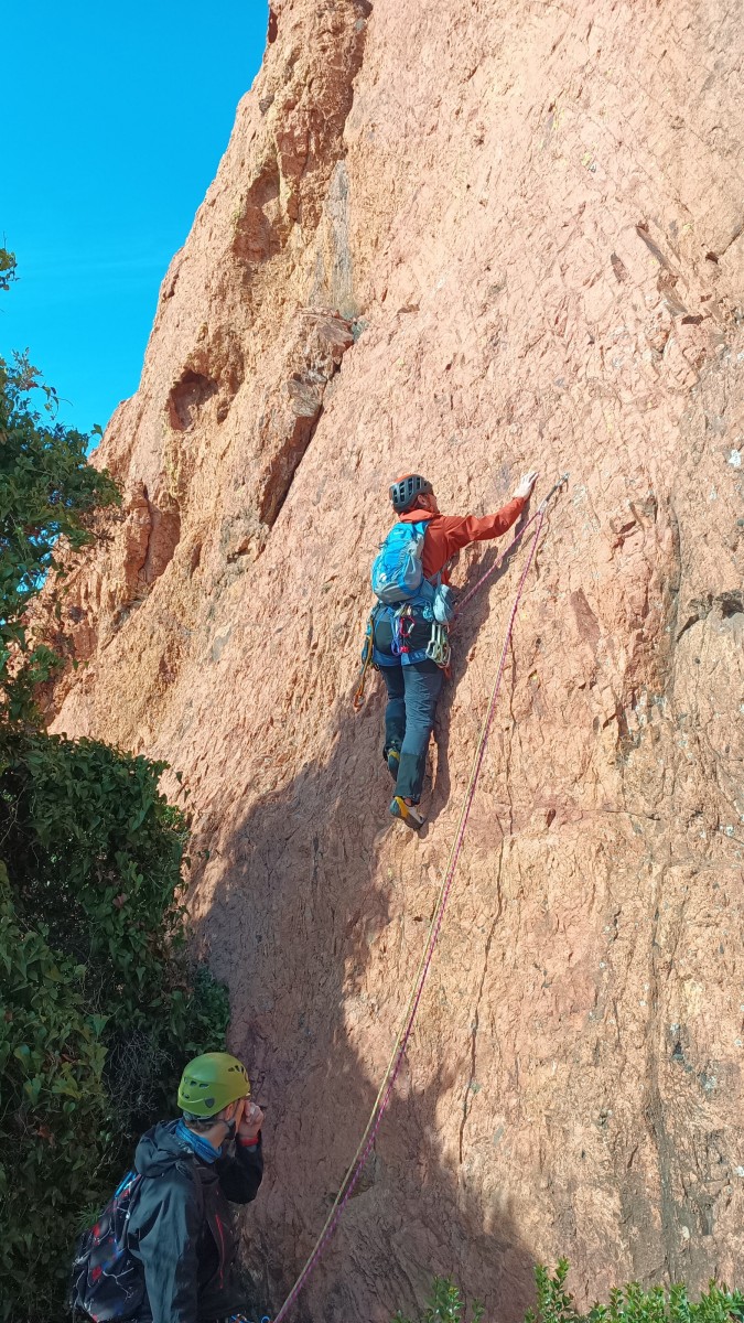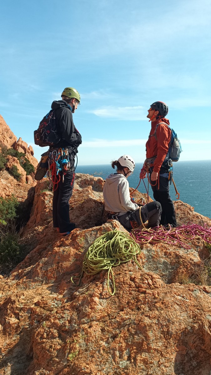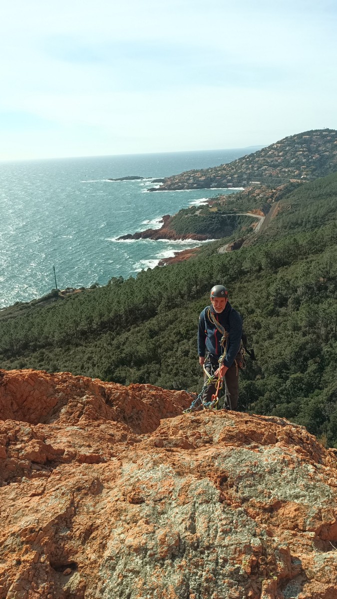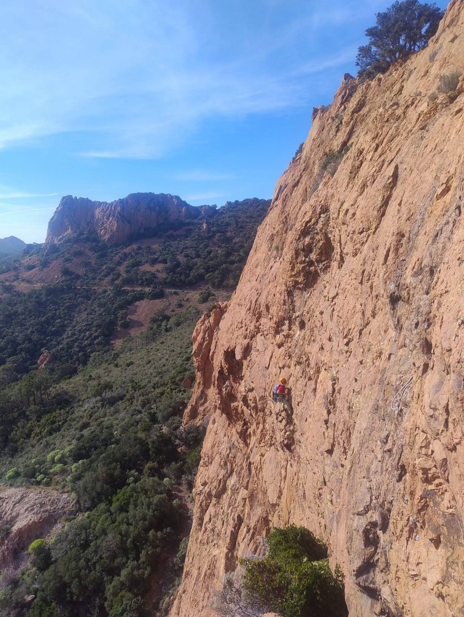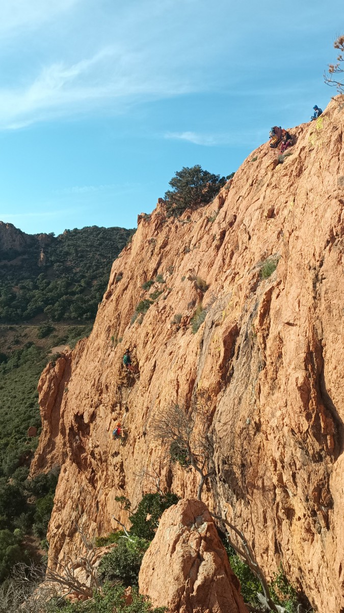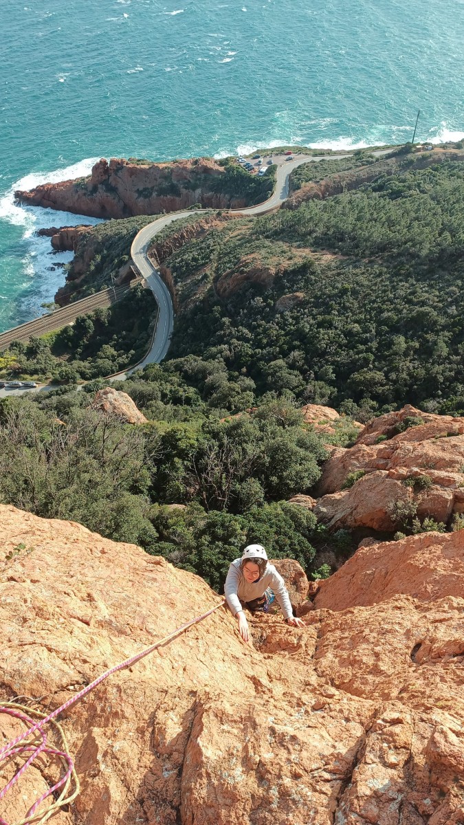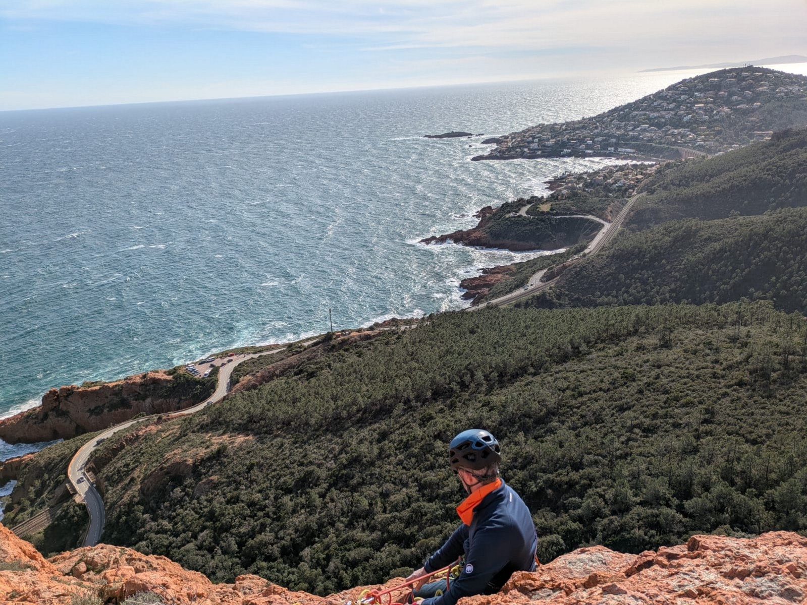 Ce week-end, ils étaient 24 grimpeur·ses du club à apprécier bronzer sur les parois du rocher St Barthélémy, sur la bien nommée corniche d’or, entre Mandelieu et St Raphaël. 24 grimpeur·ses de niveaux divers, certains à l’expérience confirmée, d’autres qui découvraient l’activité quelques semaines auparavant.