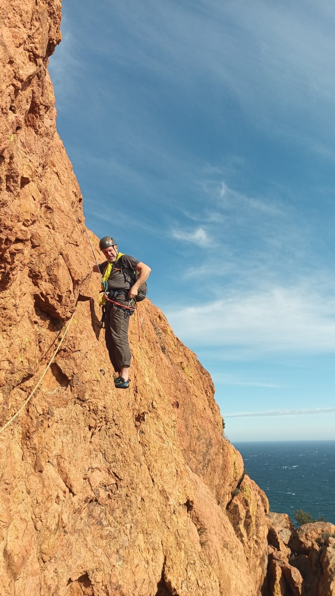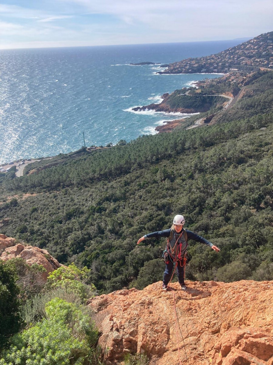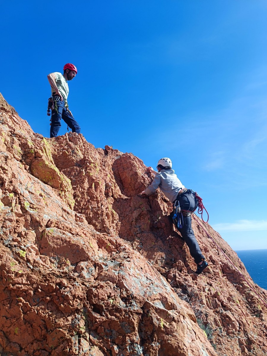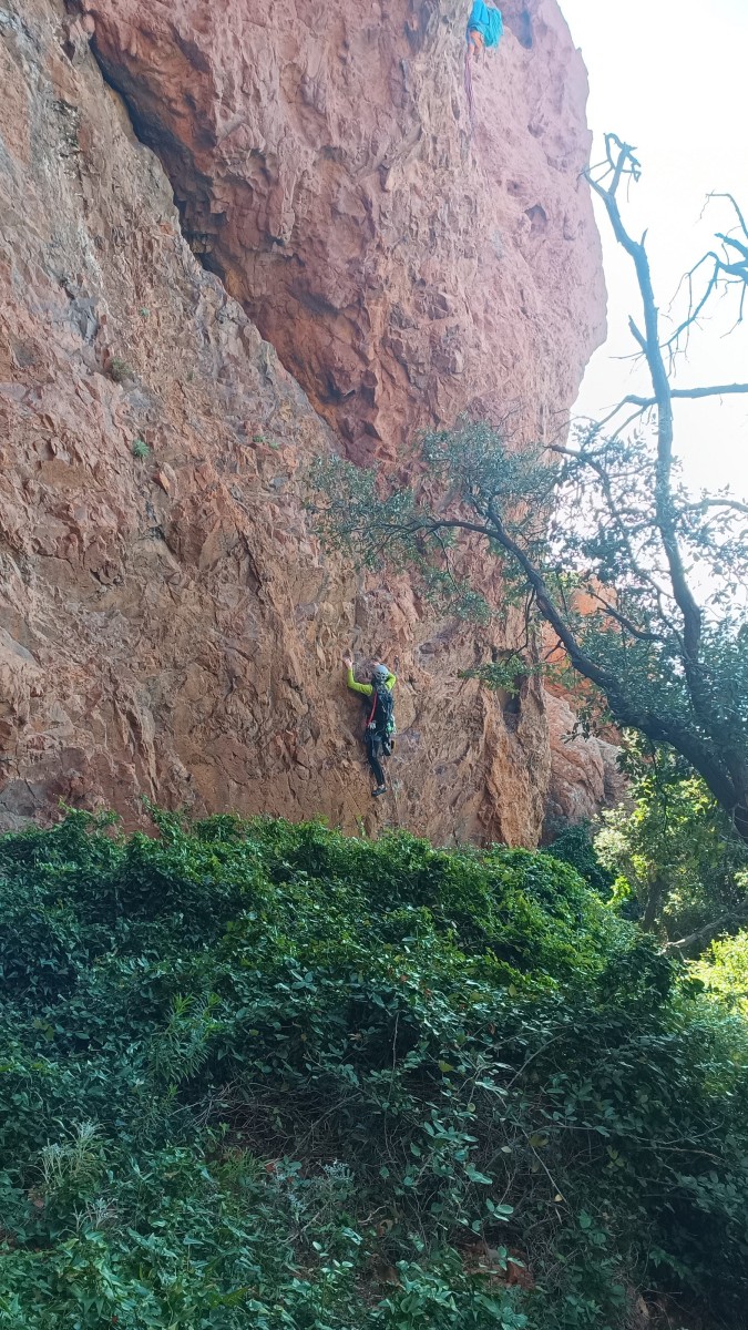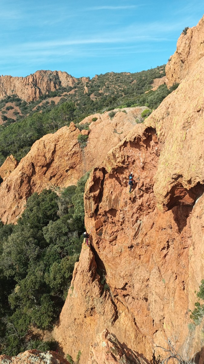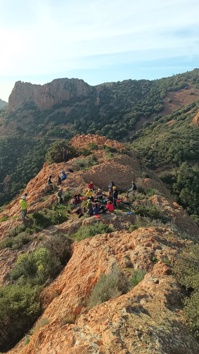 Ce week-end, ils étaient 24 grimpeur·ses du club à apprécier bronzer sur les parois du rocher St Barthélémy, sur la bien nommée corniche d’or, entre Mandelieu et St Raphaël. 24 grimpeur·ses de niveaux divers, certains à l’expérience confirmée, d’autres qui découvraient l’activité quelques semaines auparavant.