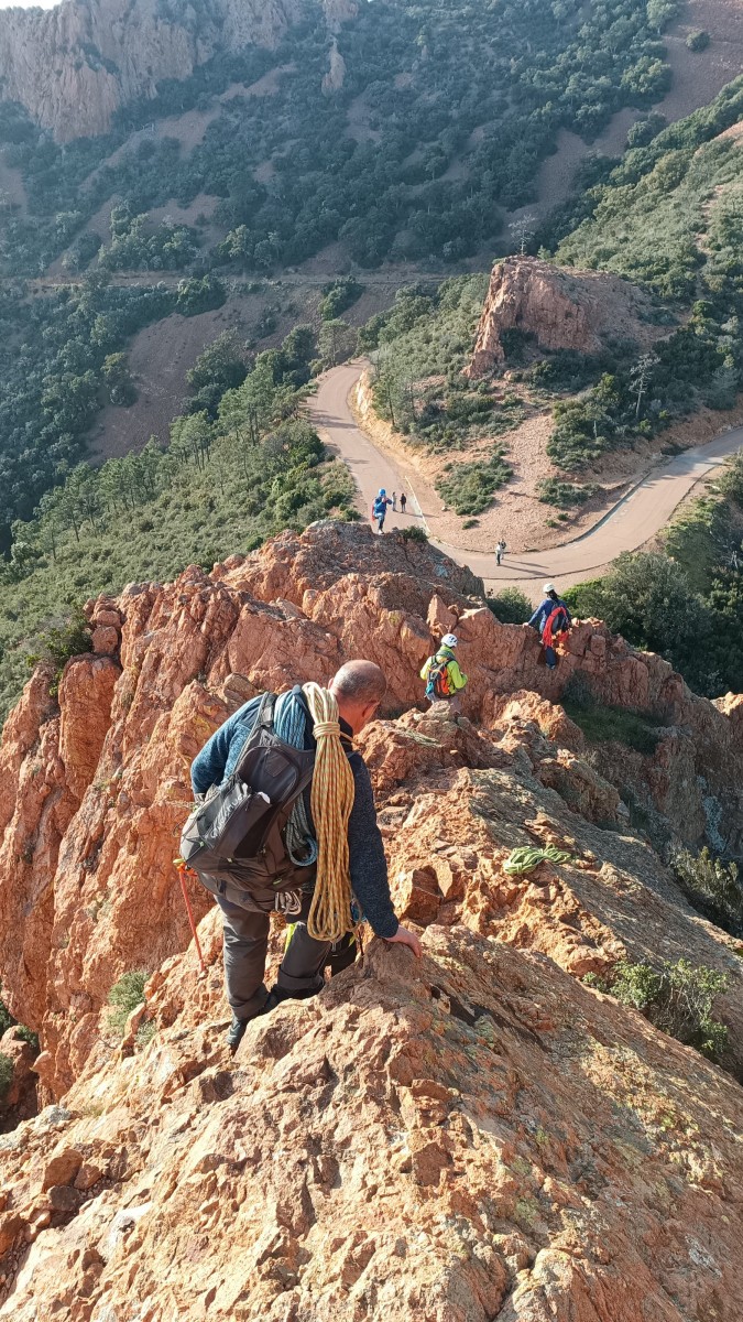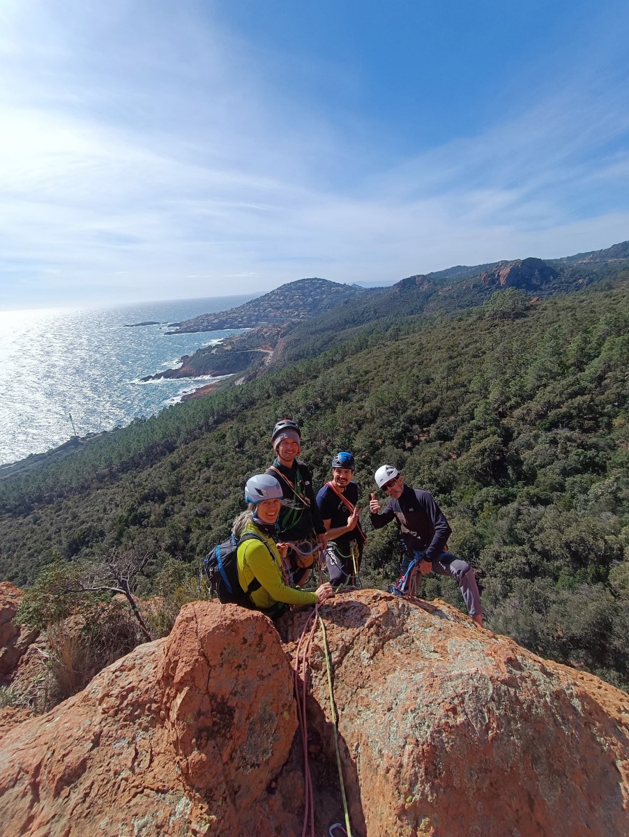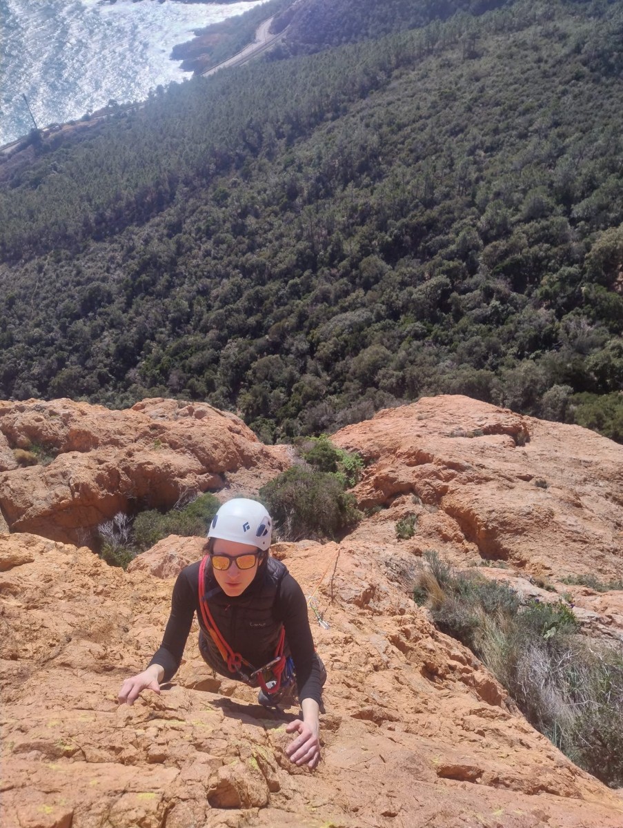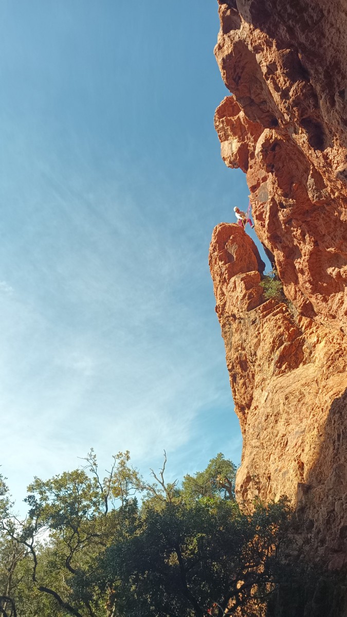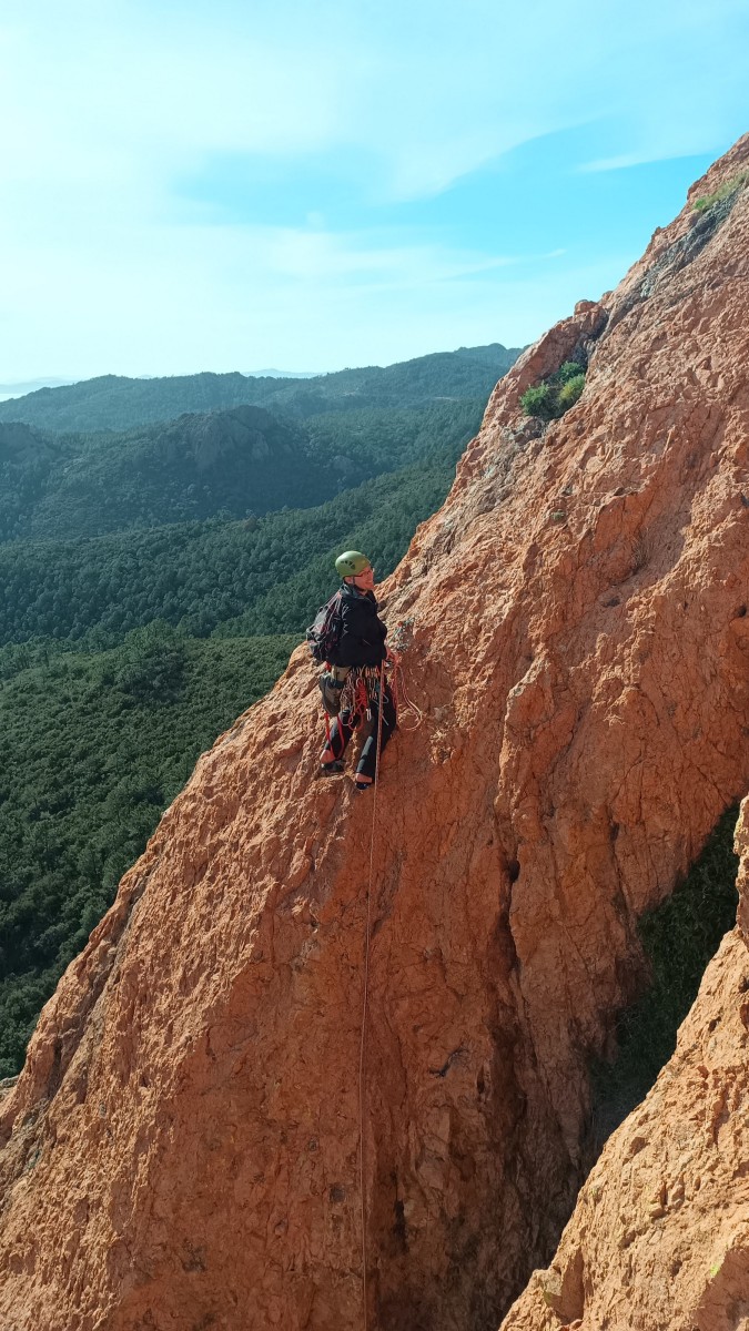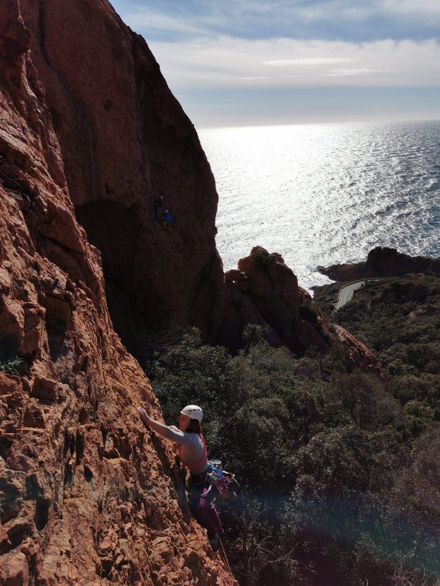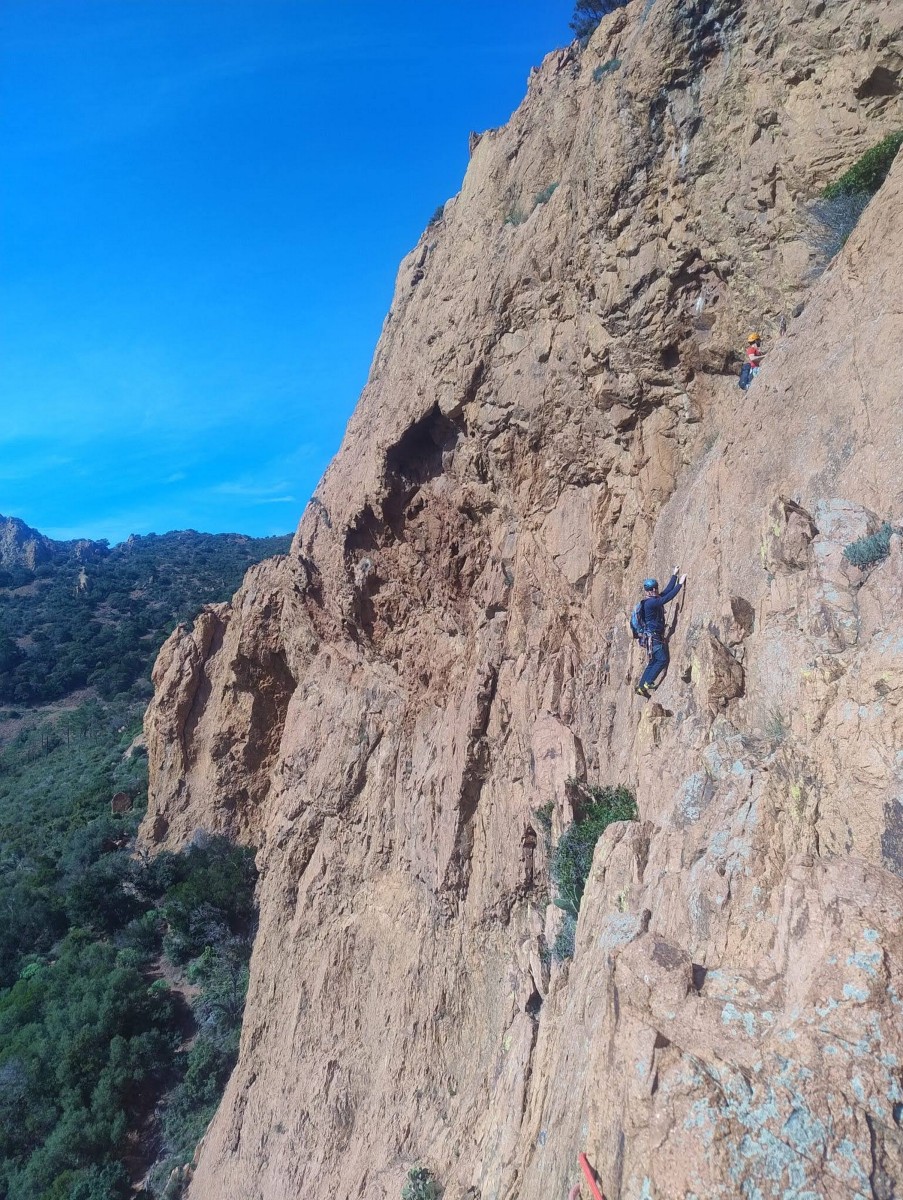 Ce week-end, ils étaient 24 grimpeur·ses du club à apprécier bronzer sur les parois du rocher St Barthélémy, sur la bien nommée corniche d’or, entre Mandelieu et St Raphaël. 24 grimpeur·ses de niveaux divers, certains à l’expérience confirmée, d’autres qui découvraient l’activité quelques semaines auparavant.