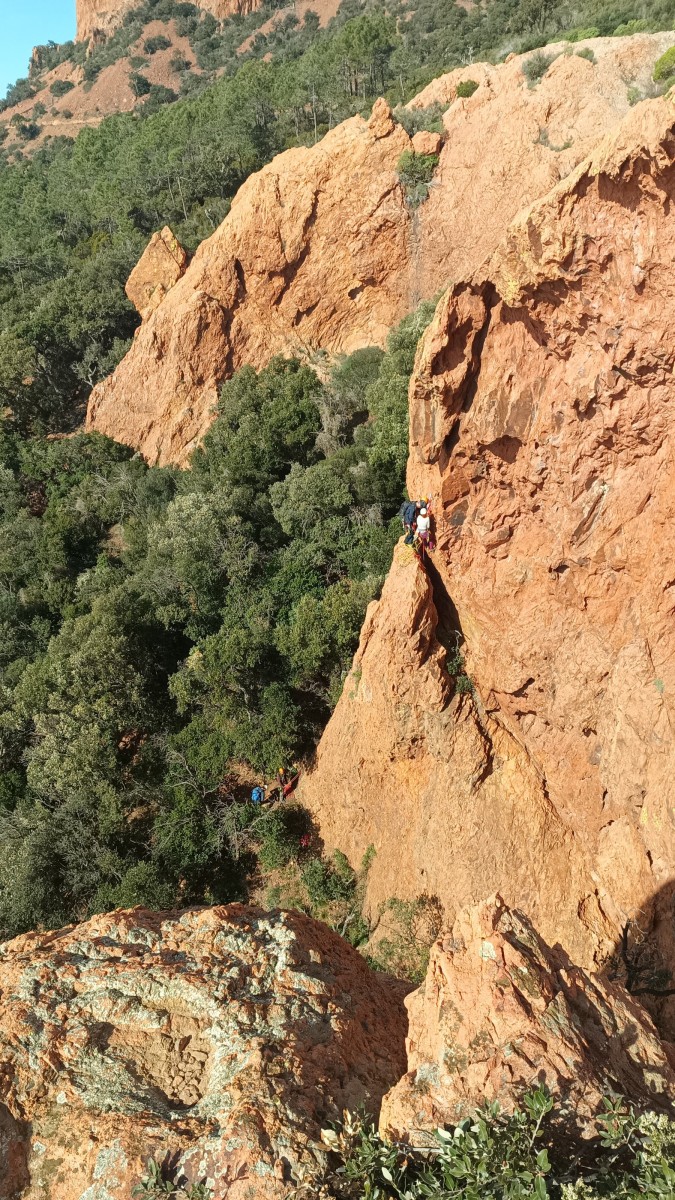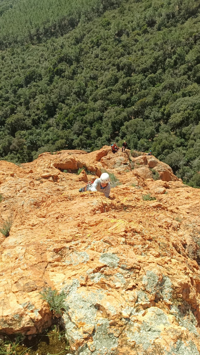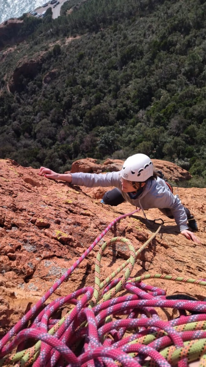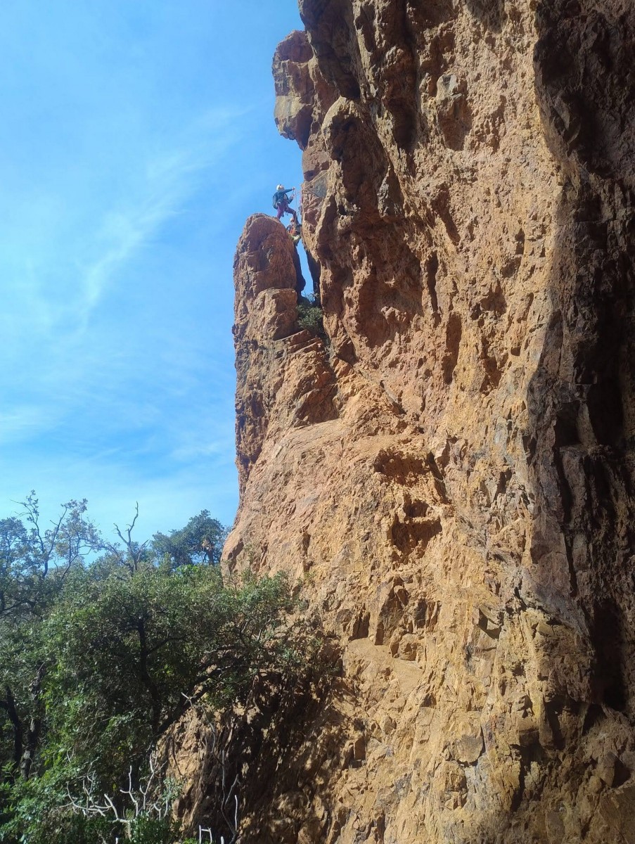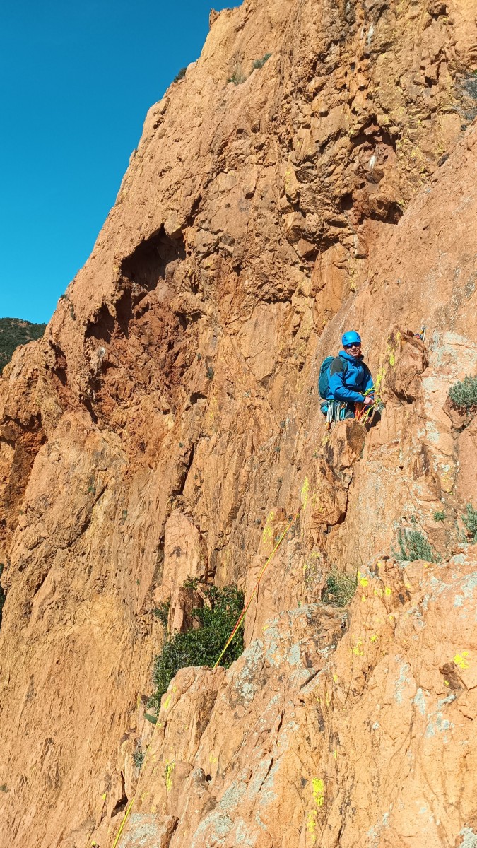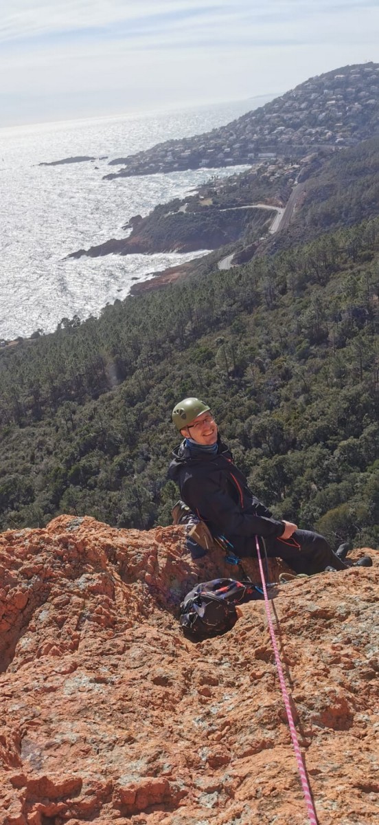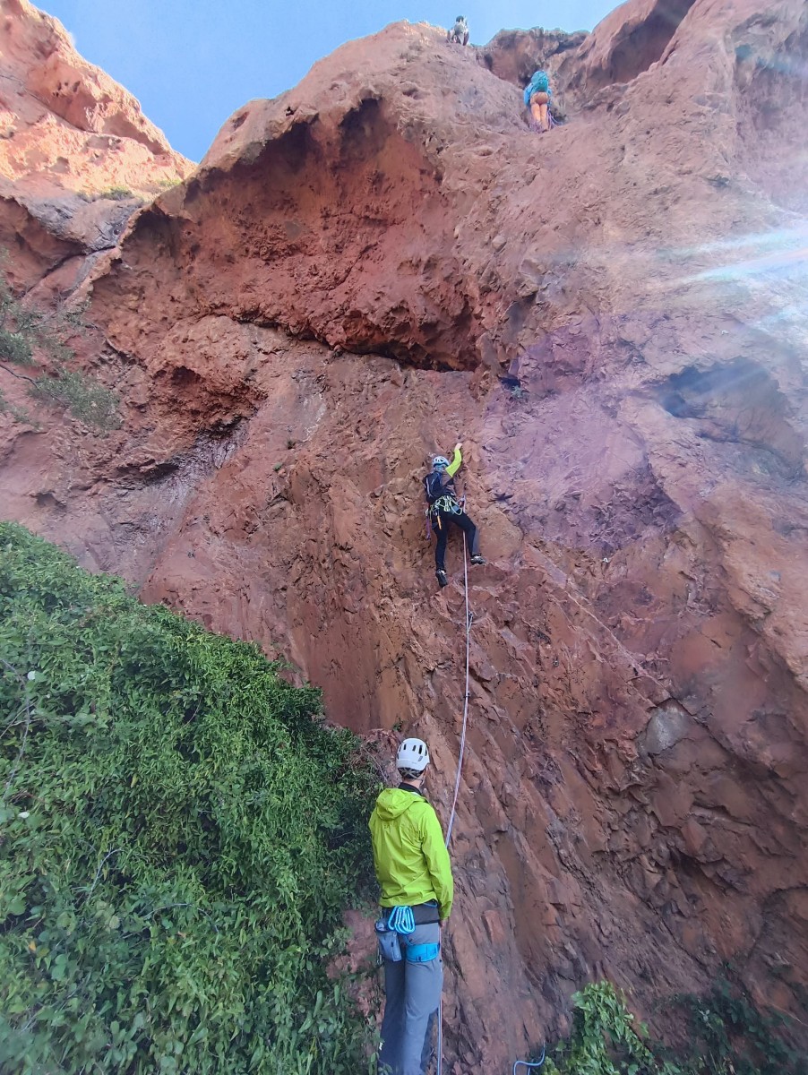 Ce week-end, ils étaient 24 grimpeur·ses du club à apprécier bronzer sur les parois du rocher St Barthélémy, sur la bien nommée corniche d’or, entre Mandelieu et St Raphaël. 24 grimpeur·ses de niveaux divers, certains à l’expérience confirmée, d’autres qui découvraient l’activité quelques semaines auparavant.