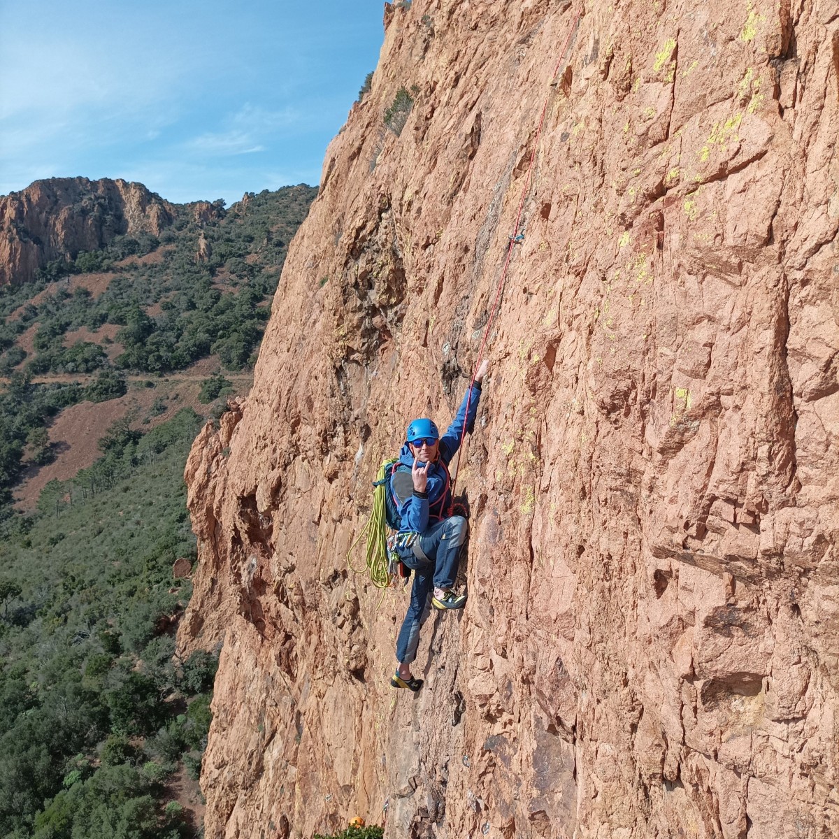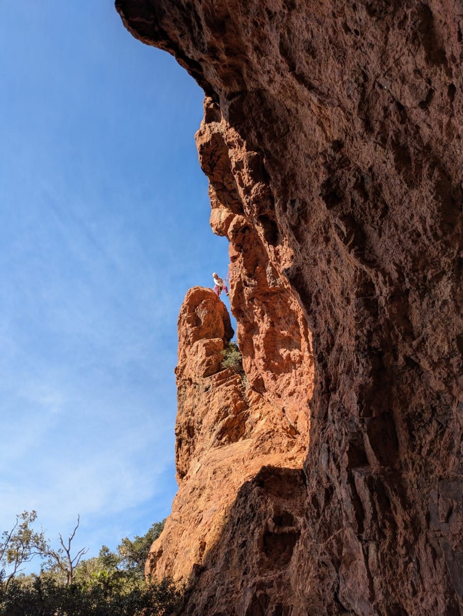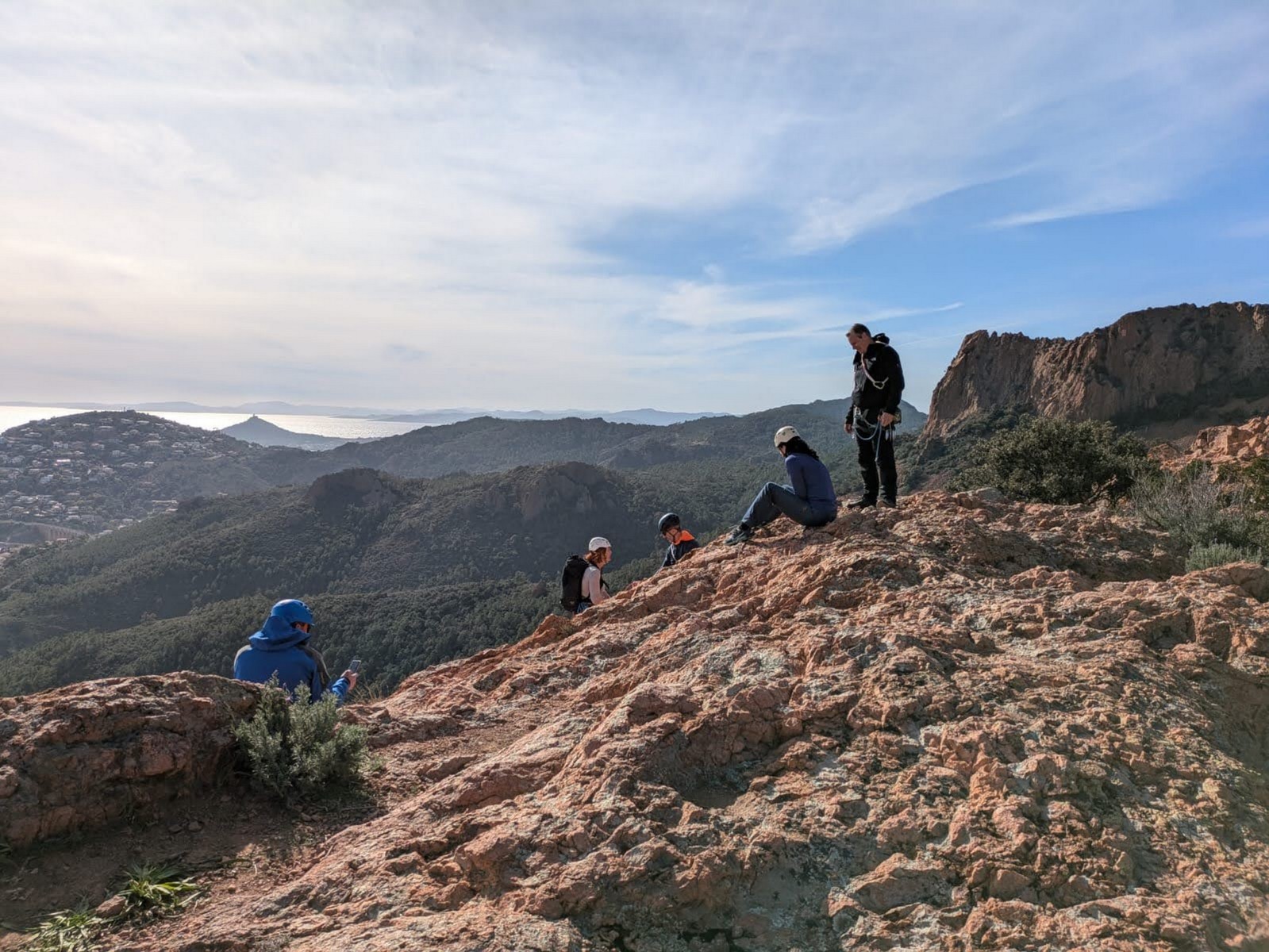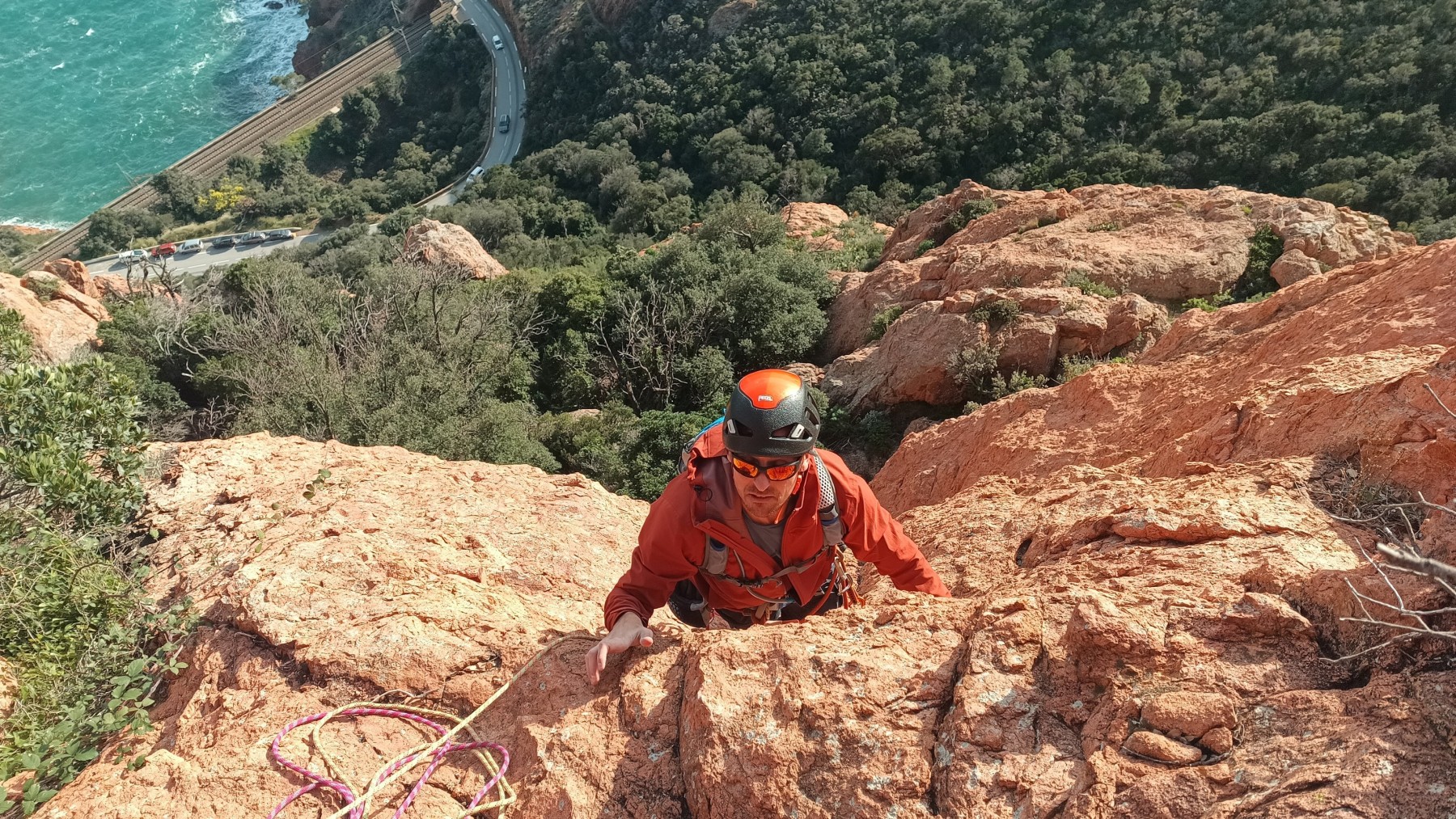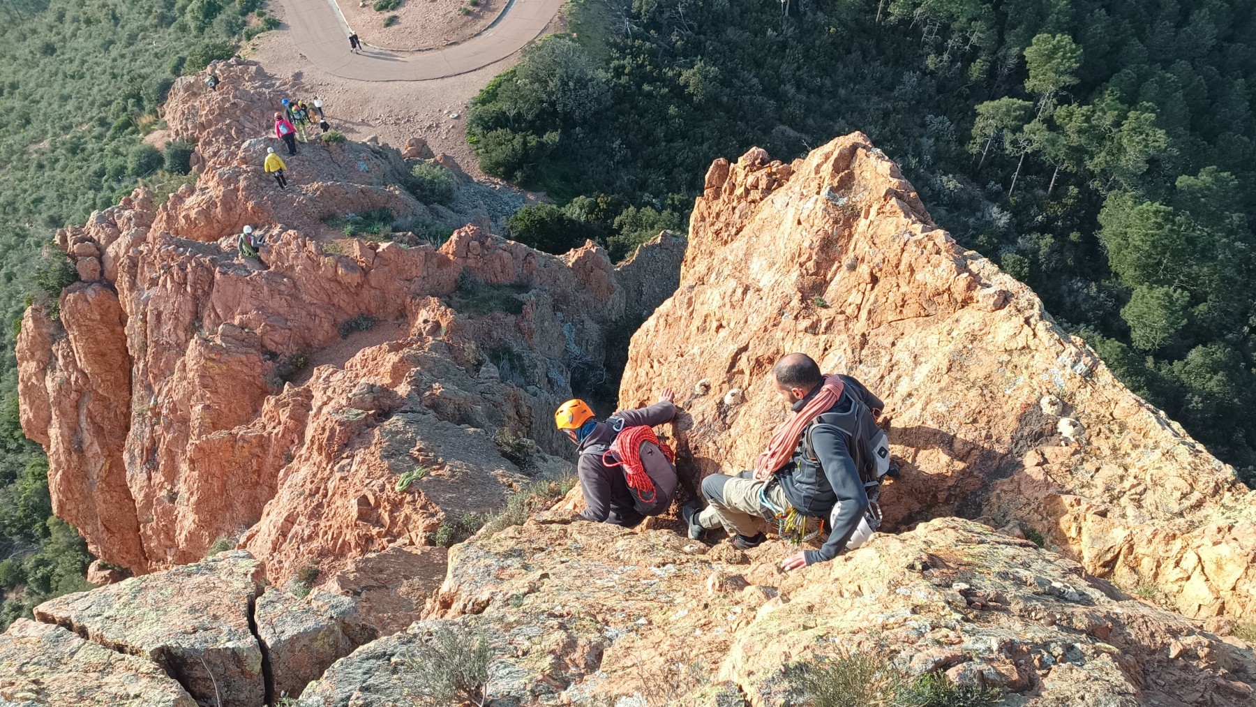 Ce week-end, ils étaient 24 grimpeur·ses du club à apprécier bronzer sur les parois du rocher St Barthélémy, sur la bien nommée corniche d’or, entre Mandelieu et St Raphaël. 24 grimpeur·ses de niveaux divers, certains à l’expérience confirmée, d’autres qui découvraient l’activité quelques semaines auparavant.