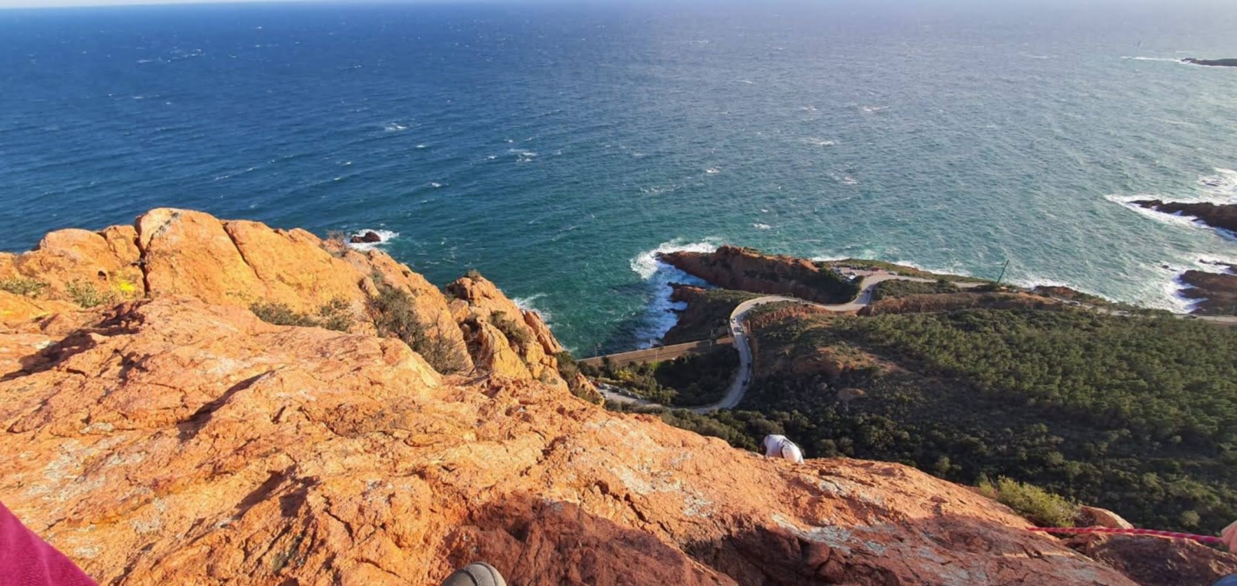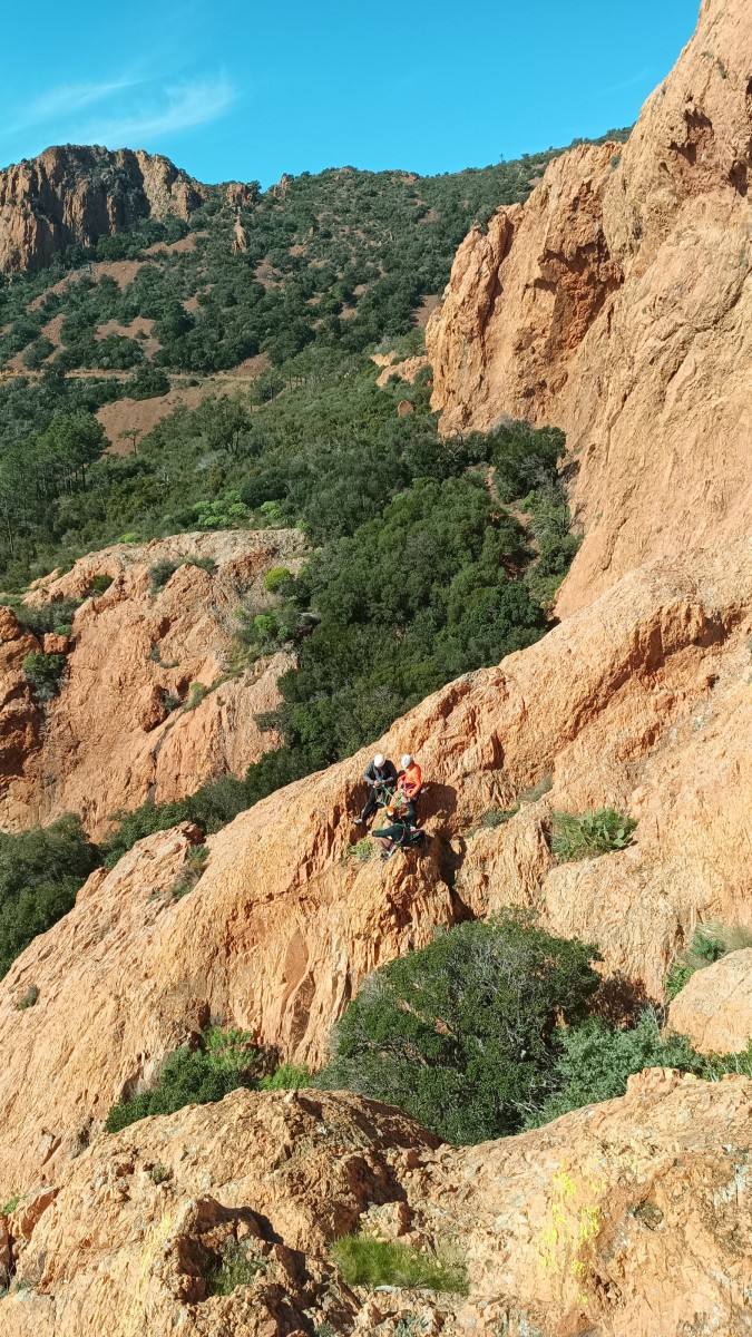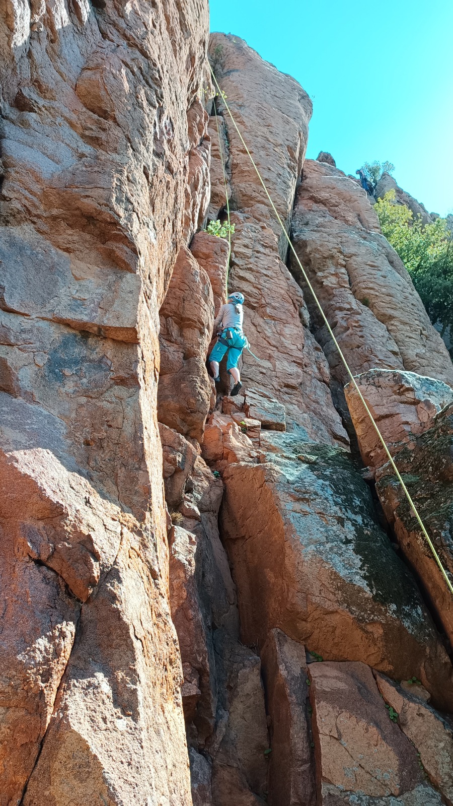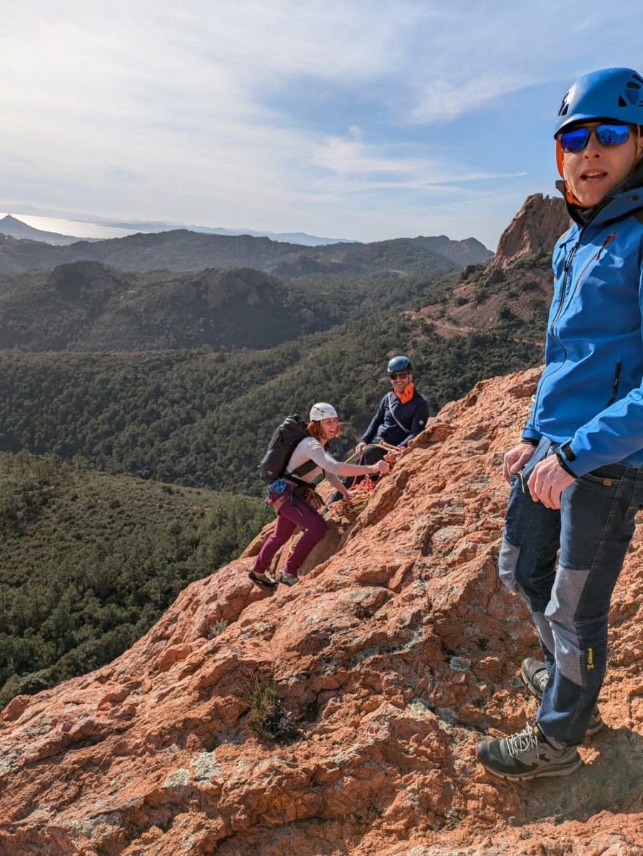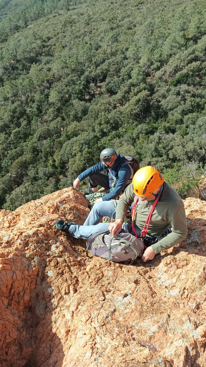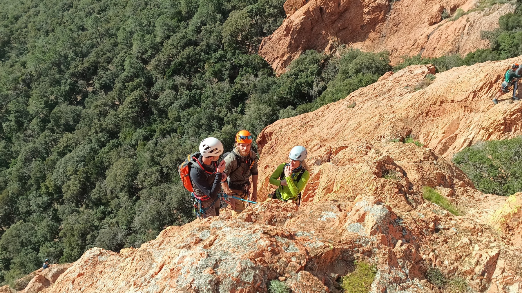 Ce week-end, ils étaient 24 grimpeur·ses du club à apprécier bronzer sur les parois du rocher St Barthélémy, sur la bien nommée corniche d’or, entre Mandelieu et St Raphaël. 24 grimpeur·ses de niveaux divers, certains à l’expérience confirmée, d’autres qui découvraient l’activité quelques semaines auparavant.