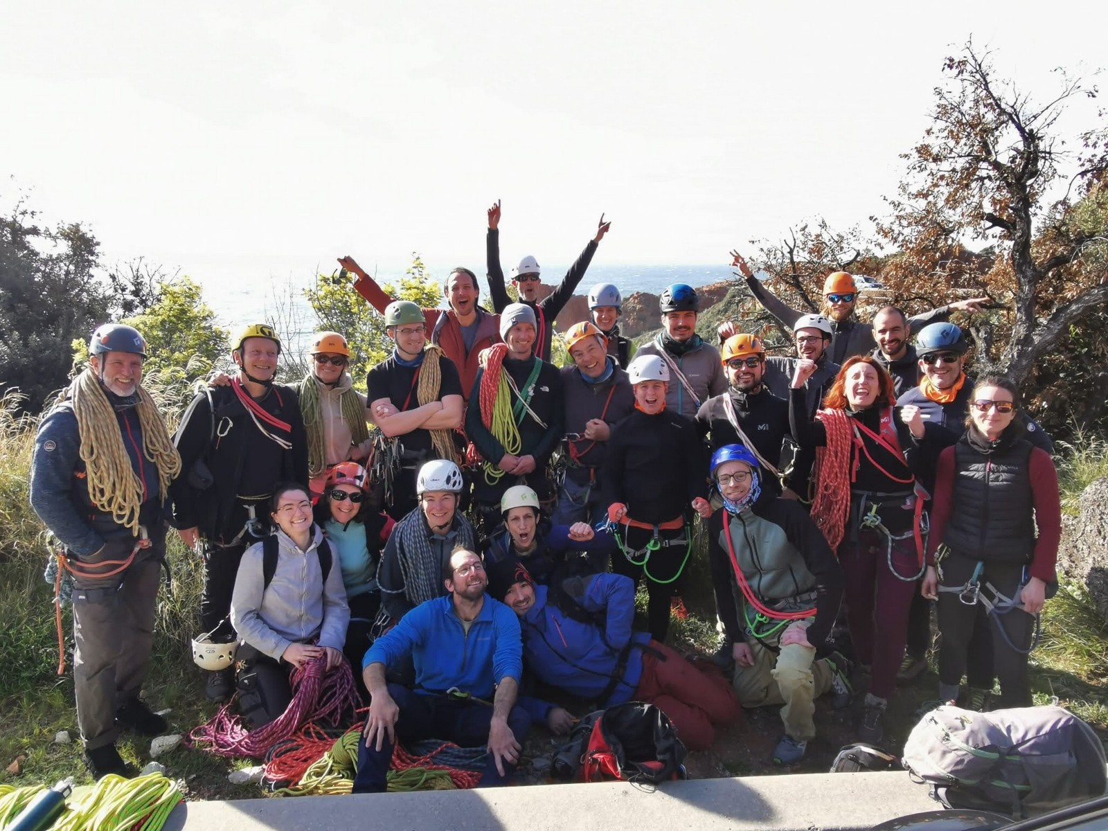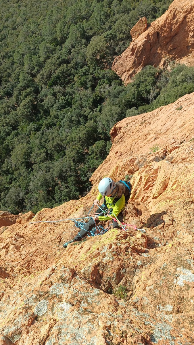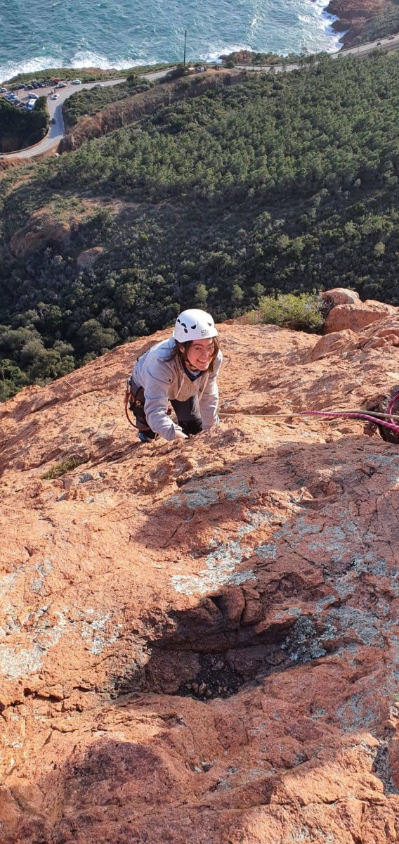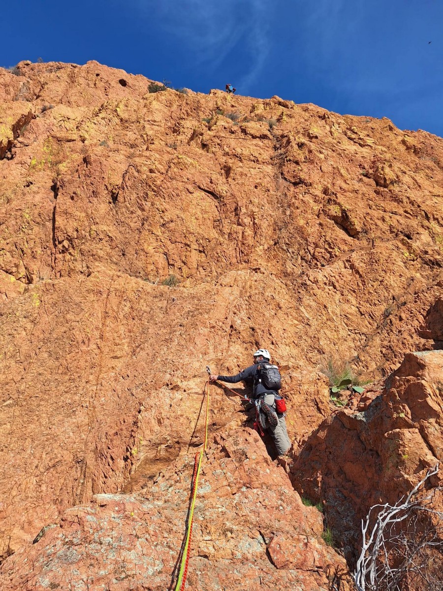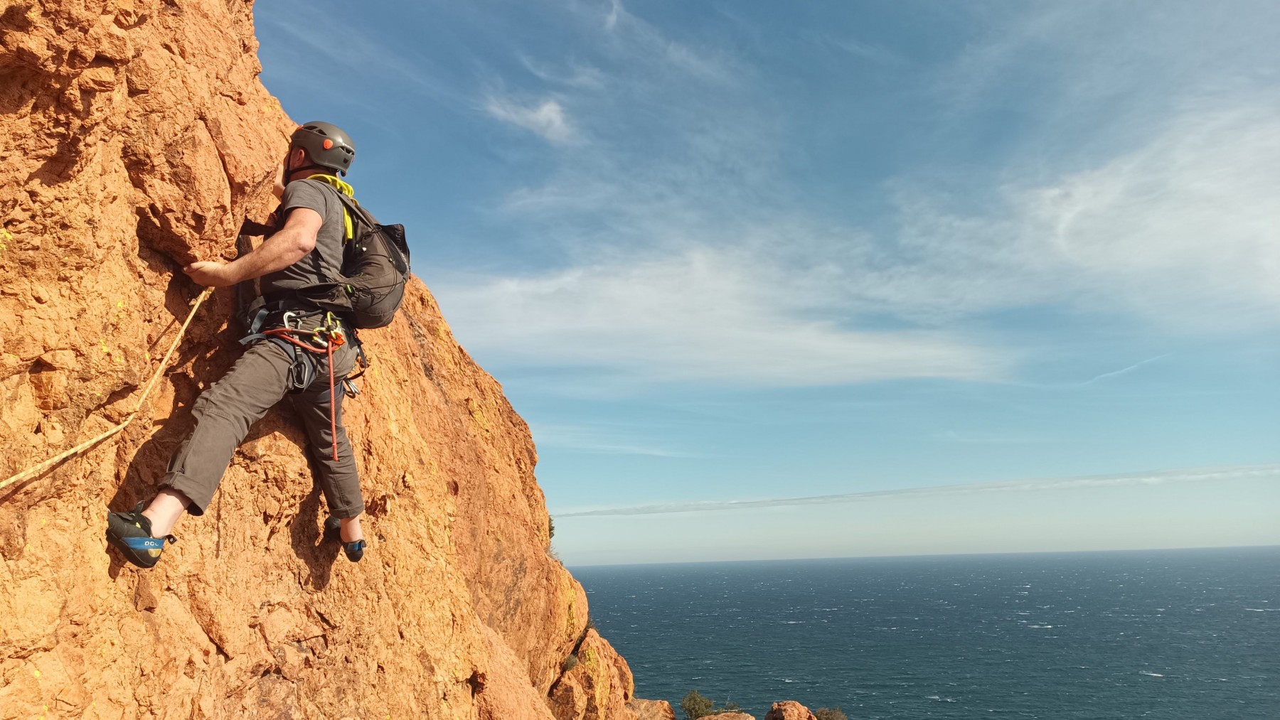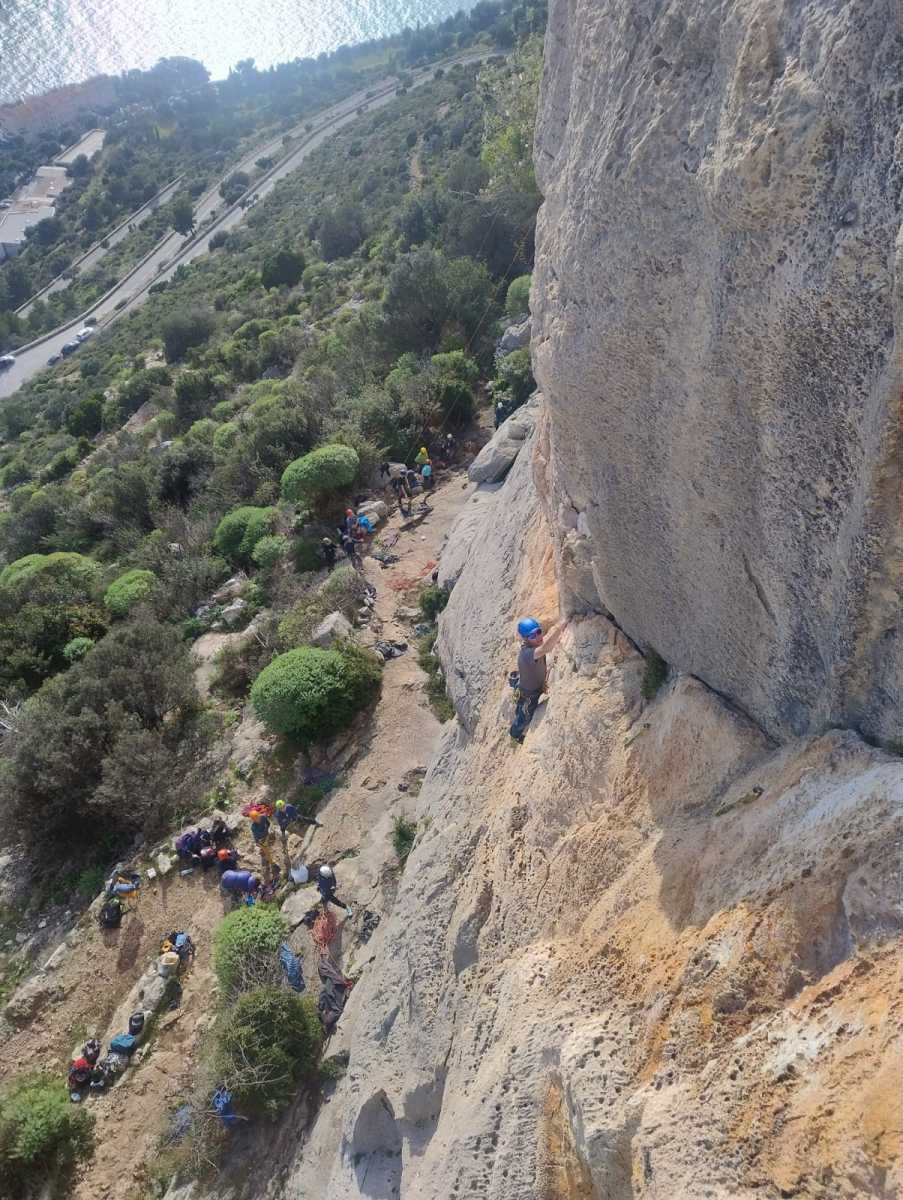 Ce week-end, ils étaient 24 grimpeur·ses du club à apprécier bronzer sur les parois du rocher St Barthélémy, sur la bien nommée corniche d’or, entre Mandelieu et St Raphaël. 24 grimpeur·ses de niveaux divers, certains à l’expérience confirmée, d’autres qui découvraient l’activité quelques semaines auparavant.