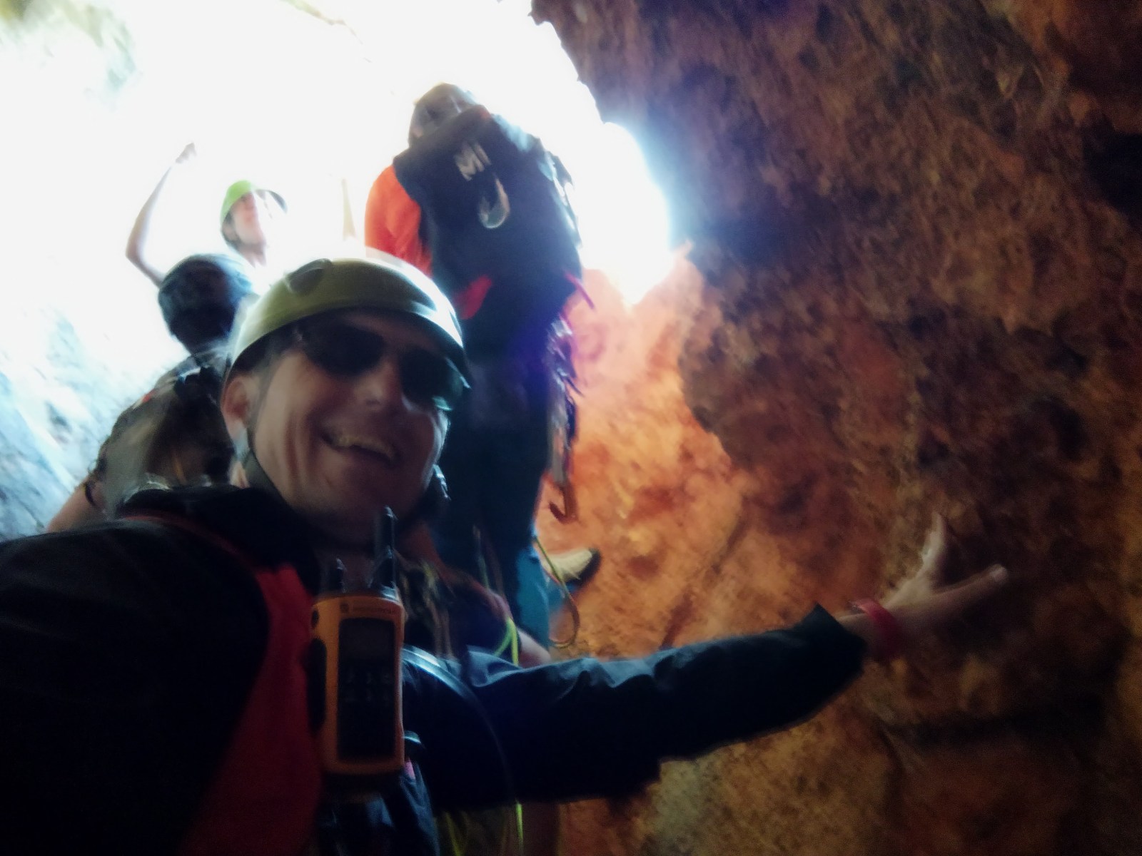 Côté Tracas, la voie est un peu plus longue que les autres, notamment à cause d’un rappel au R6, après un joli 5c. Jean-Luc et Phil sont toujours devant tandis que, toujours sur la grande terrasse centrale, je demande à David et Epo s’ils veulent continuer ou finir dans du plus facile. Epo, loin d’être en manque d’énergie, veut continuer. David se retrouve en tête dans le 5c, attendu par Jean-Luc. Je profite d’un petit raccourci pour me retrouver au pied du rappel. Le 6a suivant est teigneux au départ mais Phil et Jean-Luc n’ont pas besoin de moi. Je me joins à leur cordée et en profite pour placer des pédales pour les suivants, occupés à gérer leur rappel. Et c’est quelques minutes plus tard que nous nous retrouvons tous enfin au sommet ! Il est autour de 16h et certains ont attendu longtemps ! Djé est d’ailleurs déjà en bas depuis un moment avec Delph et Isa.