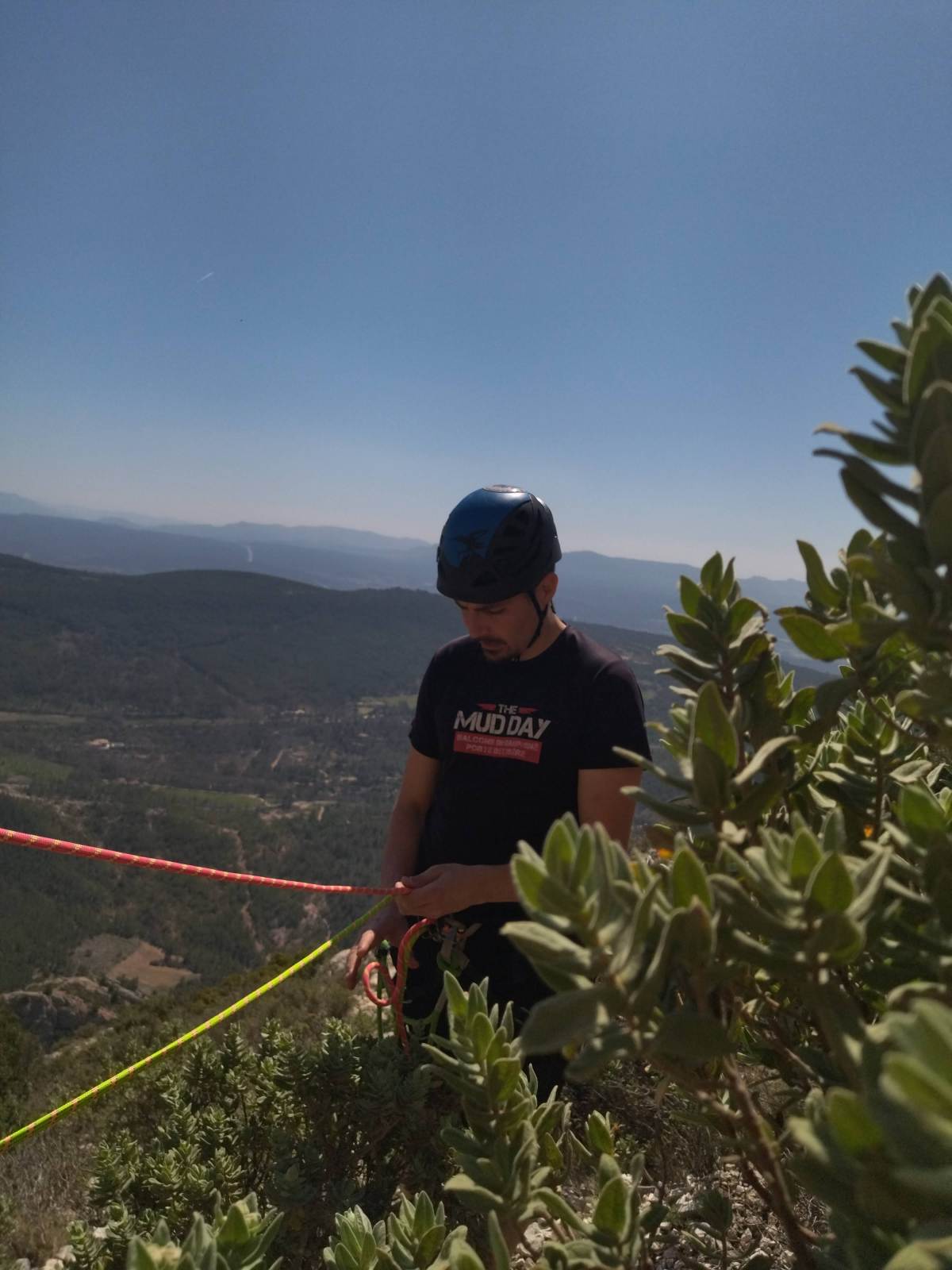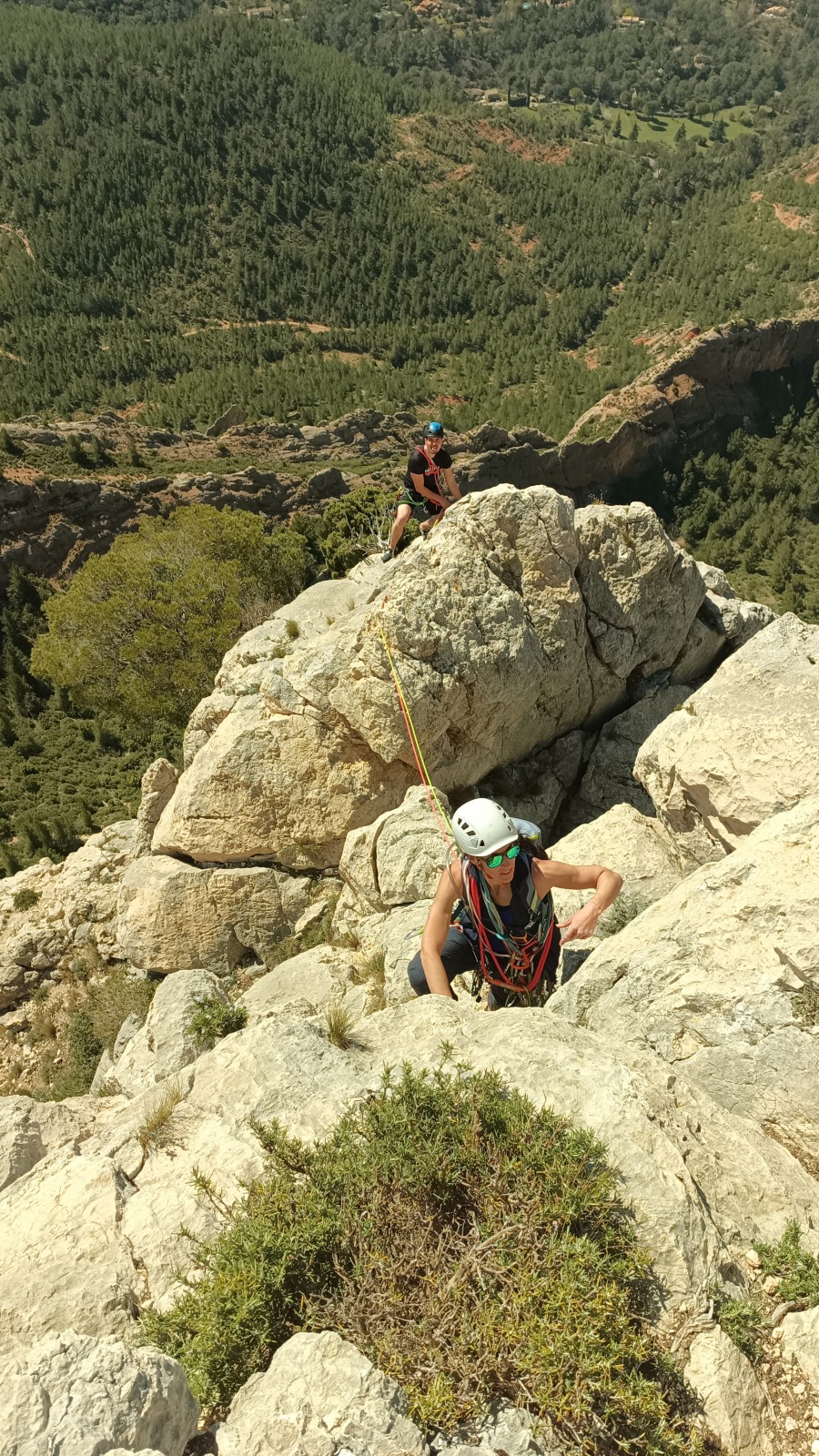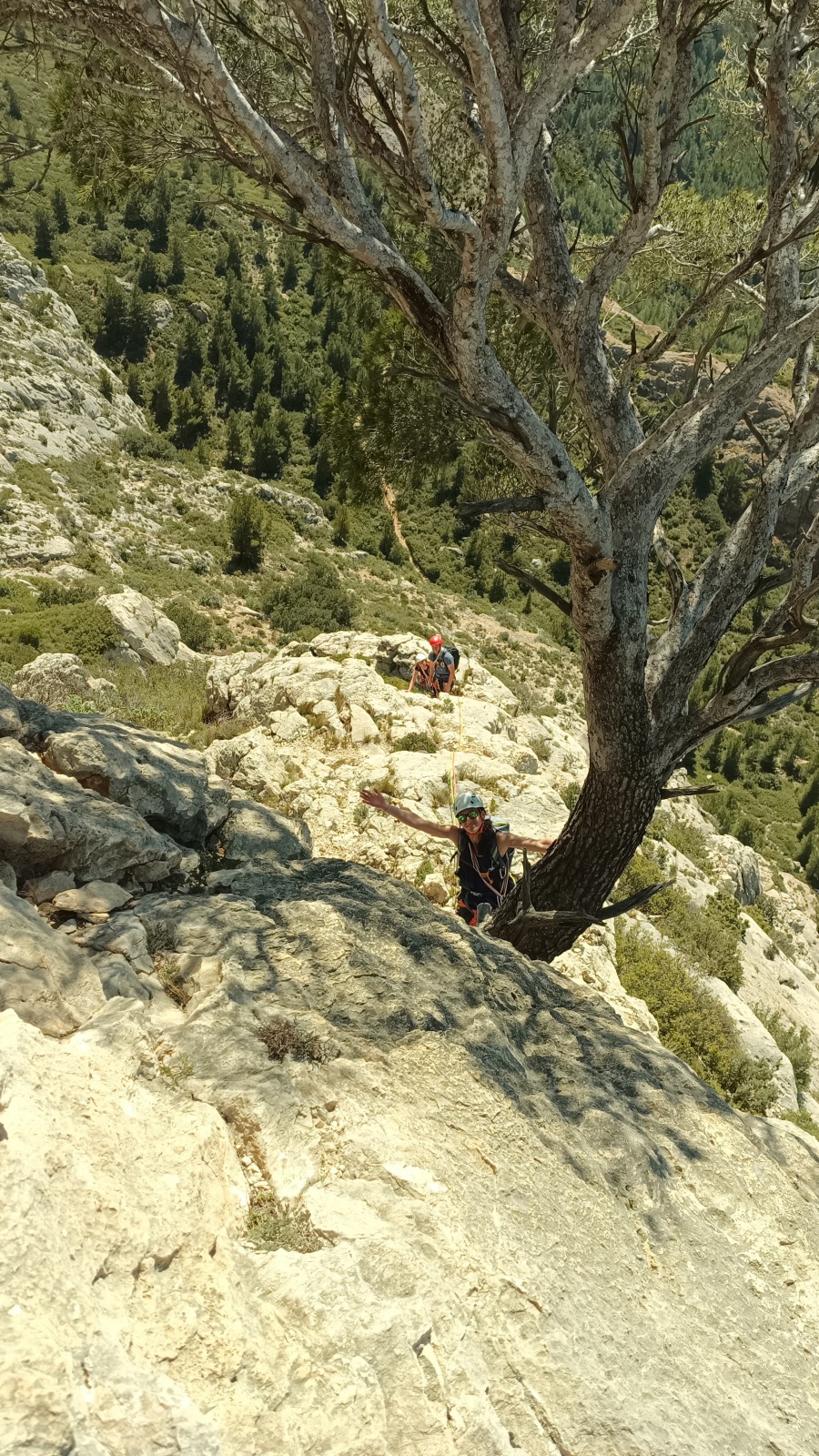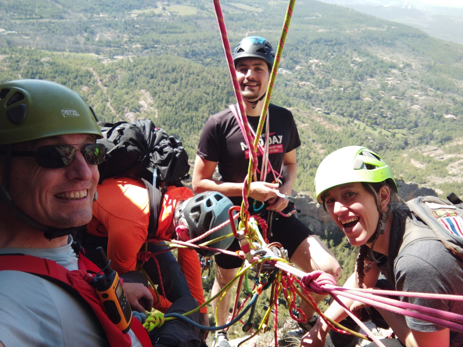 Sur la gauche JP a tenu son rôle de leader à merveille, il est désormais au sommet et assure Roxane et Brice pour la dernière longueur. Roxane, habituellement si joviale, a perdu son sens de l’humour mais non sans explication. Cette dernière est dans le 6b terminal, une difficulté intrinsèquement déjà difficile mais si l’on ajoute la fatigue des longueurs précédentes plus les 100 mètres de gaz qu’elle a sous les fesses on peut aisément comprendre son malaise. À force d’acharnement son opiniâtreté vainc et elle se retrouve tout là haut avec JP à assurer Brice qui est également épuisé. Ce dernier a besoin d’un peu d’aide de Yannick pour se sortir de ce mauvais pas puis déroule dans la toute fin de cette grande voie et a enfin droit à un repos bien mérité.