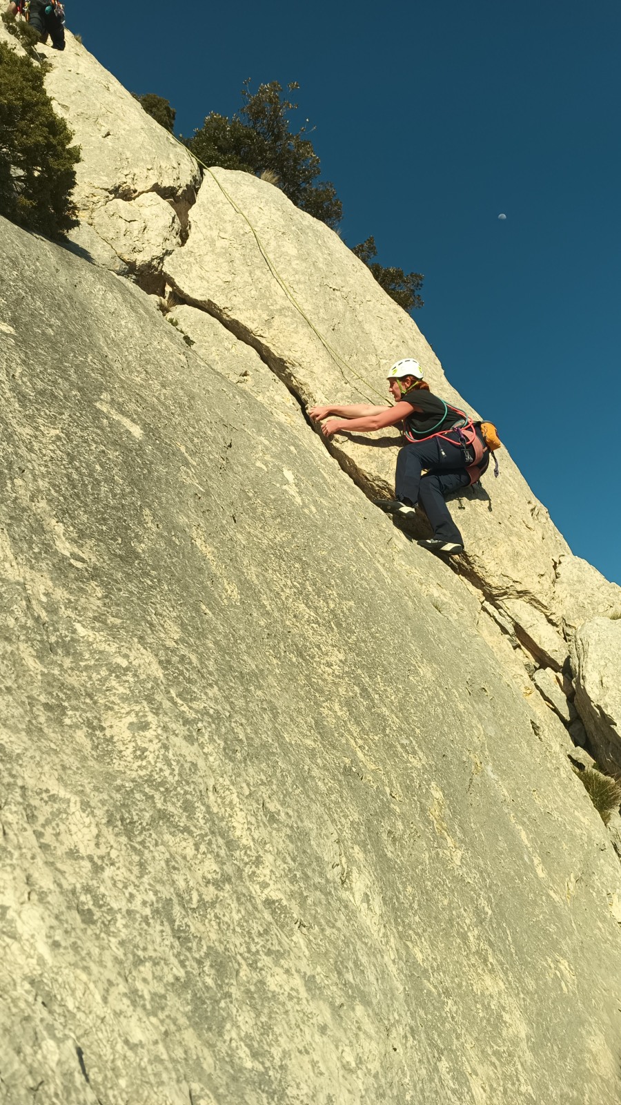 A notre gauche, on observe Roxane qui a attaqué en tête la première longueur en 5b de Comité d’aide aux français. Participante du cycle gv depuis cette année et d’une motivation redoutable, je ne me fais pas de souci. Rejointe par Brice et JP, ce dernier prend la suite dans la L2 et nous offre un beau spectacle dans un 6a+ court, intense et bien scuplté.
