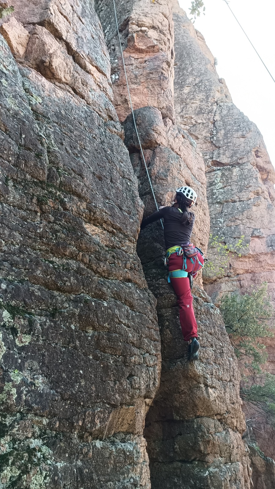 Enfin, nos premiers de cordée s’élancent. Sigrid montre l’exemple dans la première longueur en 5c de Nabetse Orevilo en enchaînant brillamment. Là-haut elle construit son premier relais puis fait signe à Olivier et à Julien qu’ils sont assurés et qu’ils peuvent la rejoindre. Ils sont suivis par Matthieu, Florian et Hélène. Cette dernière commence devant et se joue avec facilité de ce caillou en apparence glissant.