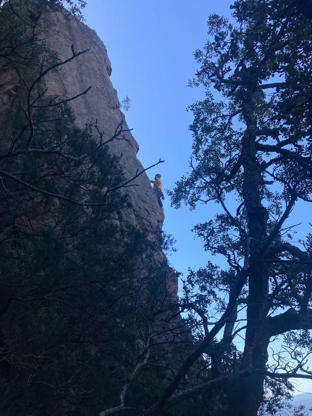 Encore plus à gauche, c’est la cordée Djé, Xav et Thibaud qui s’attaque à l’aile du sphinx. Thibaud a bien suivi les cours et construit les relais des premières longueurs les plus faciles.