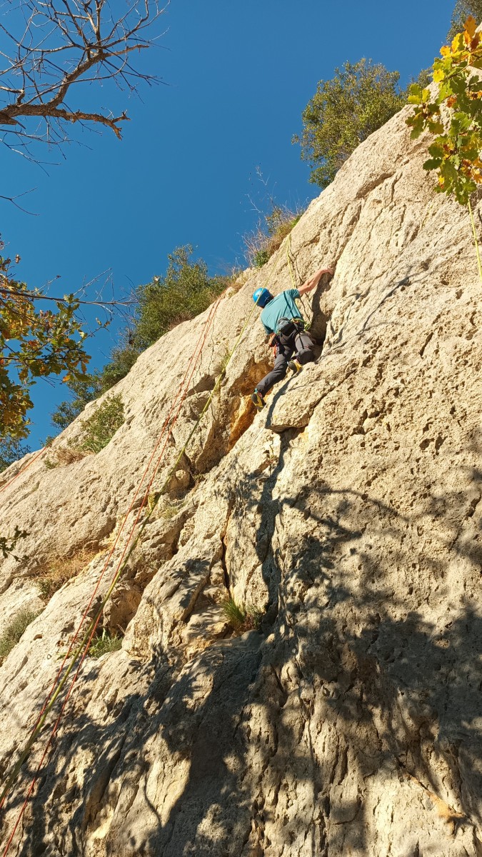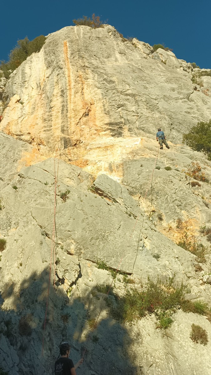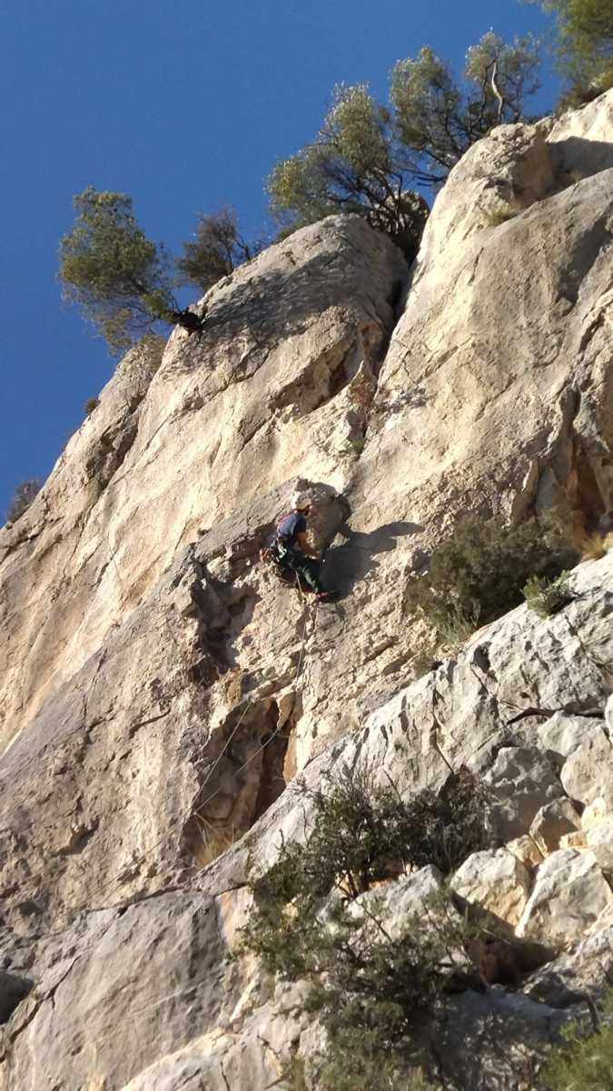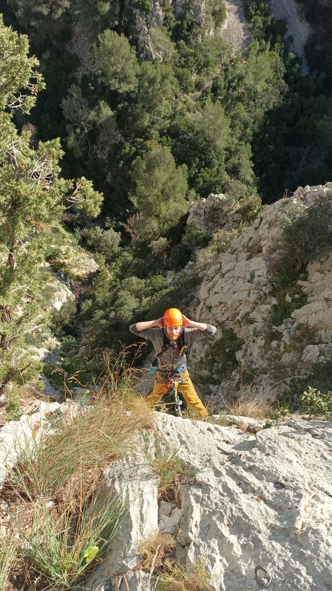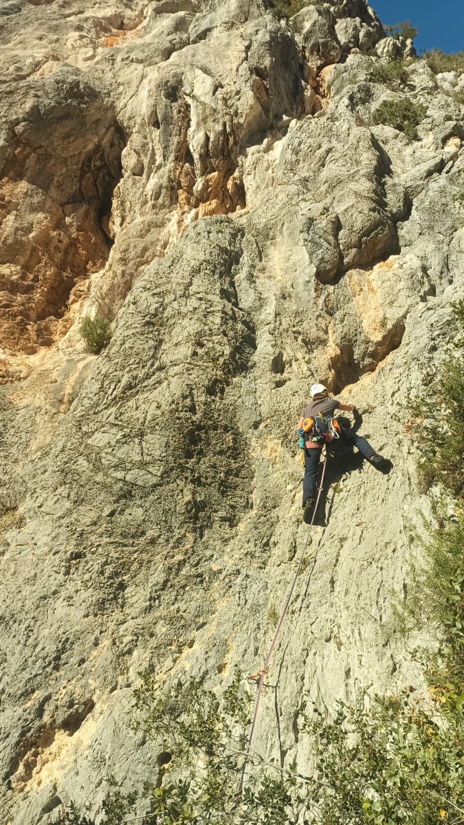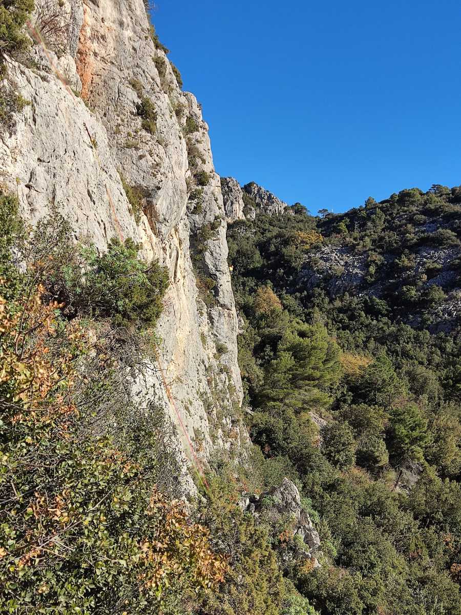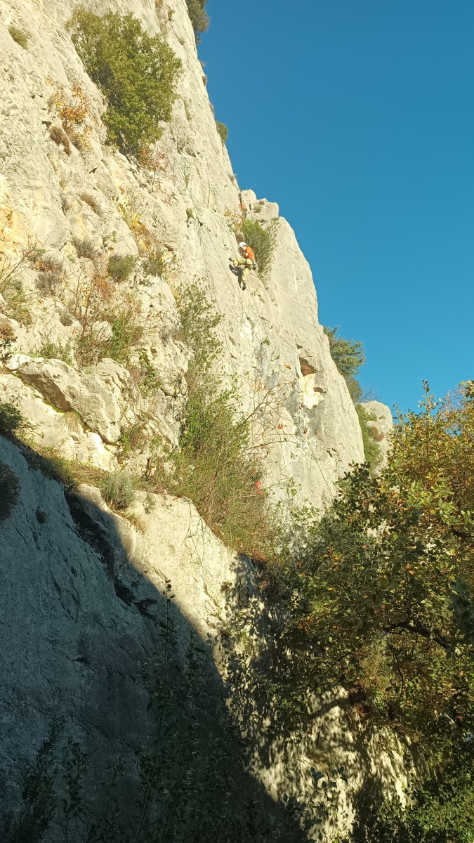 La route plus tard, nous voilà garés dans les gorges d’Ollioules, en face de l’embouchure entre la Reppe et le Destel, bien qu’aucune de ces deux rivières ne soit en eau. On fait les cordées, on s’attribue les voies, on prépare efficacement le matos (même si j’ai oublié un jeu de cordes…) et nous voilà sur la marche d’approche. Les gorges sont à l’ombre mais il ne fait pas trop froid pour une journée de janvier. On arrive très vite au pied de la paroi concernée. Personnellement, je suis un peu déçu parce qu’elle n’a pas trop de gueule. On devine que les quelques voies cheminent pour chercher le caillou parmi des terrasses, des arbutes et des zones peu attirantes. Mais bon, on est là alors allons-y !