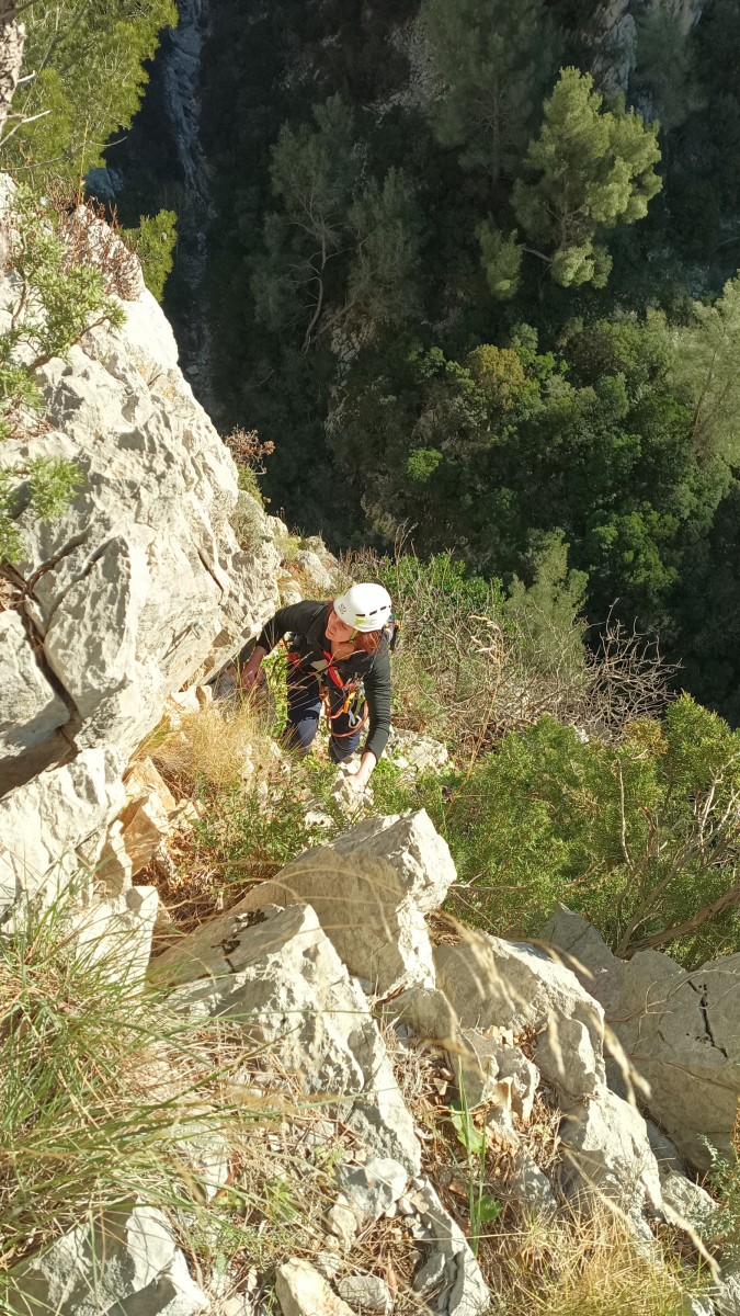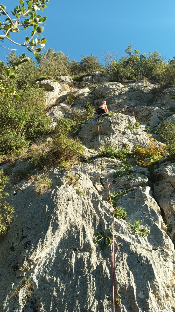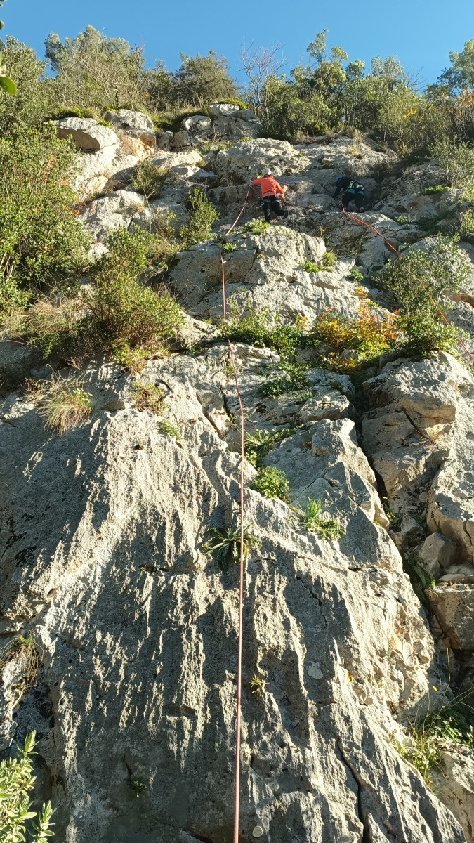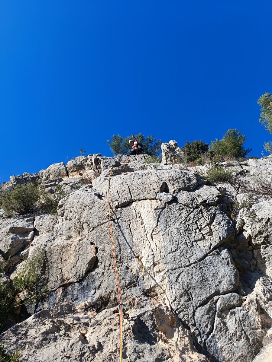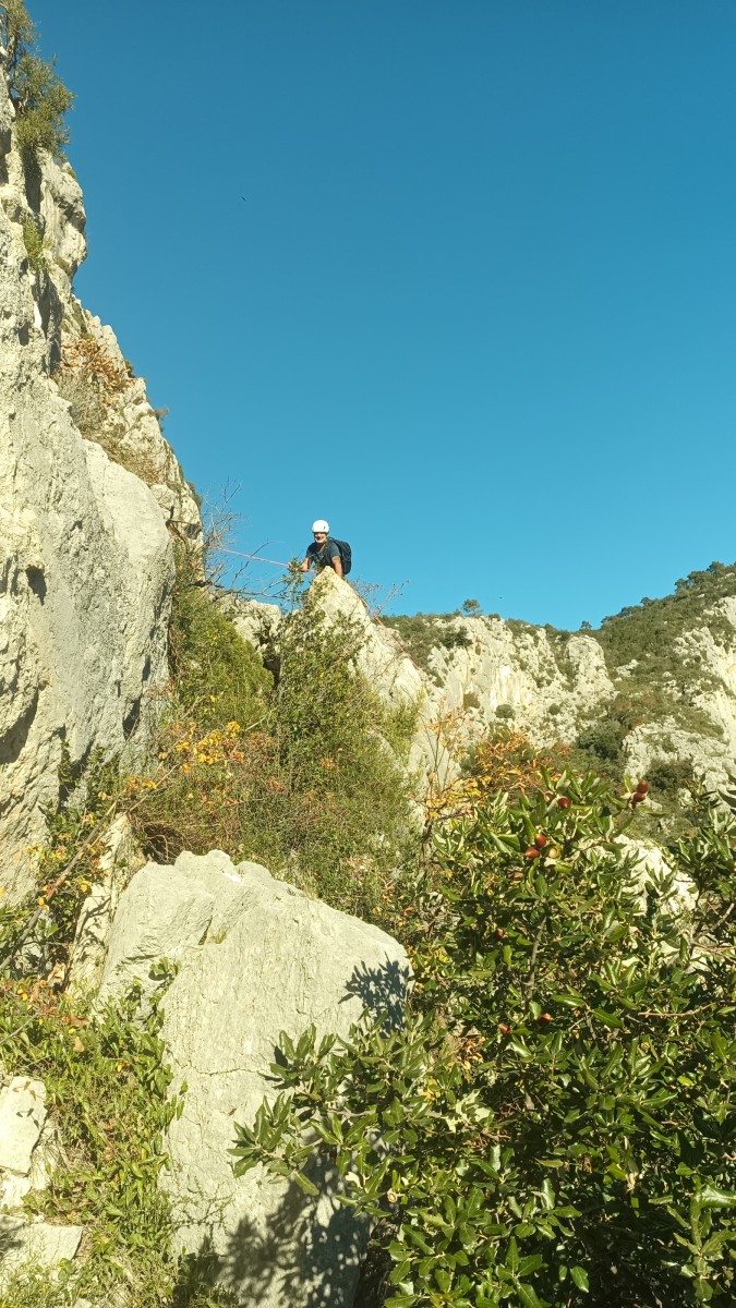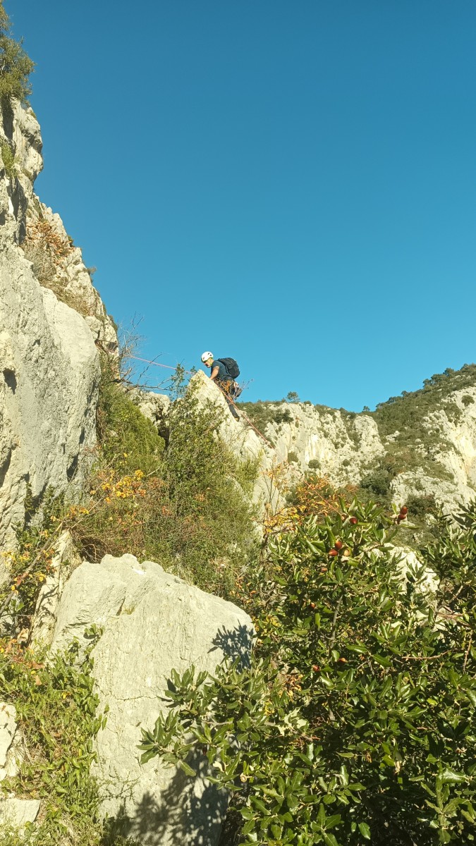 La route plus tard, nous voilà garés dans les gorges d’Ollioules, en face de l’embouchure entre la Reppe et le Destel, bien qu’aucune de ces deux rivières ne soit en eau. On fait les cordées, on s’attribue les voies, on prépare efficacement le matos (même si j’ai oublié un jeu de cordes…) et nous voilà sur la marche d’approche. Les gorges sont à l’ombre mais il ne fait pas trop froid pour une journée de janvier. On arrive très vite au pied de la paroi concernée. Personnellement, je suis un peu déçu parce qu’elle n’a pas trop de gueule. On devine que les quelques voies cheminent pour chercher le caillou parmi des terrasses, des arbutes et des zones peu attirantes. Mais bon, on est là alors allons-y !