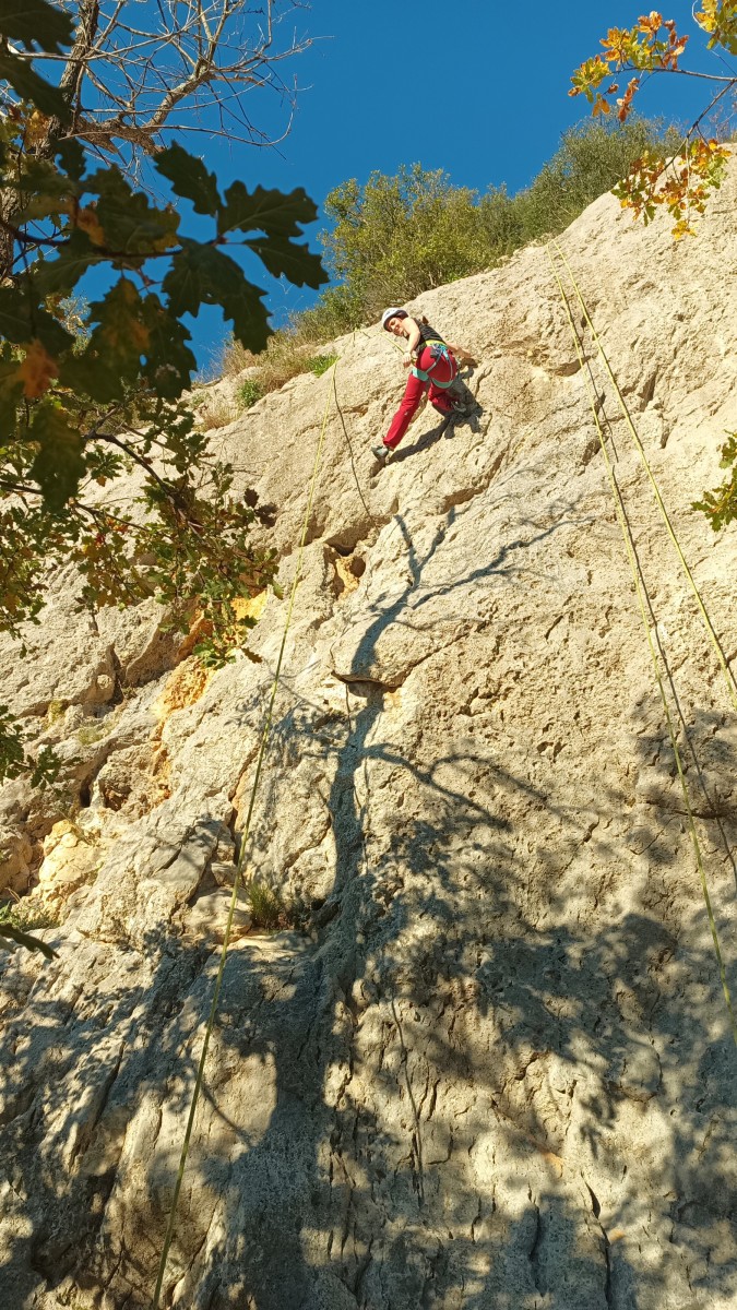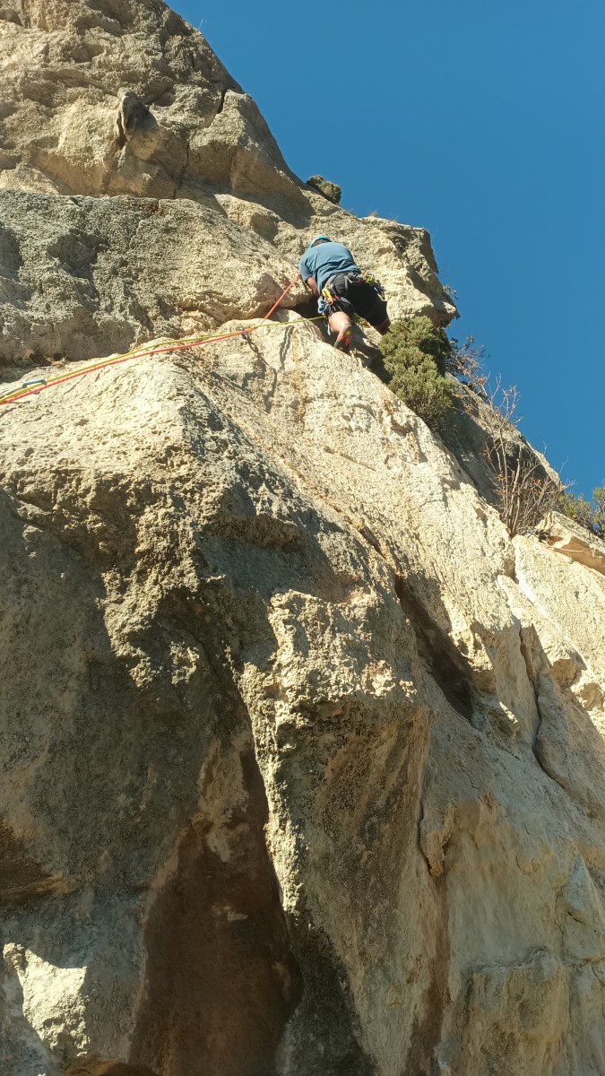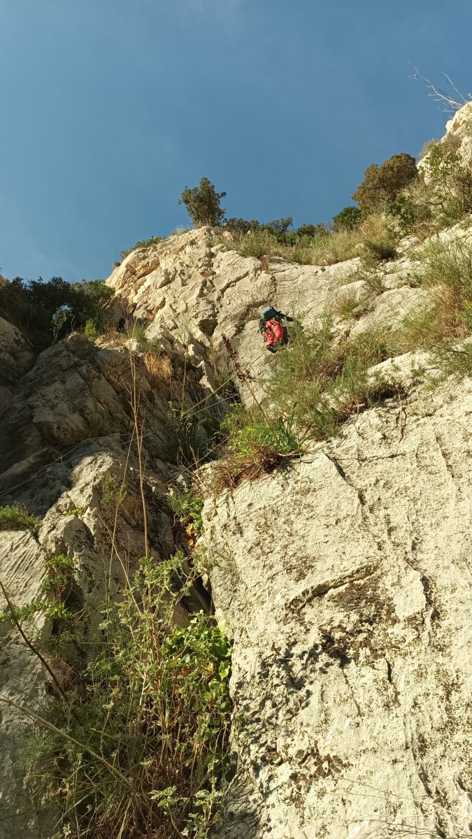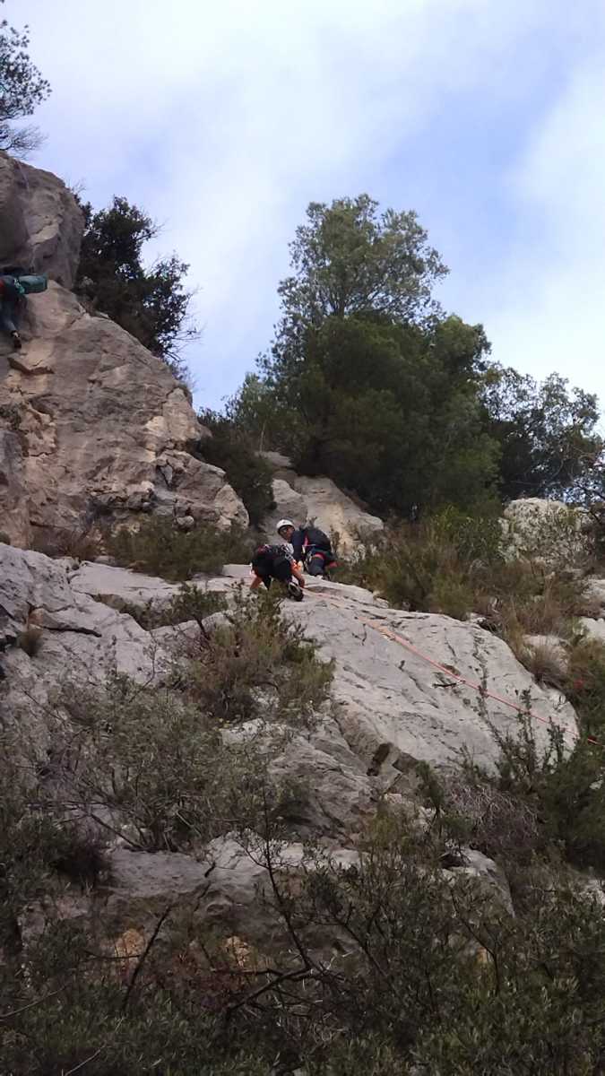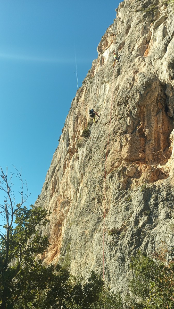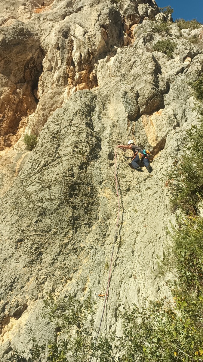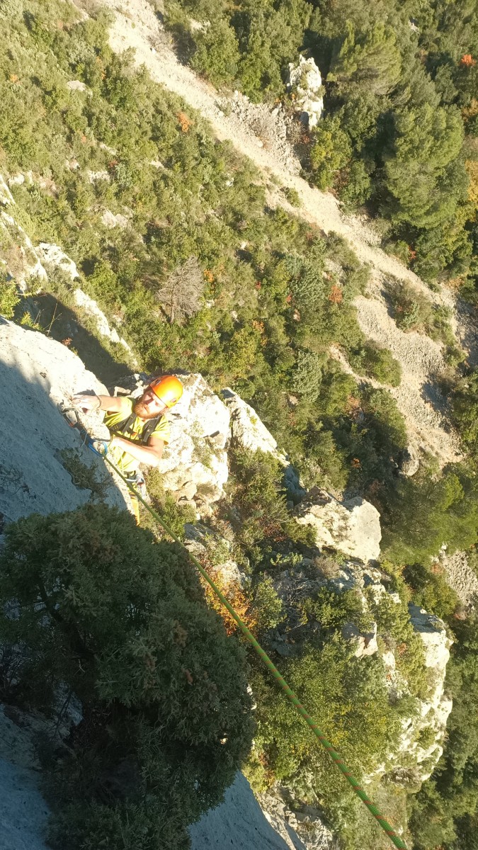 La route plus tard, nous voilà garés dans les gorges d’Ollioules, en face de l’embouchure entre la Reppe et le Destel, bien qu’aucune de ces deux rivières ne soit en eau. On fait les cordées, on s’attribue les voies, on prépare efficacement le matos (même si j’ai oublié un jeu de cordes…) et nous voilà sur la marche d’approche. Les gorges sont à l’ombre mais il ne fait pas trop froid pour une journée de janvier. On arrive très vite au pied de la paroi concernée. Personnellement, je suis un peu déçu parce qu’elle n’a pas trop de gueule. On devine que les quelques voies cheminent pour chercher le caillou parmi des terrasses, des arbutes et des zones peu attirantes. Mais bon, on est là alors allons-y !