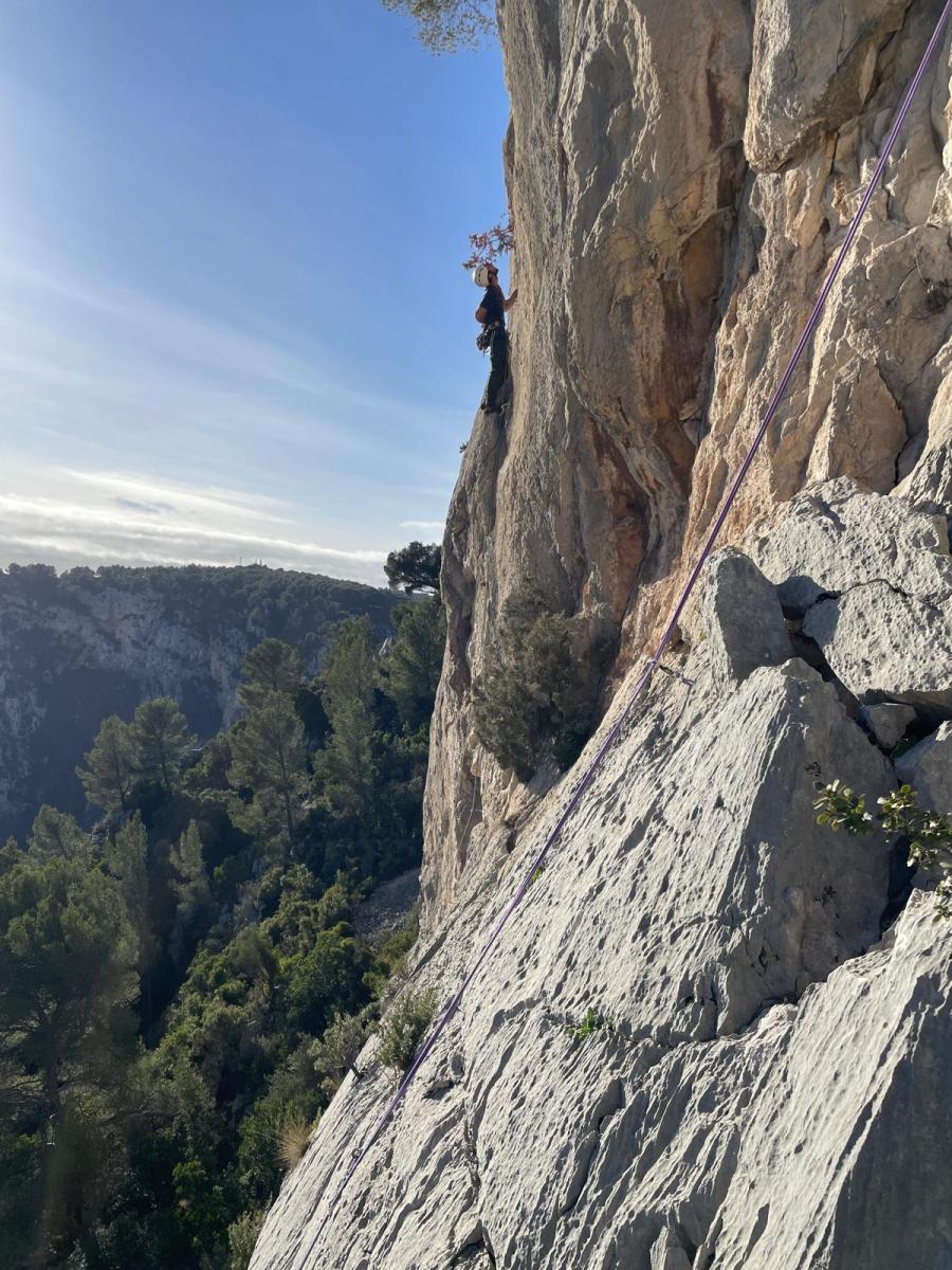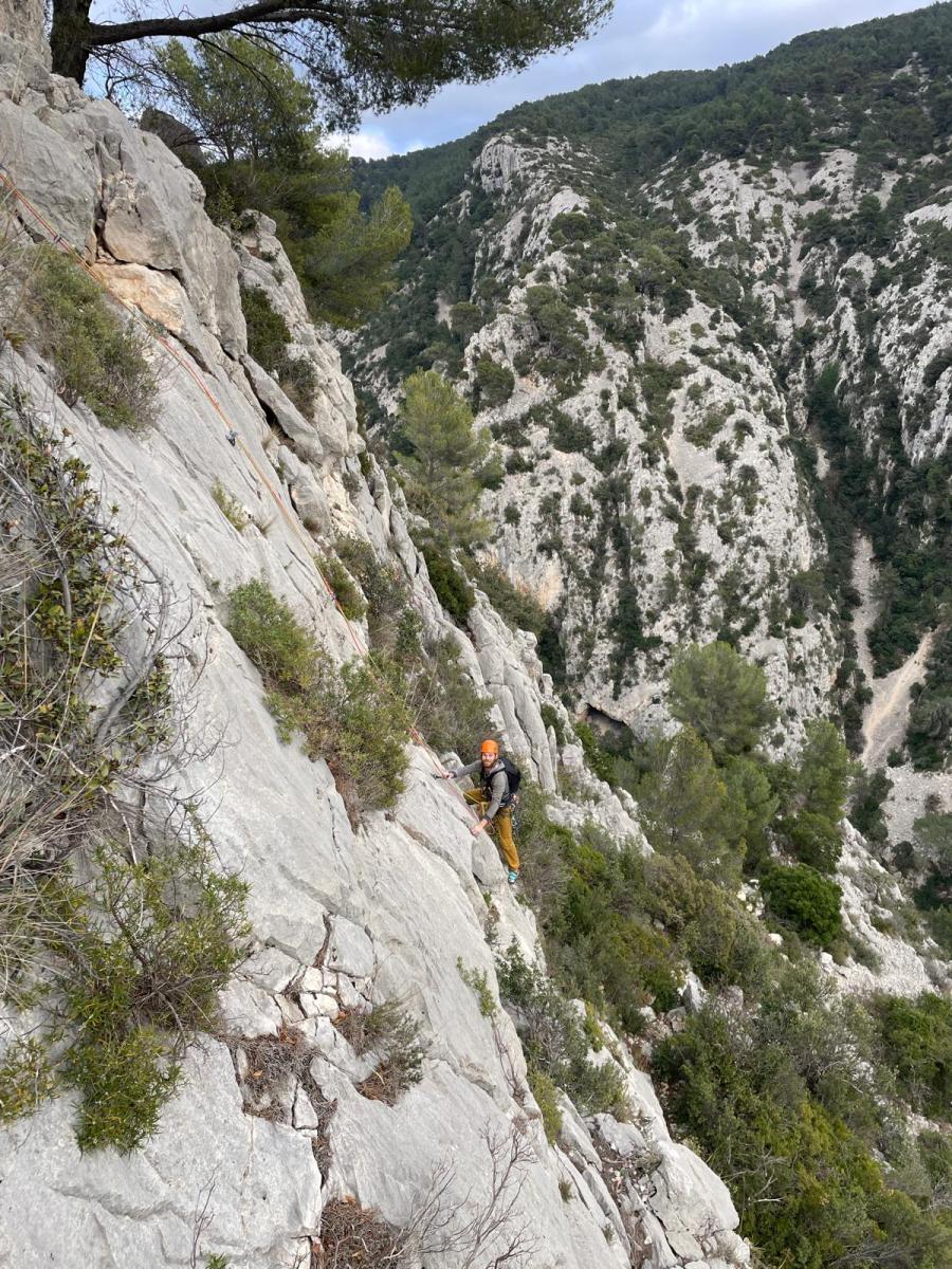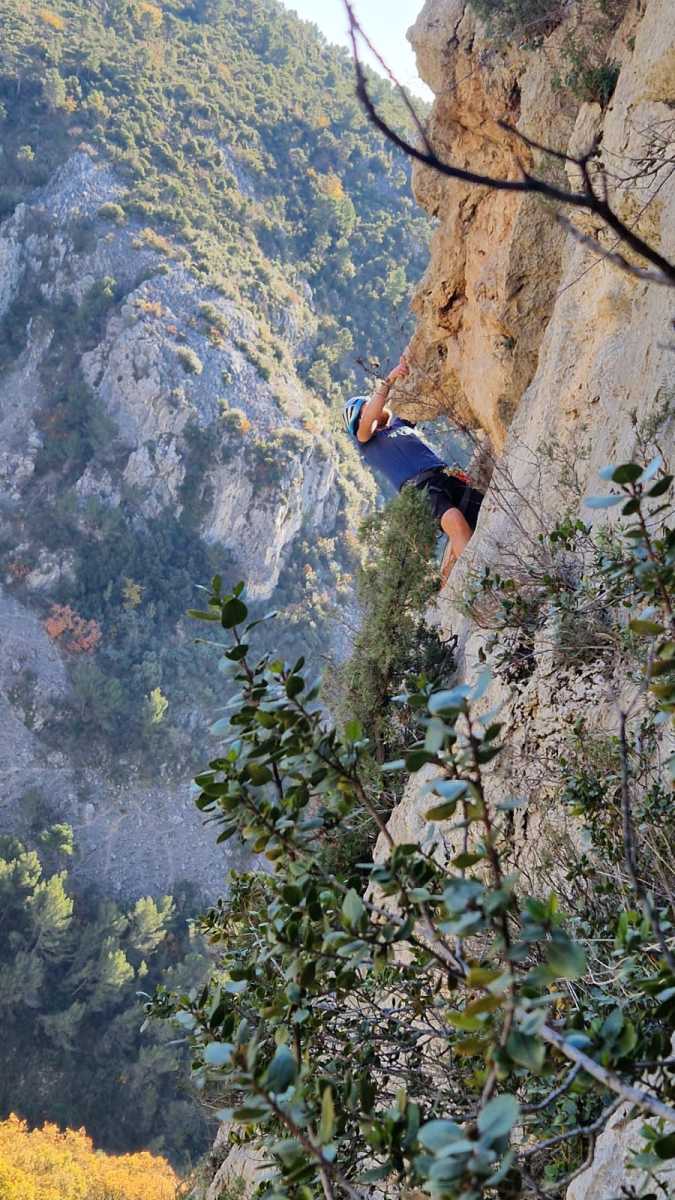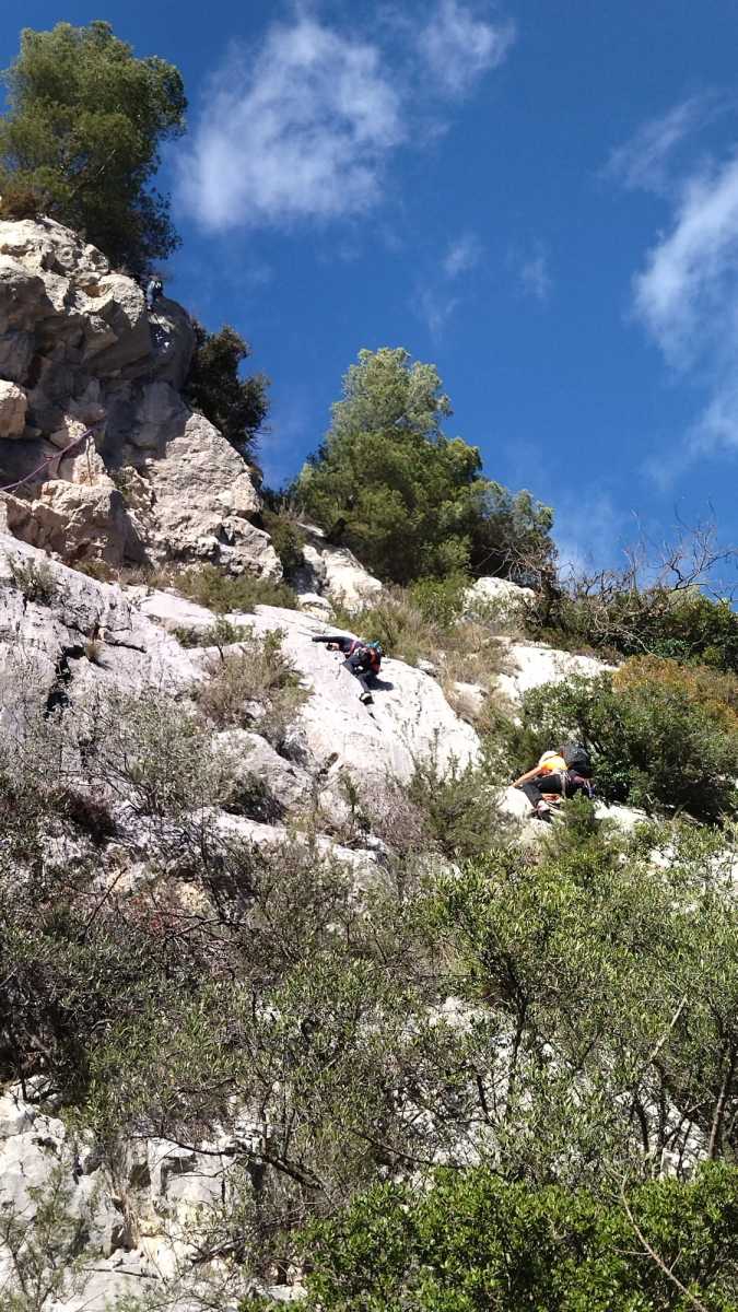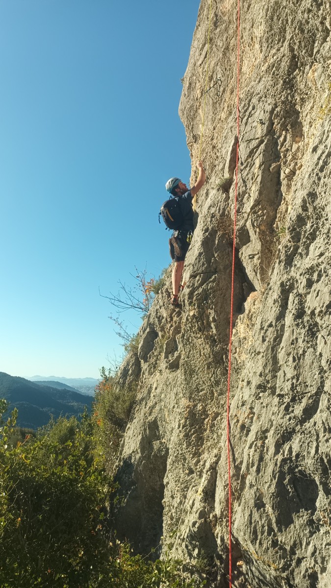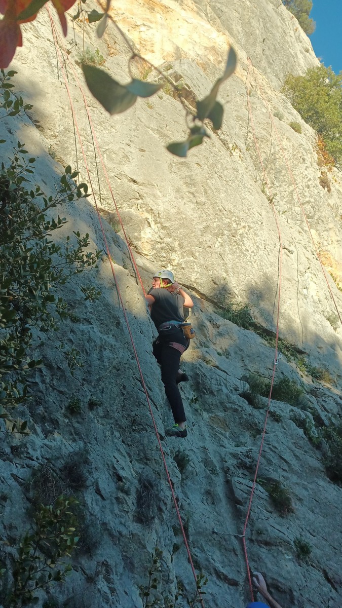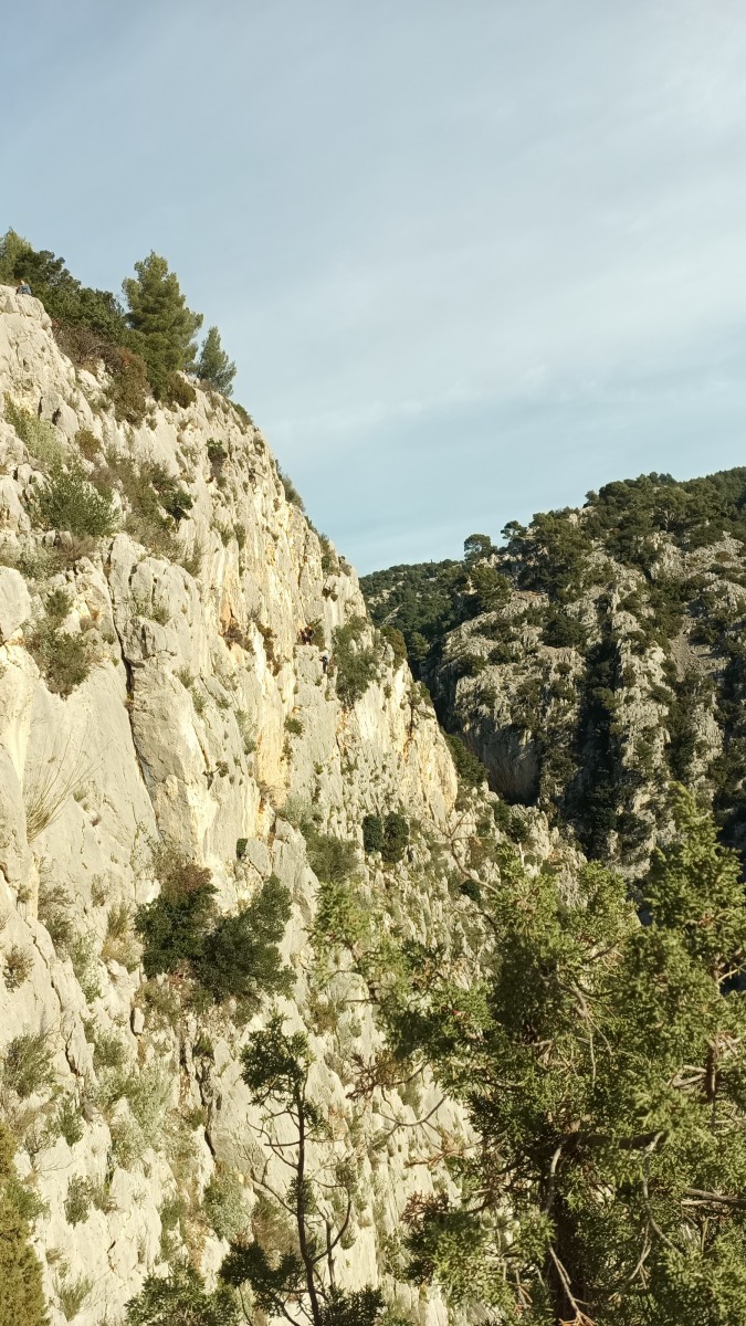 La route plus tard, nous voilà garés dans les gorges d’Ollioules, en face de l’embouchure entre la Reppe et le Destel, bien qu’aucune de ces deux rivières ne soit en eau. On fait les cordées, on s’attribue les voies, on prépare efficacement le matos (même si j’ai oublié un jeu de cordes…) et nous voilà sur la marche d’approche. Les gorges sont à l’ombre mais il ne fait pas trop froid pour une journée de janvier. On arrive très vite au pied de la paroi concernée. Personnellement, je suis un peu déçu parce qu’elle n’a pas trop de gueule. On devine que les quelques voies cheminent pour chercher le caillou parmi des terrasses, des arbutes et des zones peu attirantes. Mais bon, on est là alors allons-y !