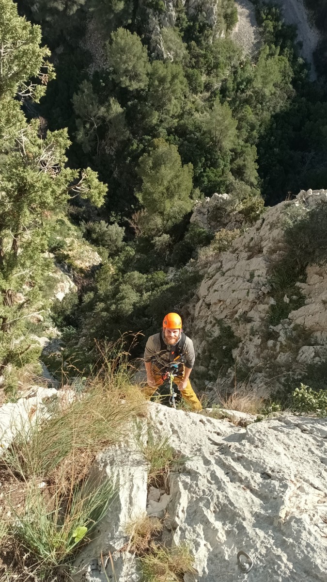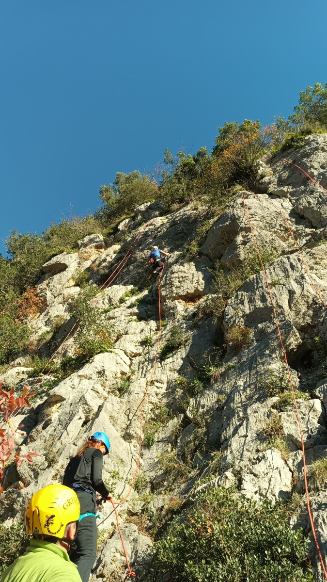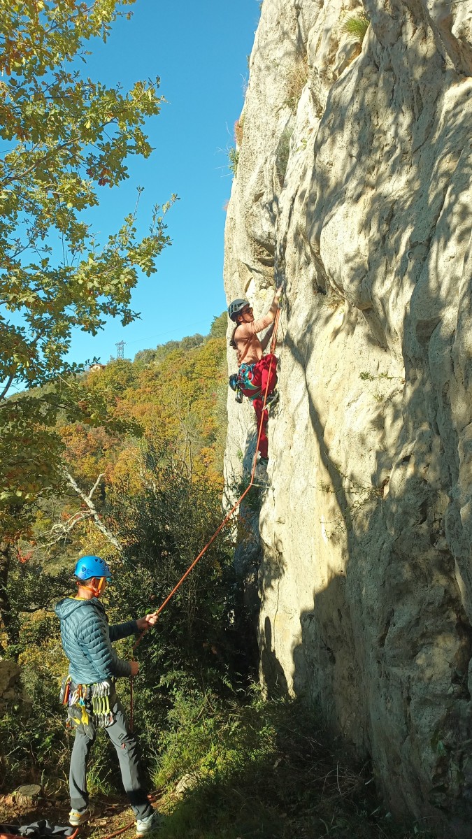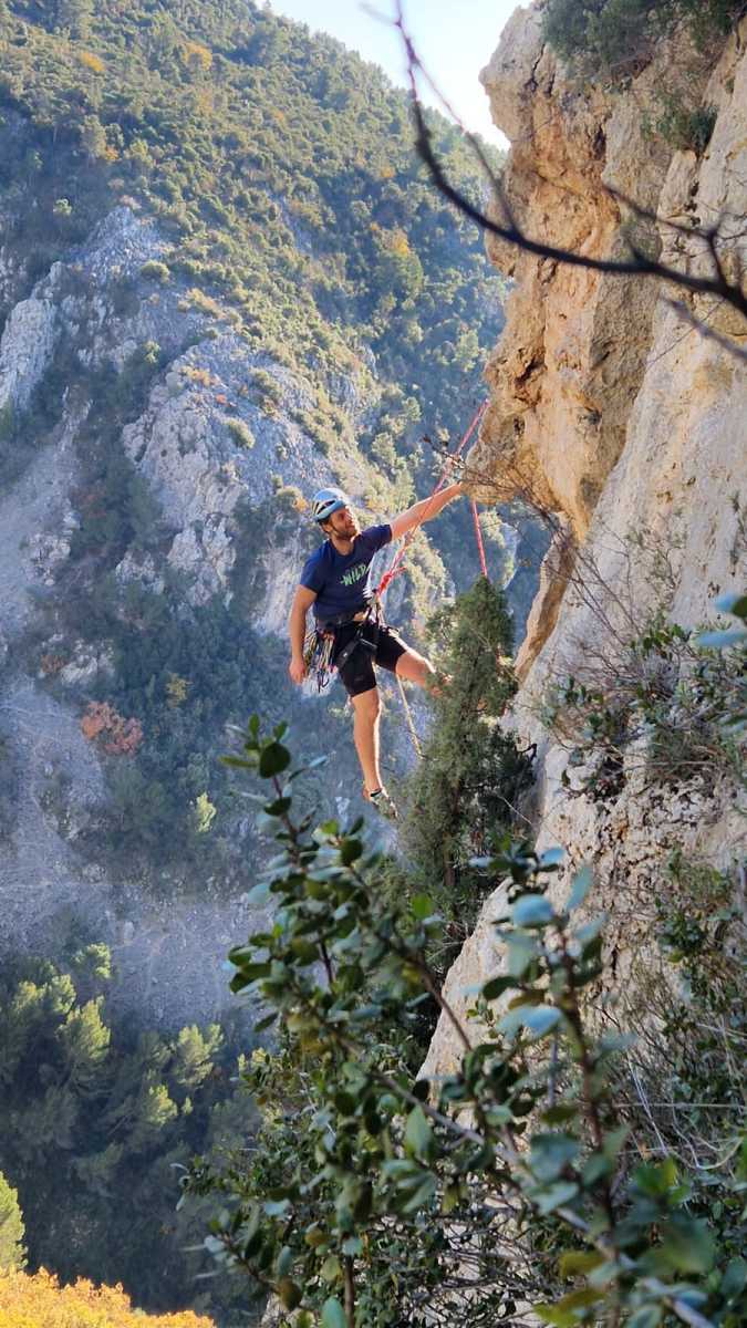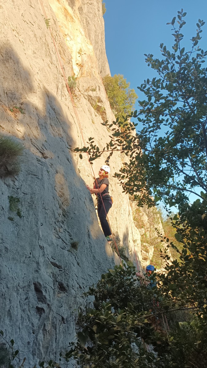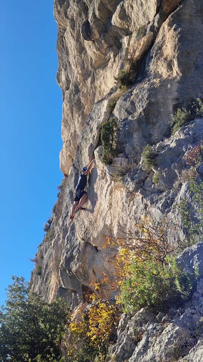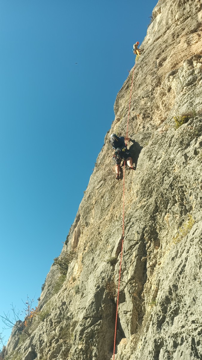 La route plus tard, nous voilà garés dans les gorges d’Ollioules, en face de l’embouchure entre la Reppe et le Destel, bien qu’aucune de ces deux rivières ne soit en eau. On fait les cordées, on s’attribue les voies, on prépare efficacement le matos (même si j’ai oublié un jeu de cordes…) et nous voilà sur la marche d’approche. Les gorges sont à l’ombre mais il ne fait pas trop froid pour une journée de janvier. On arrive très vite au pied de la paroi concernée. Personnellement, je suis un peu déçu parce qu’elle n’a pas trop de gueule. On devine que les quelques voies cheminent pour chercher le caillou parmi des terrasses, des arbutes et des zones peu attirantes. Mais bon, on est là alors allons-y !