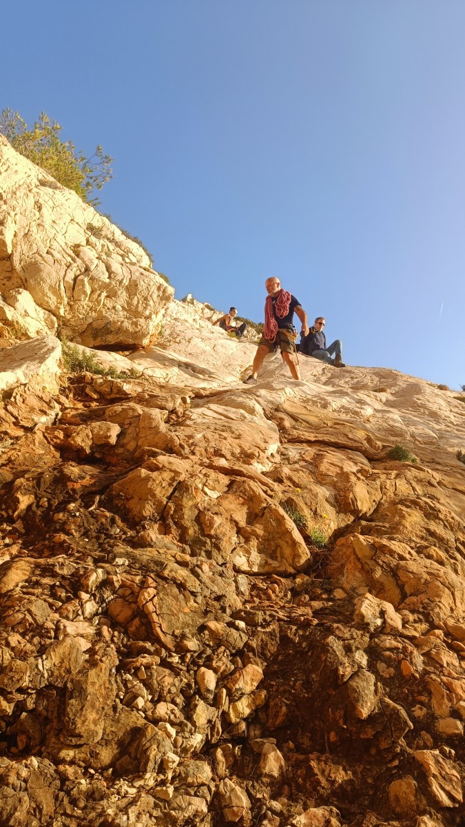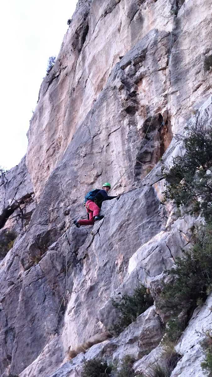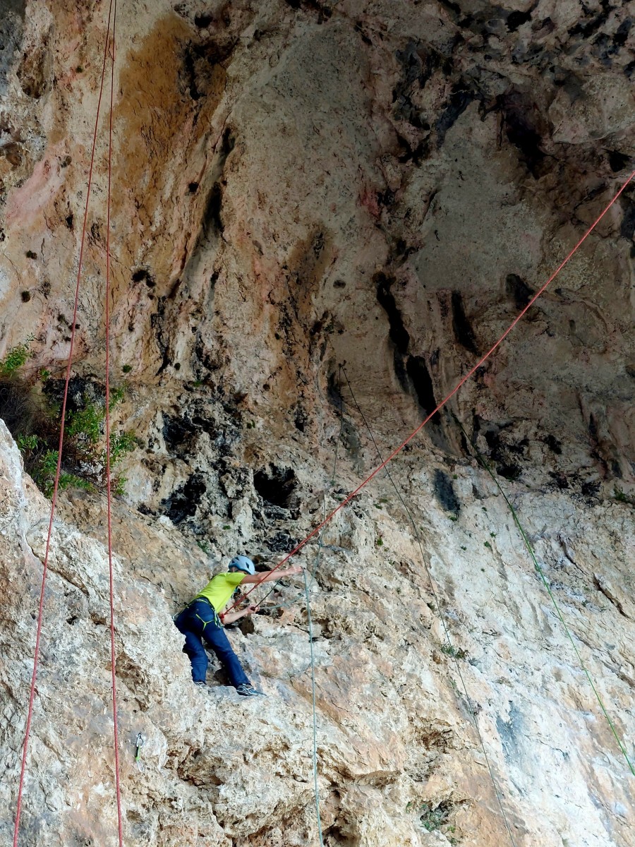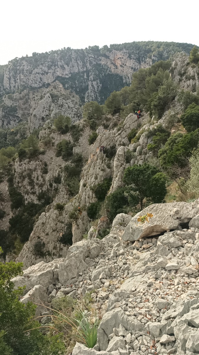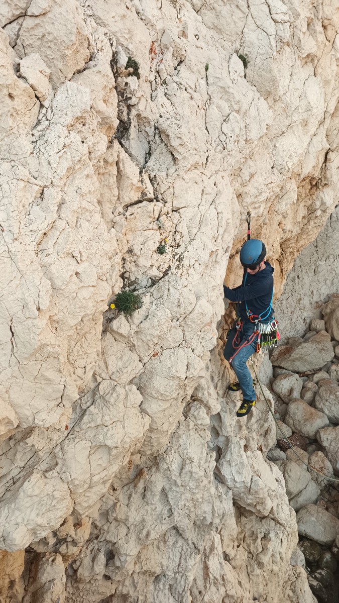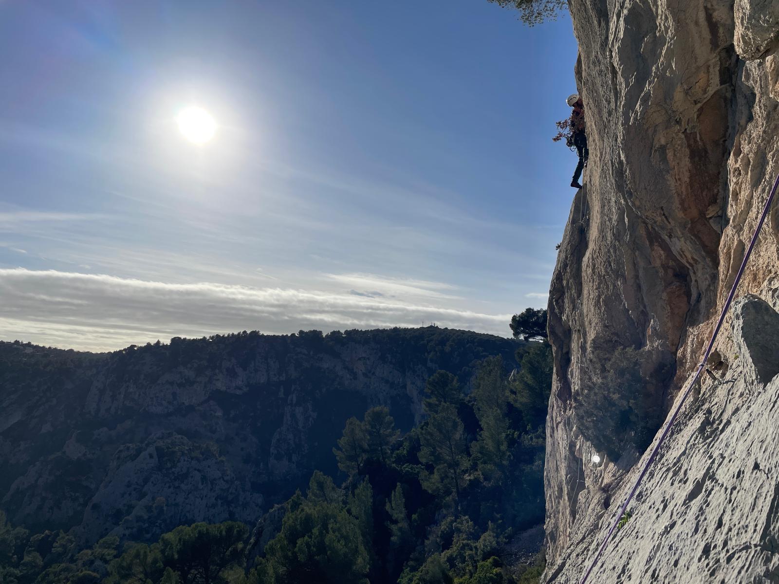 La route plus tard, nous voilà garés dans les gorges d’Ollioules, en face de l’embouchure entre la Reppe et le Destel, bien qu’aucune de ces deux rivières ne soit en eau. On fait les cordées, on s’attribue les voies, on prépare efficacement le matos (même si j’ai oublié un jeu de cordes…) et nous voilà sur la marche d’approche. Les gorges sont à l’ombre mais il ne fait pas trop froid pour une journée de janvier. On arrive très vite au pied de la paroi concernée. Personnellement, je suis un peu déçu parce qu’elle n’a pas trop de gueule. On devine que les quelques voies cheminent pour chercher le caillou parmi des terrasses, des arbutes et des zones peu attirantes. Mais bon, on est là alors allons-y !