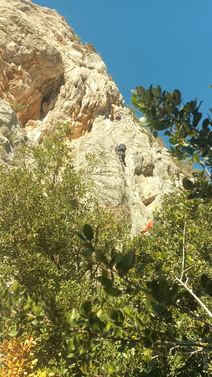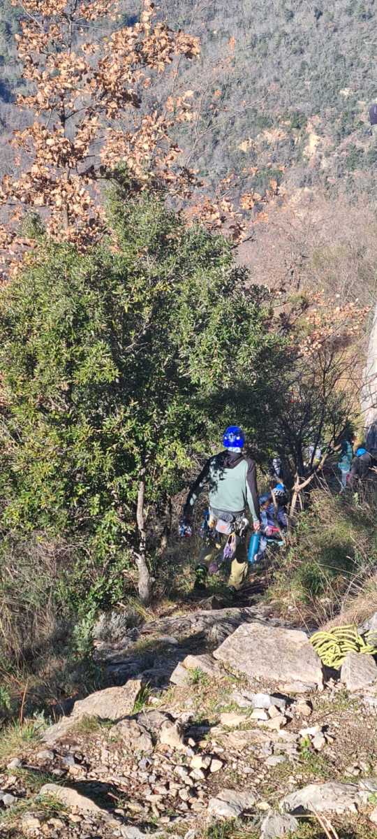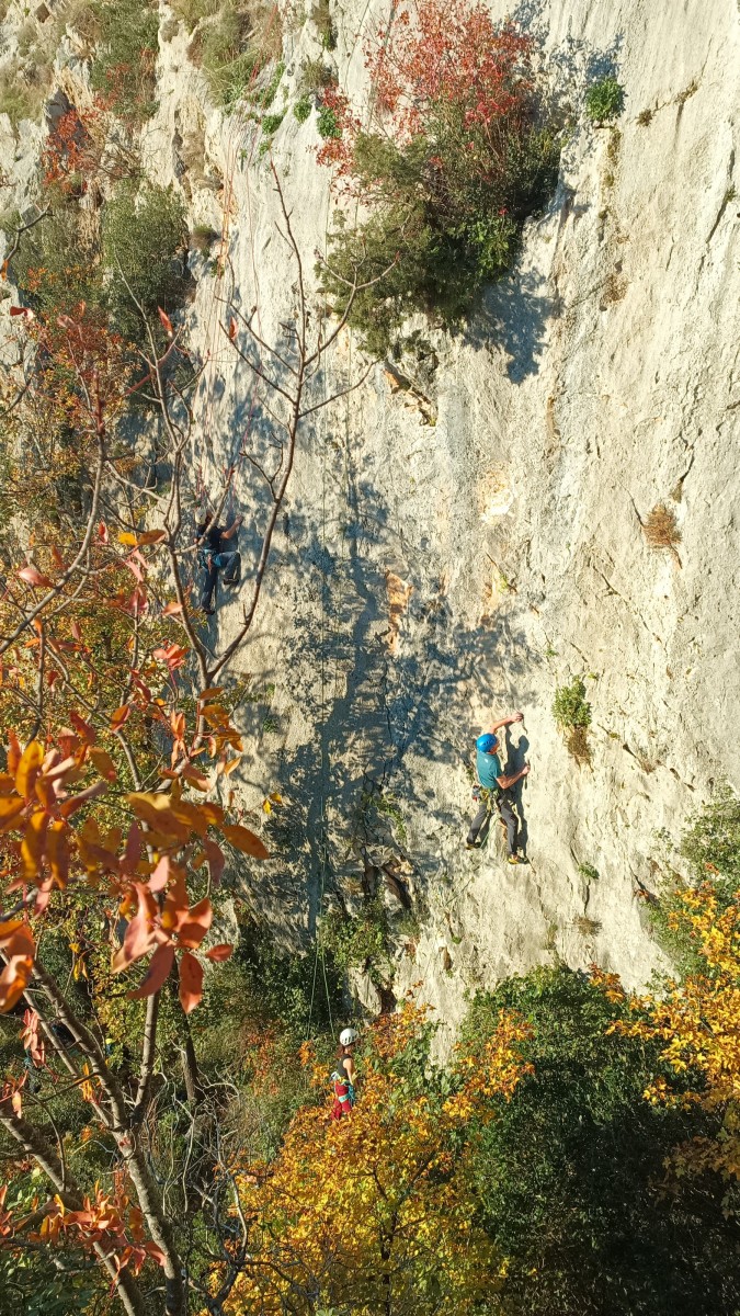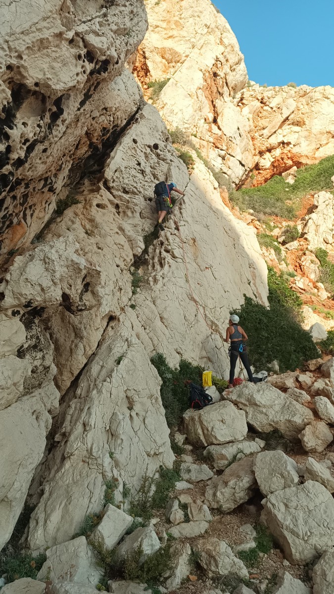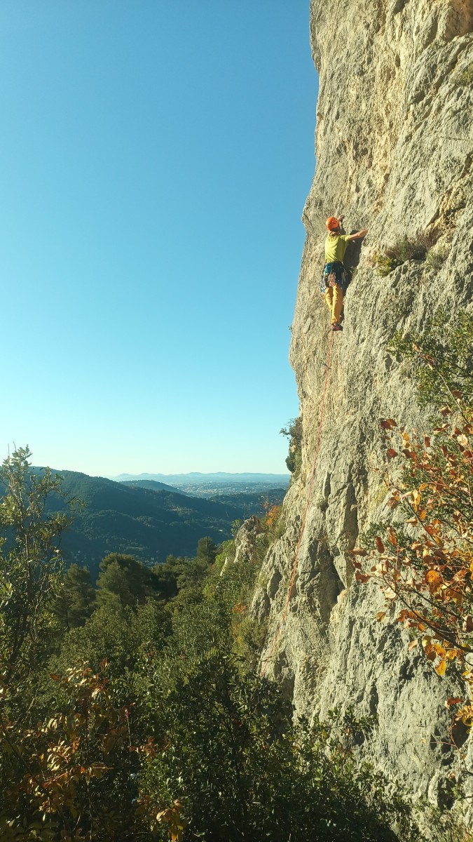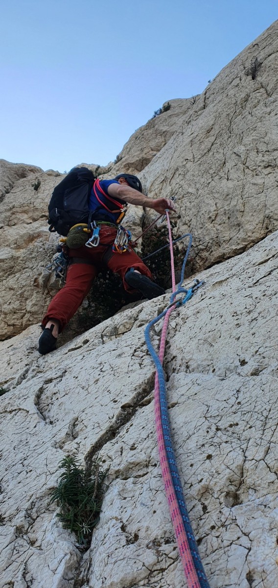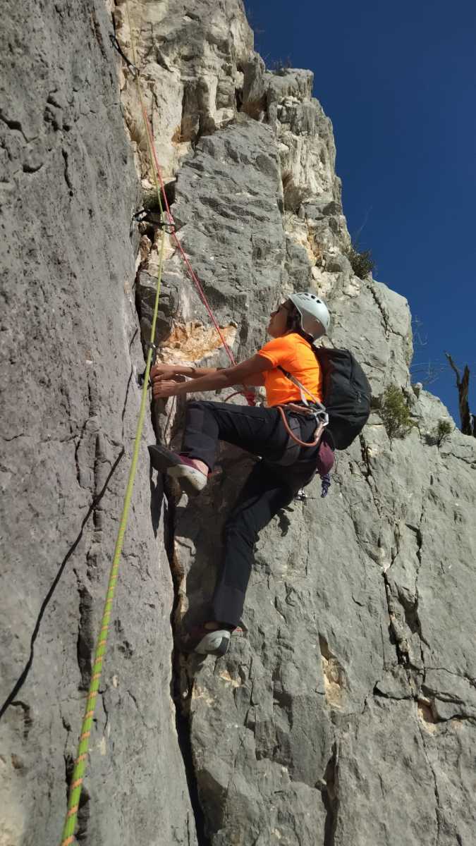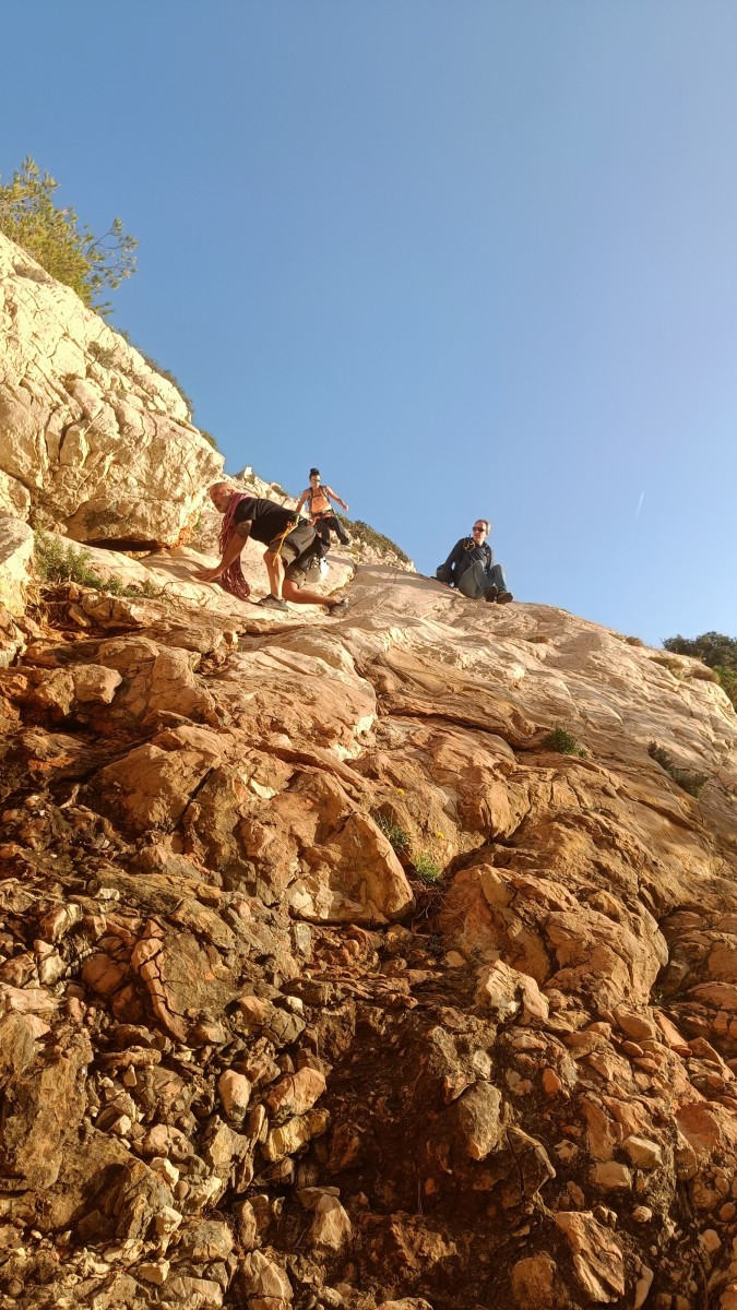 La route plus tard, nous voilà garés dans les gorges d’Ollioules, en face de l’embouchure entre la Reppe et le Destel, bien qu’aucune de ces deux rivières ne soit en eau. On fait les cordées, on s’attribue les voies, on prépare efficacement le matos (même si j’ai oublié un jeu de cordes…) et nous voilà sur la marche d’approche. Les gorges sont à l’ombre mais il ne fait pas trop froid pour une journée de janvier. On arrive très vite au pied de la paroi concernée. Personnellement, je suis un peu déçu parce qu’elle n’a pas trop de gueule. On devine que les quelques voies cheminent pour chercher le caillou parmi des terrasses, des arbutes et des zones peu attirantes. Mais bon, on est là alors allons-y !