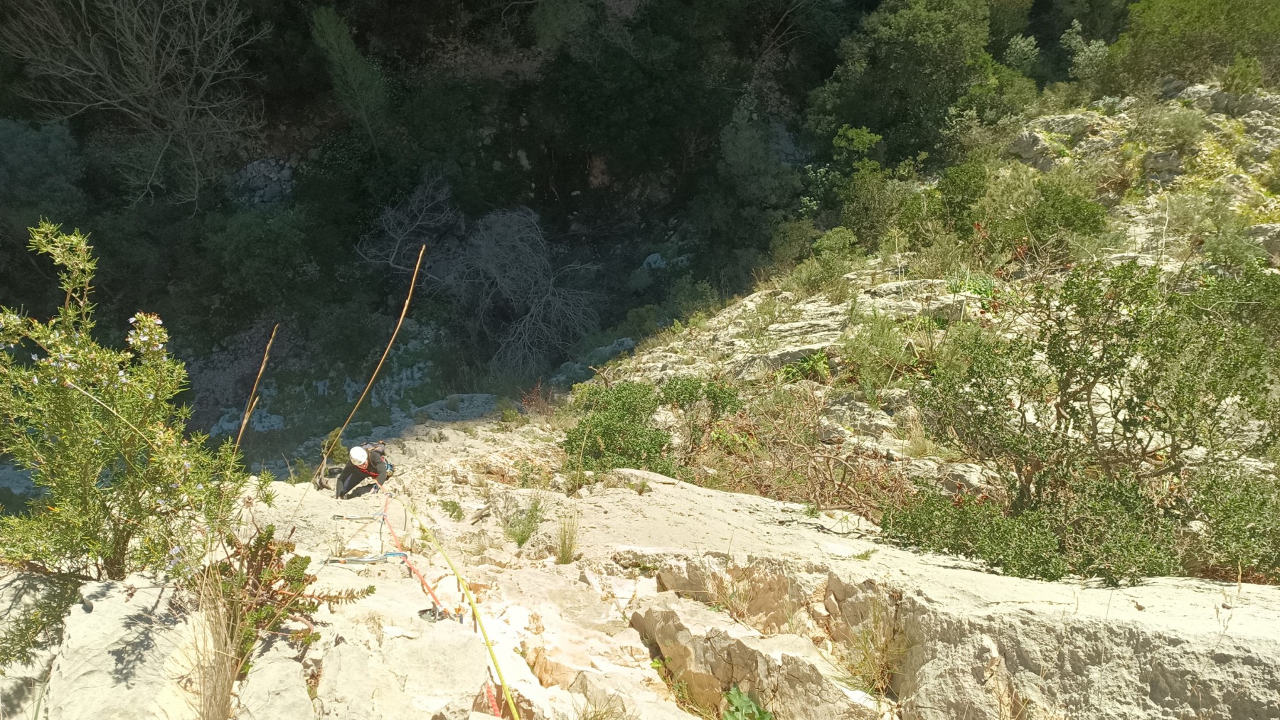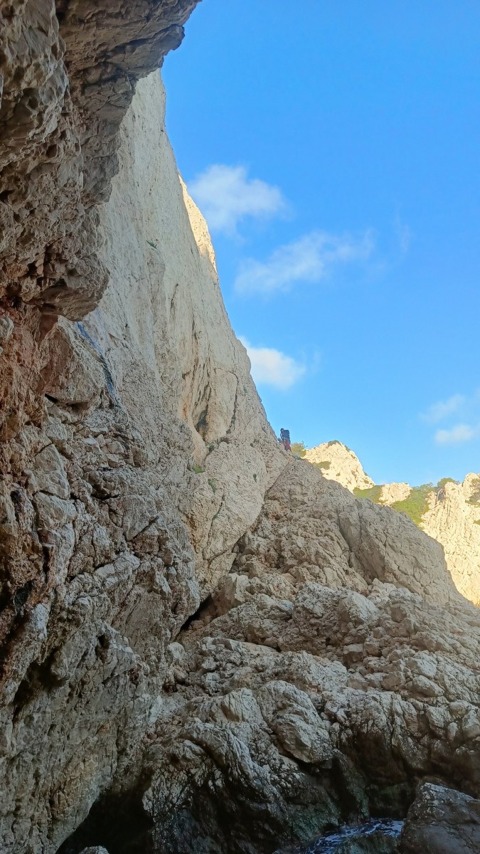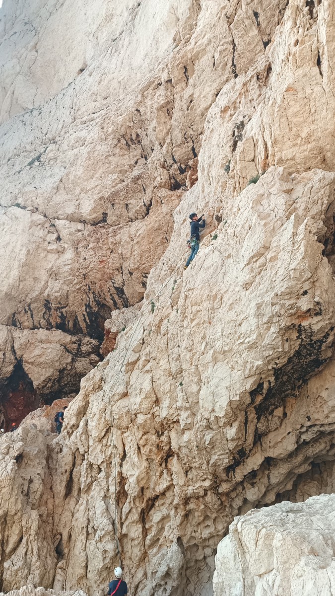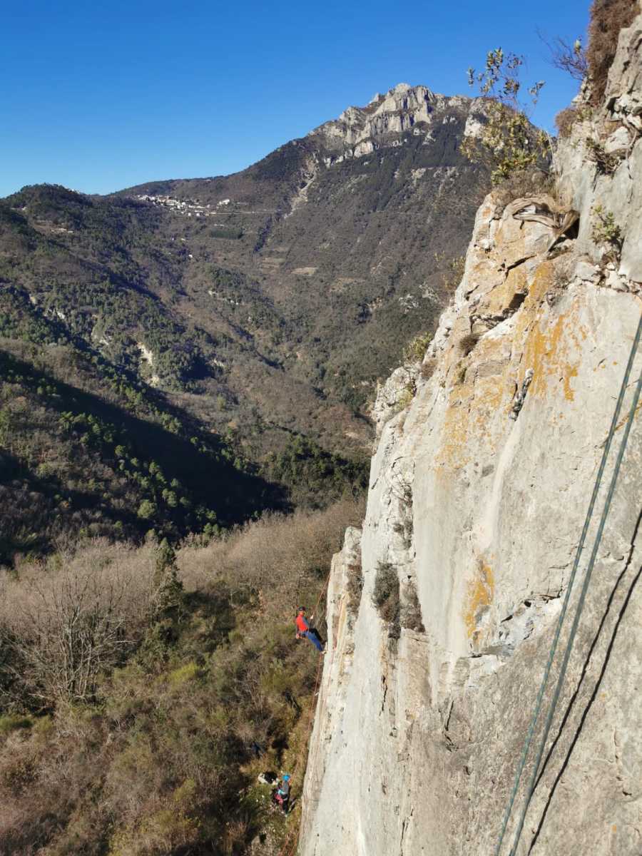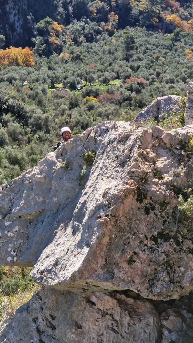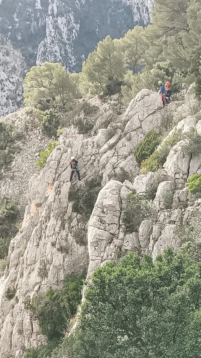 La route plus tard, nous voilà garés dans les gorges d’Ollioules, en face de l’embouchure entre la Reppe et le Destel, bien qu’aucune de ces deux rivières ne soit en eau. On fait les cordées, on s’attribue les voies, on prépare efficacement le matos (même si j’ai oublié un jeu de cordes…) et nous voilà sur la marche d’approche. Les gorges sont à l’ombre mais il ne fait pas trop froid pour une journée de janvier. On arrive très vite au pied de la paroi concernée. Personnellement, je suis un peu déçu parce qu’elle n’a pas trop de gueule. On devine que les quelques voies cheminent pour chercher le caillou parmi des terrasses, des arbutes et des zones peu attirantes. Mais bon, on est là alors allons-y !