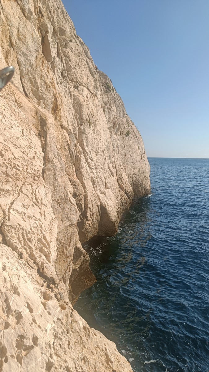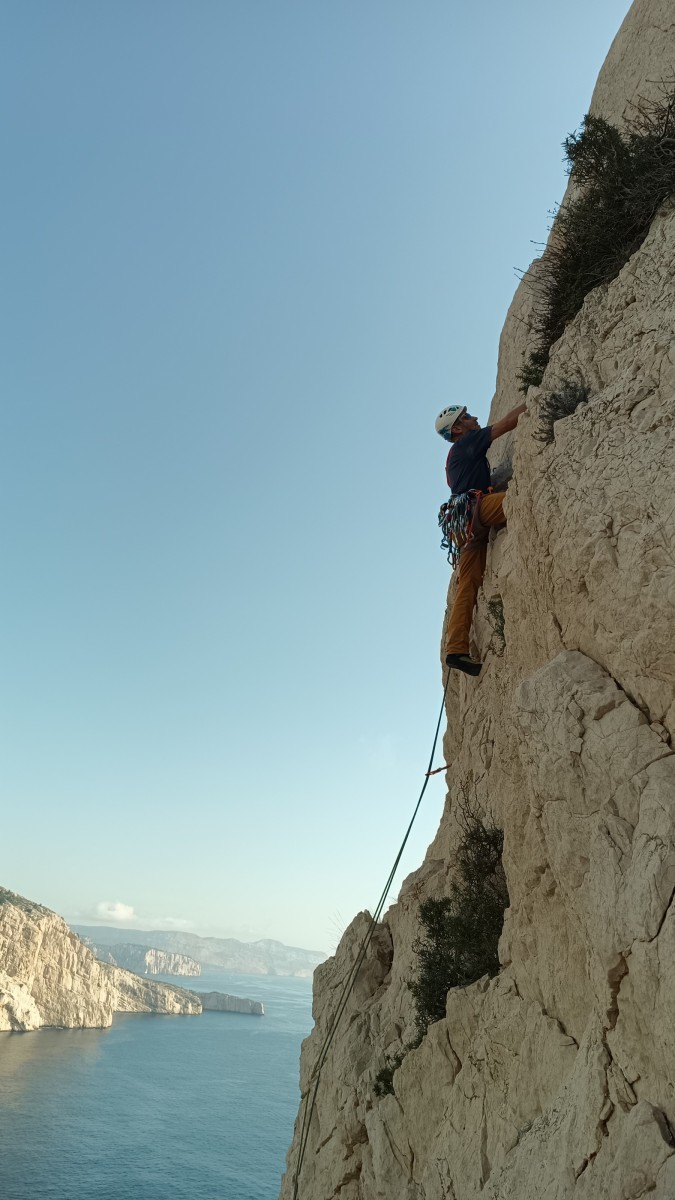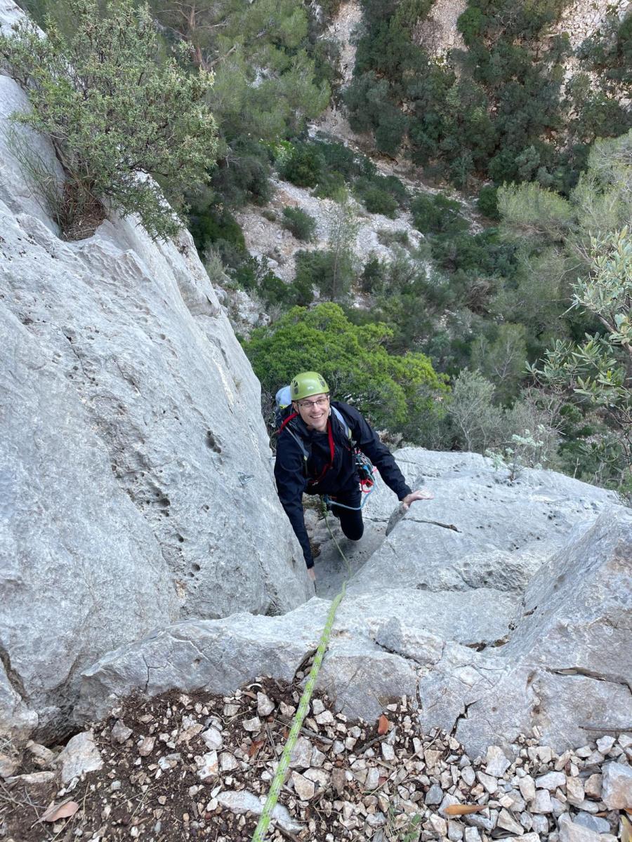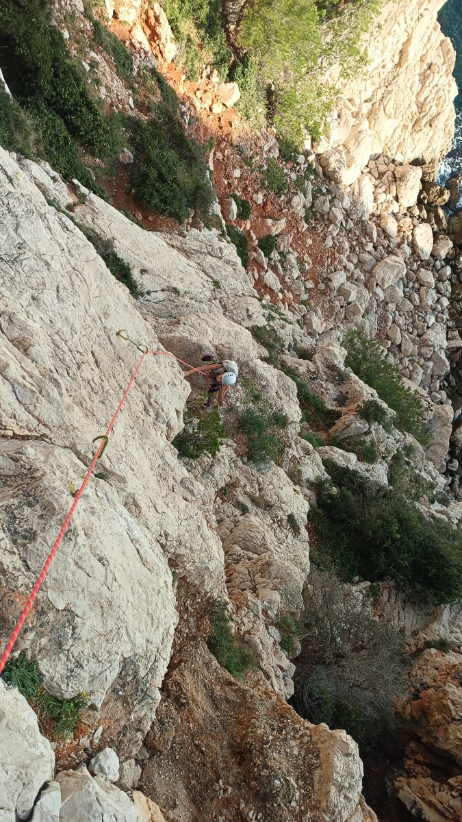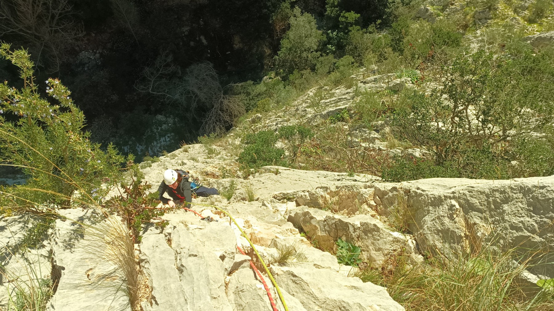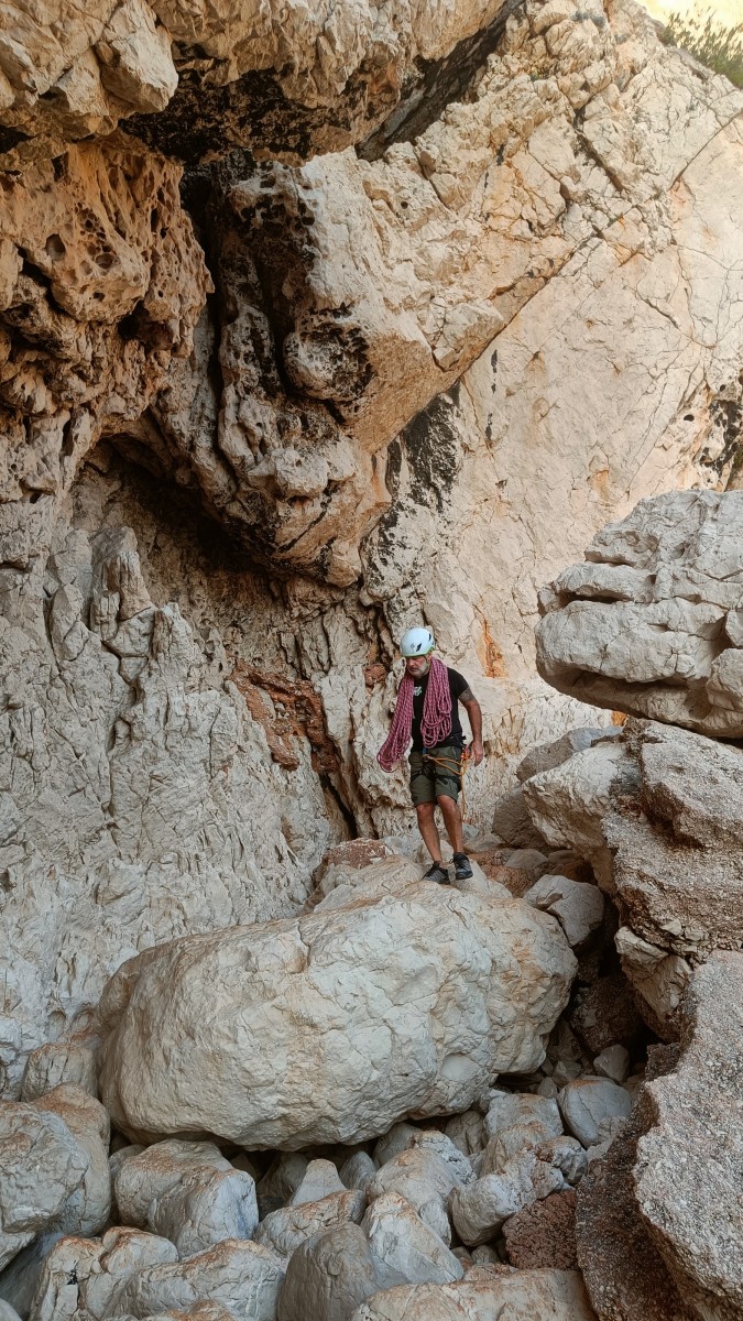 La route plus tard, nous voilà garés dans les gorges d’Ollioules, en face de l’embouchure entre la Reppe et le Destel, bien qu’aucune de ces deux rivières ne soit en eau. On fait les cordées, on s’attribue les voies, on prépare efficacement le matos (même si j’ai oublié un jeu de cordes…) et nous voilà sur la marche d’approche. Les gorges sont à l’ombre mais il ne fait pas trop froid pour une journée de janvier. On arrive très vite au pied de la paroi concernée. Personnellement, je suis un peu déçu parce qu’elle n’a pas trop de gueule. On devine que les quelques voies cheminent pour chercher le caillou parmi des terrasses, des arbutes et des zones peu attirantes. Mais bon, on est là alors allons-y !