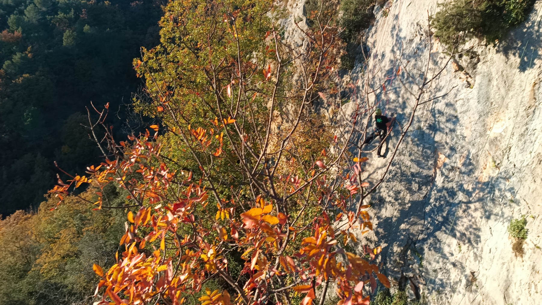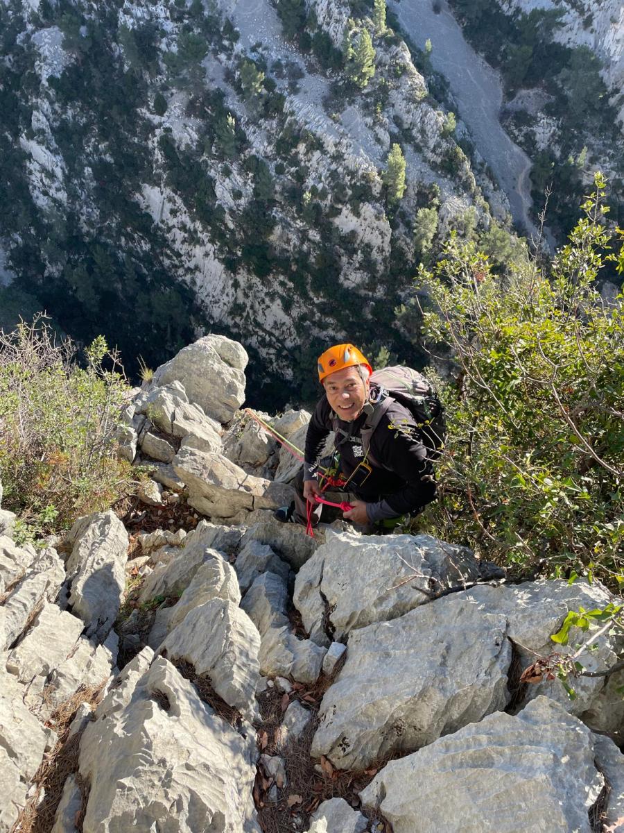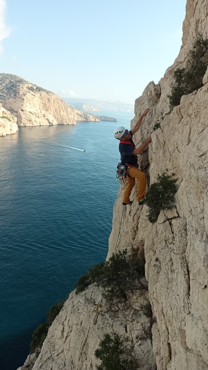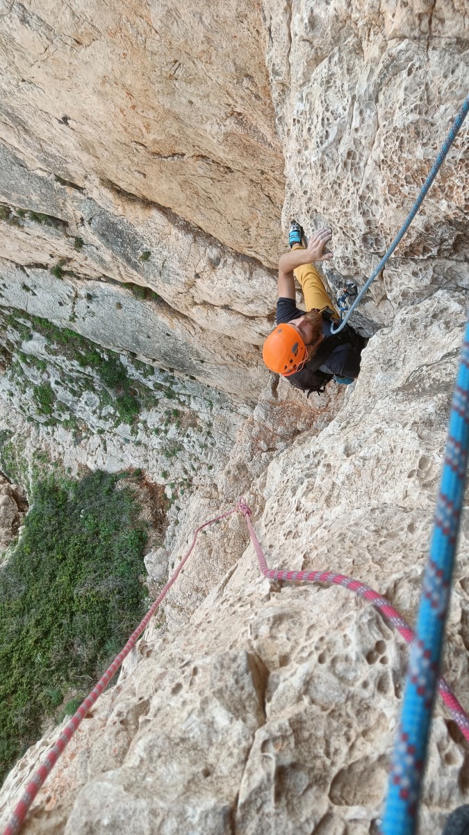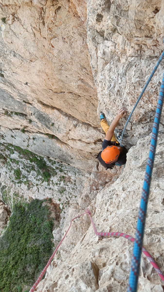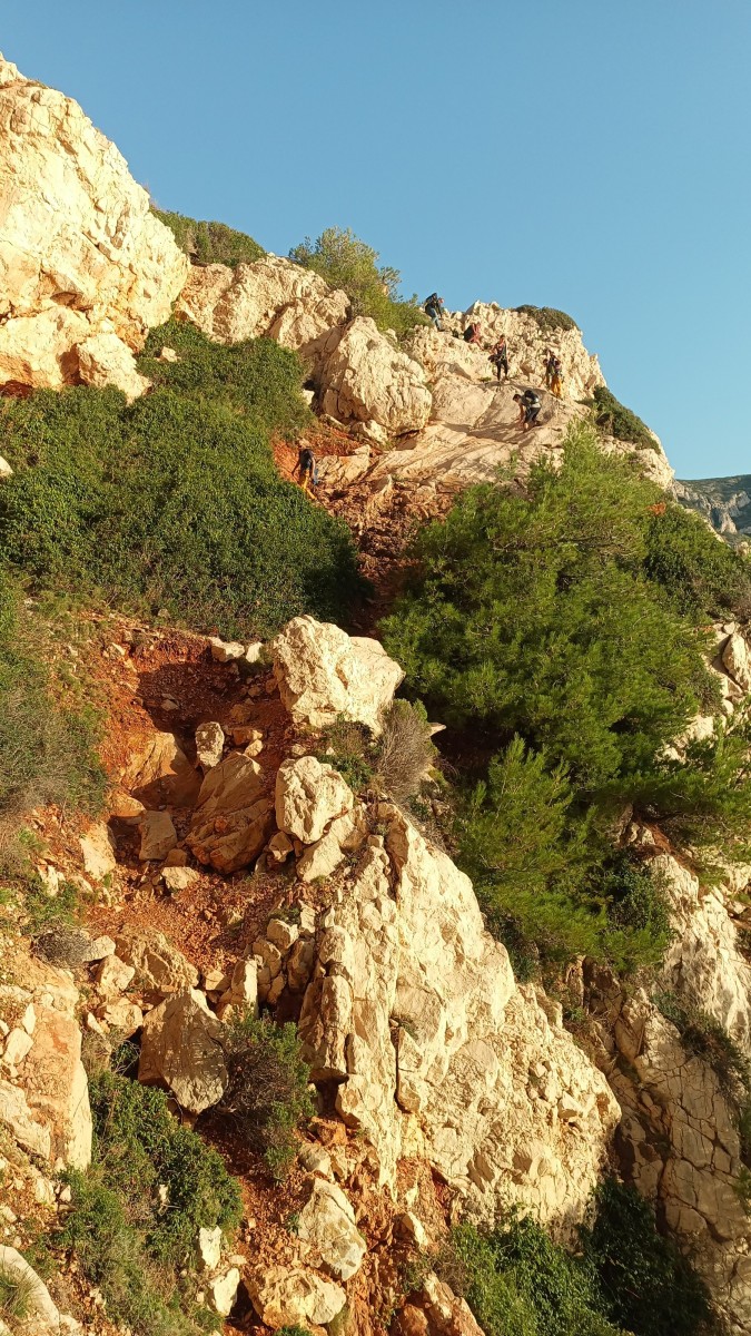 La route plus tard, nous voilà garés dans les gorges d’Ollioules, en face de l’embouchure entre la Reppe et le Destel, bien qu’aucune de ces deux rivières ne soit en eau. On fait les cordées, on s’attribue les voies, on prépare efficacement le matos (même si j’ai oublié un jeu de cordes…) et nous voilà sur la marche d’approche. Les gorges sont à l’ombre mais il ne fait pas trop froid pour une journée de janvier. On arrive très vite au pied de la paroi concernée. Personnellement, je suis un peu déçu parce qu’elle n’a pas trop de gueule. On devine que les quelques voies cheminent pour chercher le caillou parmi des terrasses, des arbutes et des zones peu attirantes. Mais bon, on est là alors allons-y !