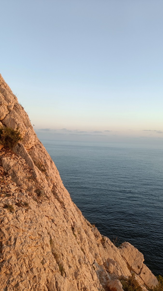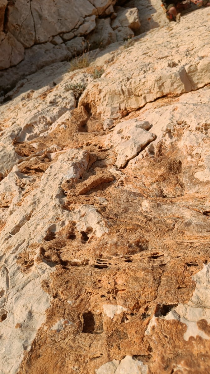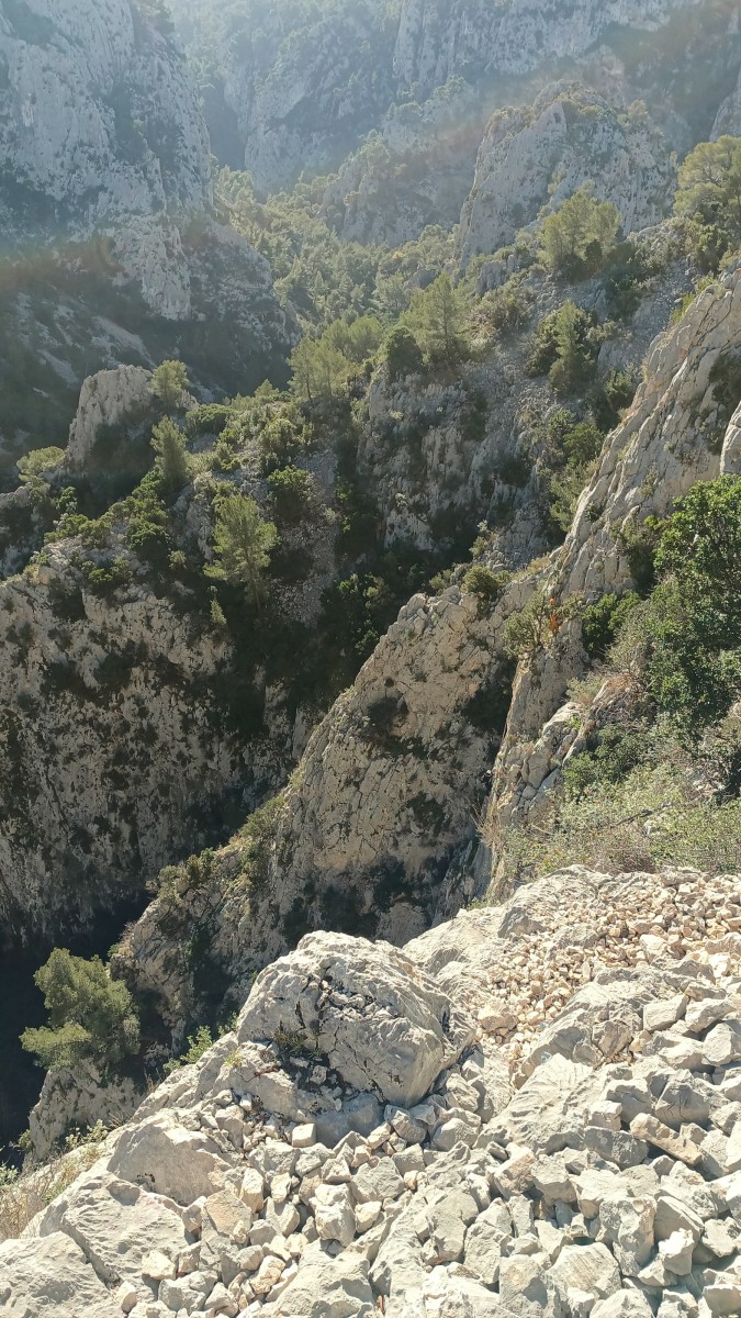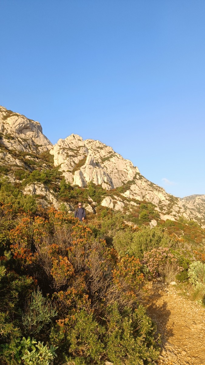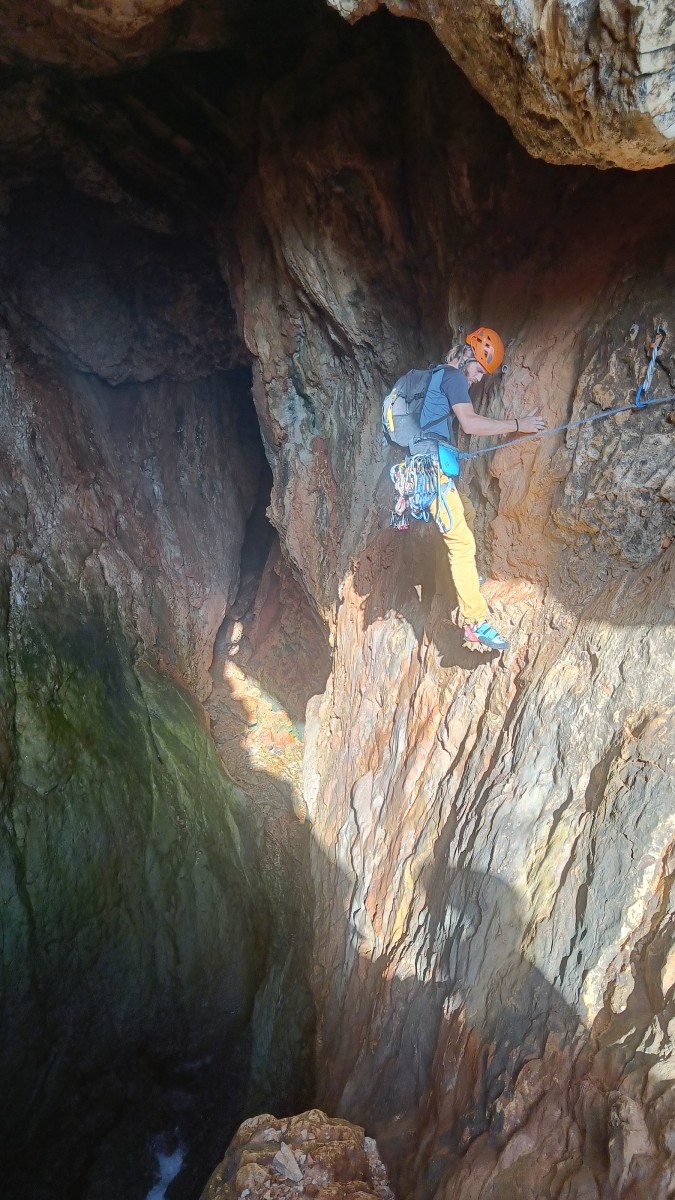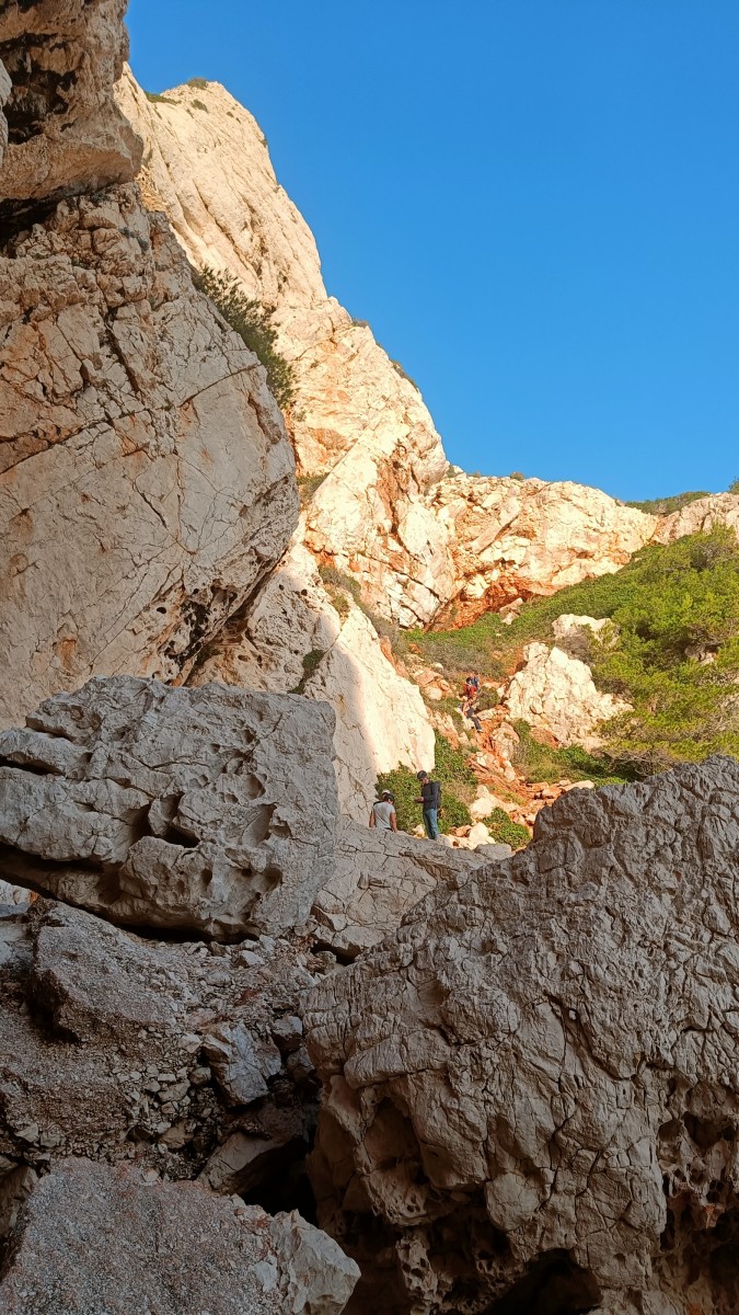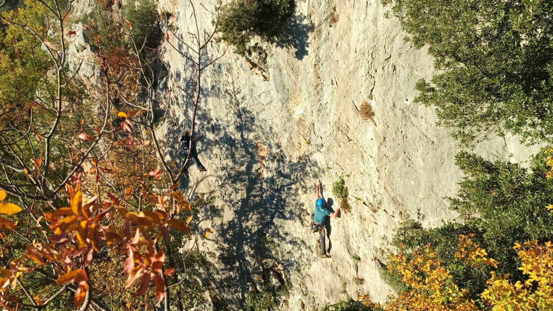 La route plus tard, nous voilà garés dans les gorges d’Ollioules, en face de l’embouchure entre la Reppe et le Destel, bien qu’aucune de ces deux rivières ne soit en eau. On fait les cordées, on s’attribue les voies, on prépare efficacement le matos (même si j’ai oublié un jeu de cordes…) et nous voilà sur la marche d’approche. Les gorges sont à l’ombre mais il ne fait pas trop froid pour une journée de janvier. On arrive très vite au pied de la paroi concernée. Personnellement, je suis un peu déçu parce qu’elle n’a pas trop de gueule. On devine que les quelques voies cheminent pour chercher le caillou parmi des terrasses, des arbutes et des zones peu attirantes. Mais bon, on est là alors allons-y !